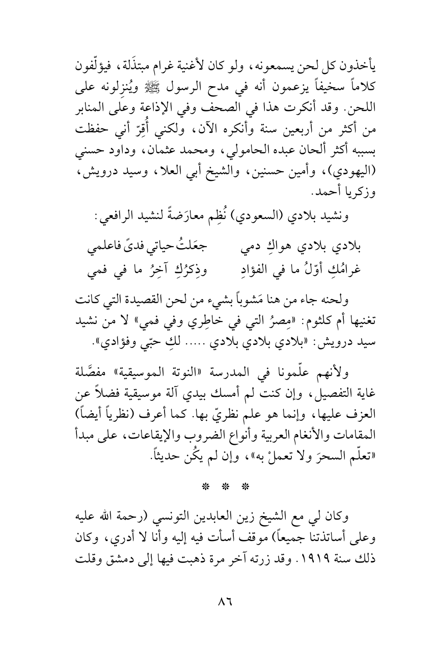 يأخذون كل لحن يسمعونه، ولو كان لأغنية غرام مبتذَلة، فيؤلّفون كلاماً سخيفاً يزعمون أنه في مدح الرسول - صلى الله عليه وسلم - ويُنزِلونه على اللحن. وقد أنكرت هذا في الصحف وفي الإذاعة وعلى المنابر من أكثر من أربعين سنة وأنكره الآن، ولكني أُقِرّ أني حفظت بسببه أكثر ألحان عبده الحامولي، ومحمد عثمان، وداود حسني (اليهودي)، وأمين حسنين، والشيخ أبي العلا، وسيد درويش، وزكريا أحمد.