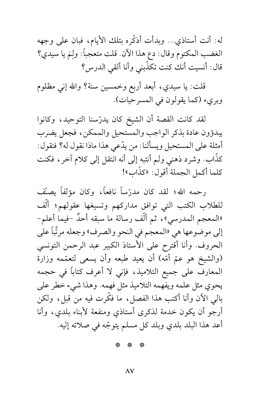 رحمه الله؛ لقد كان مدرّساً نافعاً، وكان مؤلفاً يصنّف للطلاب الكتب التي توافق مداركهم وتسيغها عقولهم؛ ألّف «المعجم المدرسي»، ثم ألّف رسالة ما سبقه أحدٌ -فيما أعلم- إلى موضوعها هي «المعجم في النحو والصرف» وجعله مرتَّباً على الحروف. وأنا أقترح على الأستاذ الكبير عبد الرحمن التونسي (والشيخ هو عمّ أمّه) أن يعيد طبعه وأن يسعى لتعمّمه وزارة المعارف على جميع التلاميذ، فإني لا أعرف كتاباً في حجمه يحوي مثل علمه ويفهمه التلاميذ مثل فهمه. وهذا شيء خطر على بالي الآن وأنا أكتب هذا الفصل، ما فكّرت فيه من قبل، ولكن أرجو أن يكون خدمة لذكرى أستاذي ومنفعة لأبناء بلدي، وأنا أعد هذا البلد بلدي وبلد كل مسلم يتوجّه في صلاته إليه.