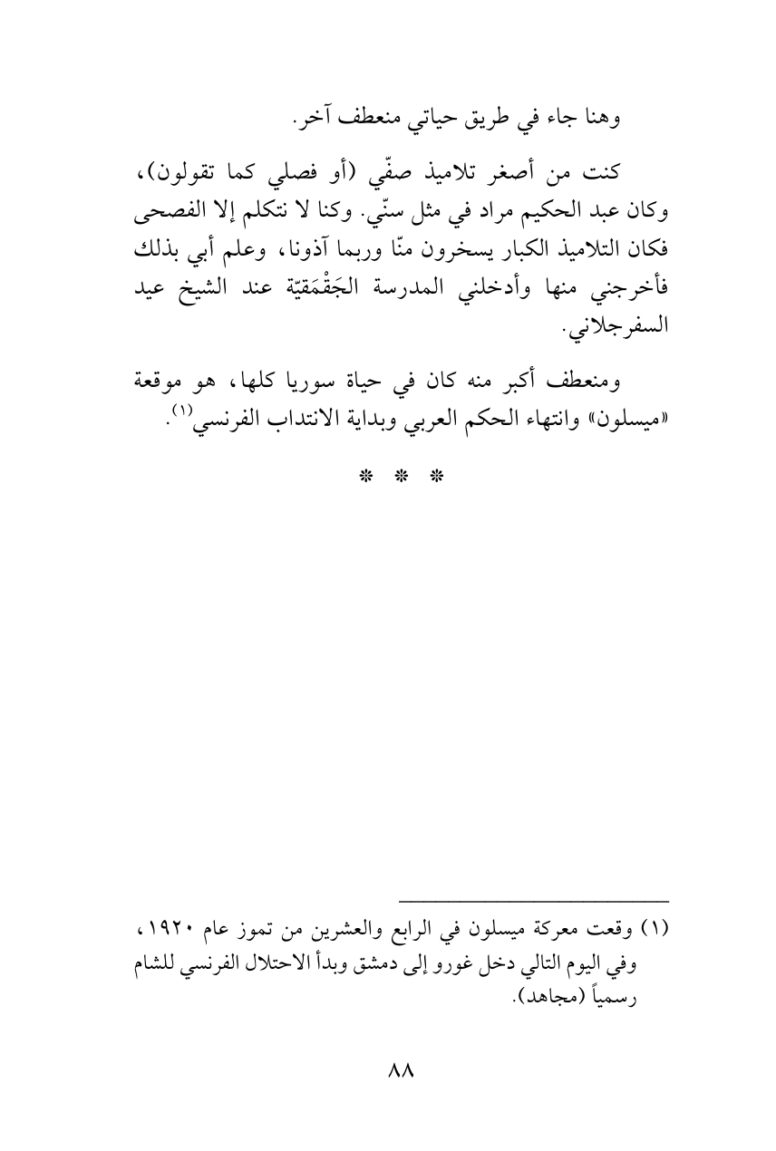 ومنعطف أكبر منه كان في حياة سوريا كلها، هو موقعة «ميسلون» وانتهاء الحكم العربي وبداية الانتداب الفرنسي (¬1).