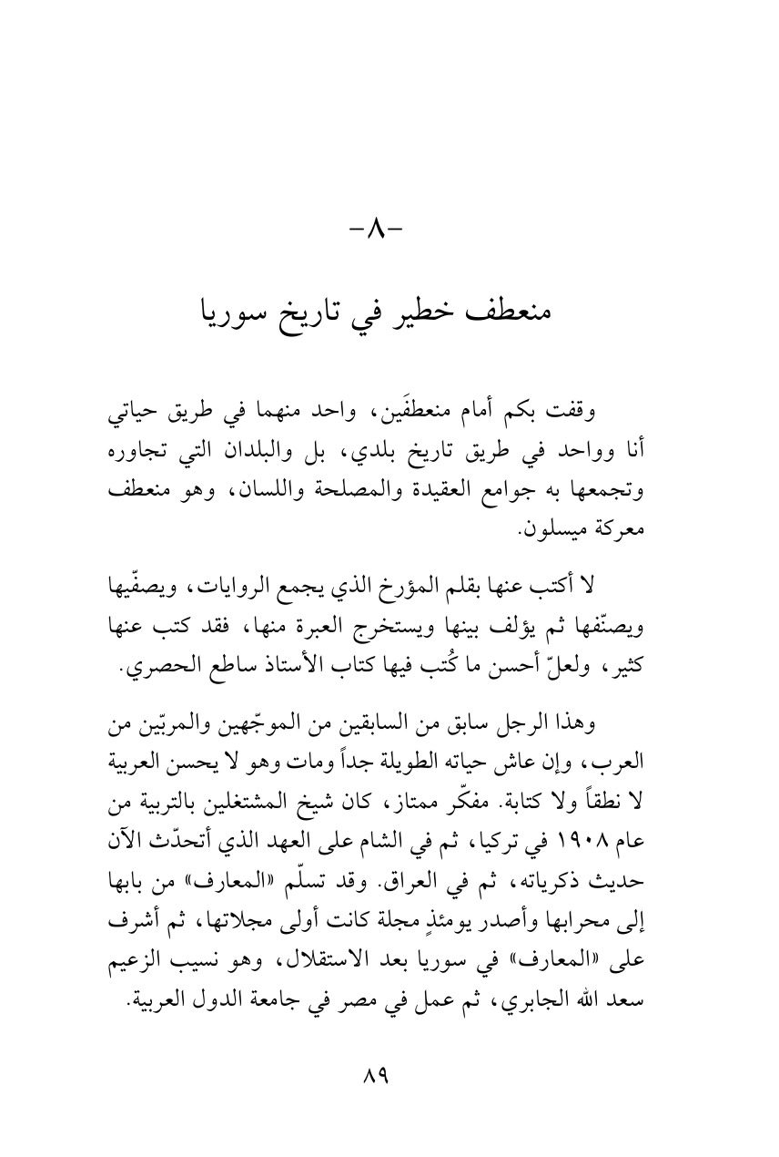 وقفت بكم أمام منعطفَين، واحد منهما في طريق حياتي أنا وواحد في طريق تاريخ بلدي، بل والبلدان التي تجاوره وتجمعها به جوامع العقيدة والمصلحة واللسان، وهو منعطف معركة ميسلون.
