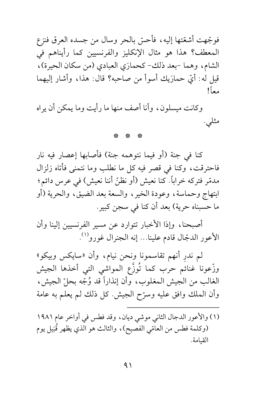 أصبحنا، وإذا الأخبار تتوارد عن مسير الفرنسيين إلينا وأن الأعور الدجّال قادم علينا ... إنه الجنرال غورو (¬1).