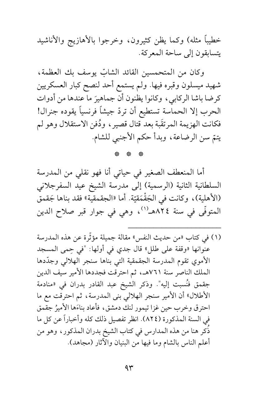 أما المنعطف الصغير في حياتي أنا فهو نقلي من المدرسة السلطانية الثانية (الرسمية) إلى مدرسة الشيخ عيد السفرجلاني (الأهلية)، وكانت في الجَقْمَقيّة. أما «الجقمقية» فقد بناها جَقمق المتوفّى في سنة 824هـ (¬1)، وهي في جوار قبر صلاح الدين