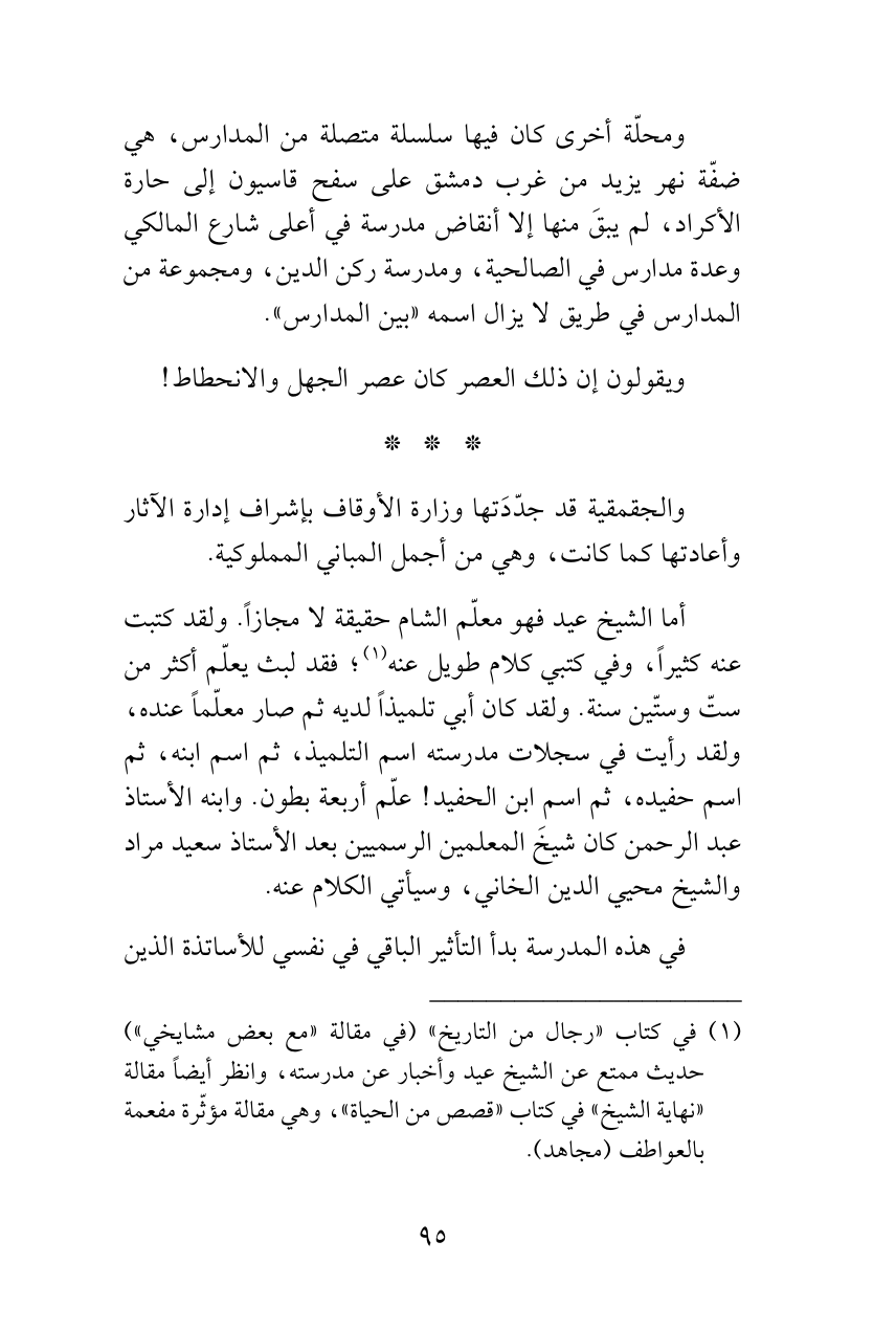 (¬1) في كتاب «رجال من التاريخ» (في مقالة «مع بعض مشايخي») حديث ممتع عن الشيخ عيد وأخبار عن مدرسته، وانظر أيضاً مقالة «نهاية الشيخ» في كتاب «قصص من الحياة»، وهي مقالة مؤثّرة مفعمة بالعواطف (مجاهد).