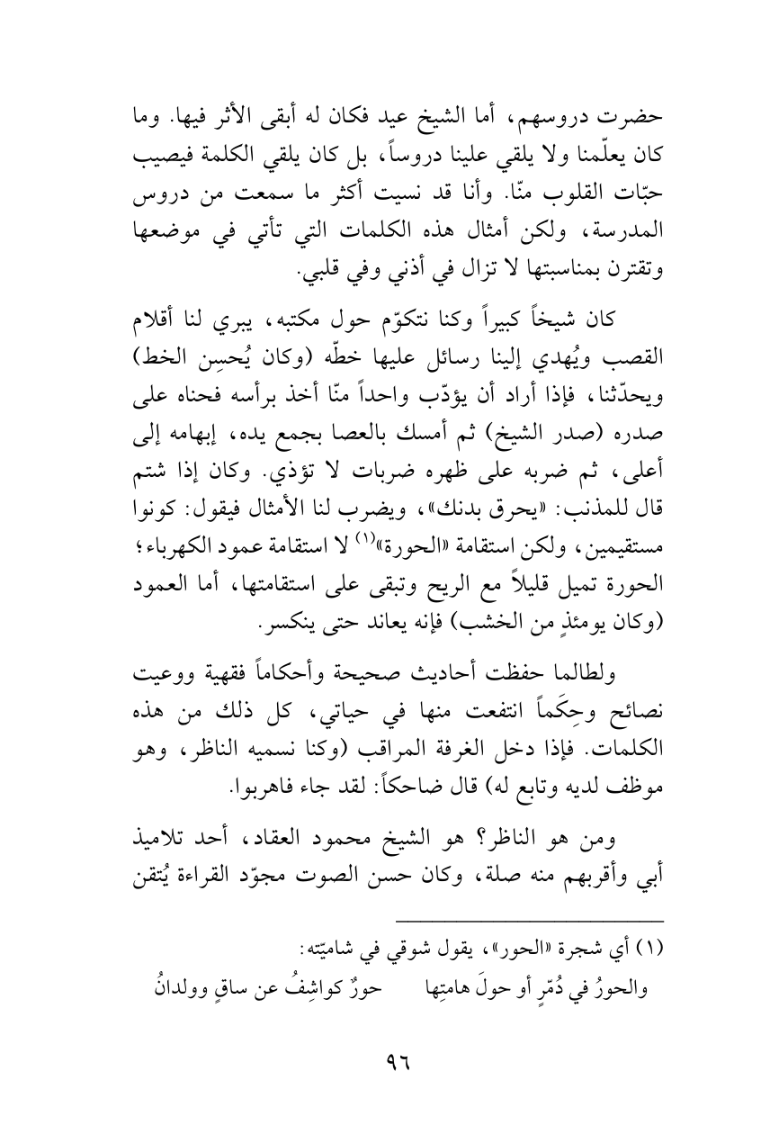 كان شيخاً كبيراً وكنا نتكوّم حول مكتبه، يبري لنا أقلام القصب ويُهدي إلينا رسائل عليها خطّه (وكان يُحسِن الخط) ويحدّثنا، فإذا أراد أن يؤدّب واحداً منّا أخذ برأسه فحناه على صدره (صدر الشيخ) ثم أمسك بالعصا بجمع يده، إبهامه إلى أعلى، ثم ضربه على ظهره ضربات لا تؤذي. وكان إذا شتم قال للمذنب: «يحرق بدنك»، ويضرب لنا الأمثال فيقول: كونوا مستقيمين، ولكن استقامة «الحورة» (¬1) لا استقامة عمود الكهرباء؛ الحورة تميل قليلاً مع الريح وتبقى على استقامتها، أما العمود (وكان يومئذٍ من الخشب) فإنه يعاند حتى ينكسر.