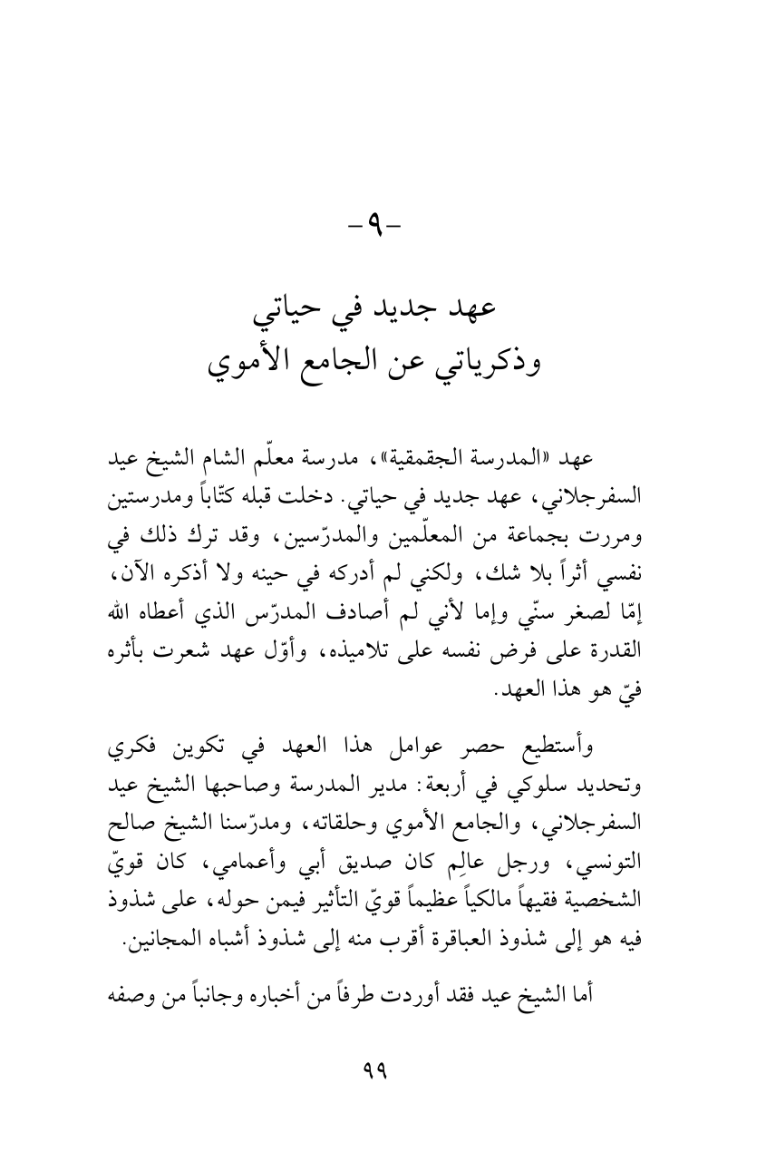 وأستطيع حصر عوامل هذا العهد في تكوين فكري وتحديد سلوكي في أربعة: مدير المدرسة وصاحبها الشيخ عيد السفرجلاني، والجامع الأموي وحلقاته، ومدرّسنا الشيخ صالح التونسي، ورجل عالِم كان صديق أبي وأعمامي، كان قويّ الشخصية فقيهاً مالكياً عظيماً قويّ التأثير فيمن حوله، على شذوذ فيه هو إلى شذوذ العباقرة أقرب منه إلى شذوذ أشباه المجانين.