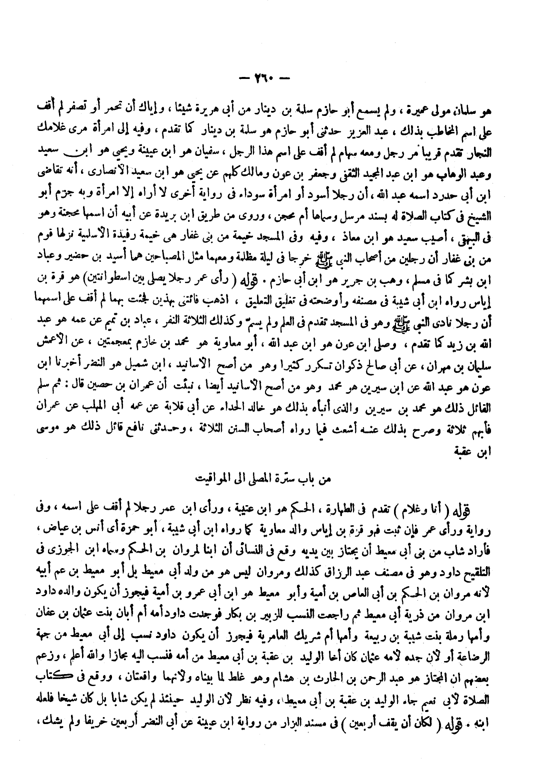 هُوَ سلمَان مولى عميرَة وَلم يسمع أَبُو حَازِم سَلمَة بن دِينَار من أبي هُرَيْرَة شَيْئا وَإِيَّاك أَن تحمر أَو تصفر لم أَقف على اسْم الْمُخَاطب بذلك عبد الْعَزِيز حَدثنِي أَبُو حَازِم هُوَ سَلمَة بن دِينَار كَمَا تقدم وَفِيه إِلَى امْرَأَة مري غلامك النجار تقدم قَرِيبا مر رجل وَمَعَهُ سِهَام لم أَقف على اسْم هَذَا الرجل سُفْيَان هُوَ بن عُيَيْنَة وَيحيى هُوَ بن سعيد وَعبد الْوَهَّاب هُوَ بن عبد الْمجِيد الثَّقَفِيّ وجعفر بن عون وَمَالك كلهم عَن يحيى هُوَ بن سعيد الْأنْصَارِيّ أَنه تقاضى بن أبي حَدْرَد اسْمه عبد الله أَن رجلا أسود أَو امْرَأَة سَوْدَاء فِي رِوَايَة أُخْرَى لَا أرَاهُ إِلَّا امْرَأَة وَبِه جزم أَبُو الشَّيْخ فِي كتاب الصَّلَاة لَهُ بِسَنَد مُرْسل وسماها أم محجن وروى من طَرِيق بن بُرَيْدَة عَن أَبِيه أَن اسْمهَا محجنة وَهُوَ فِي الْبَيْهَقِيّ أُصِيب سعيد هُوَ بن معَاذ وَفِيه وَفِي الْمَسْجِد خيمة من بني غفار هِيَ خيمة رفيدة الأسْلَمِيَّة نزلها قوم من بني غفار أَنَّ رَجُلَيْنِ مِنْ أَصْحَابِ النَّبِيِّ صَلَّى اللَّهُ عَلَيْهِ وَسَلَّمَ خرجا فِي لَيْلَة مظْلمَة ومعهما مثل المصباحين هَمَّا أَسُيْدُ بْنُ حَضِيرٍ وَعَبَّادُ بْنُ بِشْرٍ كَمَا فِي مُسلم وهب بن جرير هُوَ بن أبي حَازِم قَوْله رأى عمر رجلا يُصَلِّي بَين اسطوانتين هُوَ قُرَّة بن إِيَاس رَوَاهُ بن أبي شيبَة فِي مُصَنفه وأوضحته فِي تغليق التَّعْلِيق اذْهَبْ فائتني بِهَذَيْنِ فَجئْت بهما لم أَقف على اسمهما أَن رجلا نَادَى النَّبِيِّ صَلَّى اللَّهُ عَلَيْهِ وَسَلَّمَ وَهُوَ فِي الْمَسْجِد تقدم فِي الْعلم وَلم يسم وَكَذَلِكَ الثَّلَاثَة النَّفر عَبَّادِ بْنِ تَمِيمٍ عَنْ عَمِّهِ هُوَ عَبْدُ اللَّهِ بْنُ زَيْدِ كَمَا تقدم وَصلى بن عون هُوَ بن عبد الله أَبُو مُعَاوِيَة هُوَ مُحَمَّد بن خازم بمعجمتين عَن الْأَعْمَش سُلَيْمَان بن مهْرَان عَن أبي صَالح ذكْوَان تكَرر كثيرا وَهُوَ من أصح الْأَسَانِيد بن شُمَيْل هُوَ النَّضر أخبرنَا بن عون هُوَ عبد الله عَن بن سِيرِين هُوَ مُحَمَّد وَهُوَ من أصح الْأَسَانِيد أَيْضا نُبِّئْتُ أَنَّ عِمْرَانَ بْنَ حُصَيْنٍ قَالَ ثُمَّ سلم الْقَائِل ذَلِك هُوَ مُحَمَّد بن سِيرِين وَالَّذِي أنبأه بذلك هُوَ خَالِد الحداء عَنْ أَبِي قِلَابَةَ عَنْ عَمِّهِ أَبِي الْمُهَلَّبِ عَن عمرَان فأبهم ثَلَاثَة وَصرح بذلك عَنهُ أَشْعَث فِيمَا رَوَاهُ أَصْحَاب السّنَن الثَّلَاثَة وحَدثني نَافِع قَائِل ذَلِك هُوَ مُوسَى بن عقبَة ... من بَاب ستْرَة الْمُصَلِّي إِلَى الْمَوَاقِيت قَوْله أَنا وَغُلَام تقدم فِي الطَّهَارَة الحكم هُوَ بن عتيبة وَرَأى بن عمر رجلا لم أَقف على اسْمه وَفِي رِوَايَة وَرَأى عمر فَإِن ثَبت فَهُوَ قُرَّة بن إِيَاس وَالِد مُعَاوِيَة كَمَا رَوَاهُ بن أبي شيبَة أَبُو حَمْزَة أَي أنس بن عِيَاض فَأَرَادَ شَاب من بني أبي معيط أَن يجتاز بَين يَدَيْهِ وَقع فِي النَّسَائِيّ أَن ابْنا لمروان بن الحكم وَسَماهُ بن الْجَوْزِيّ فِي التلقيح دَاوُد وَهُوَ فِي مُصَنف عبد الرَّزَّاق كَذَلِك ومروان لَيْسَ هُوَ من ولد أبي معيط بل أَبُو معيط بن عَم أَبِيه لِأَنَّهُ مَرْوَان بن الحكم بن أبي الْعَاصِ بن أُميَّة وَأَبُو معيط هُوَ بن أبي عَمْرو بن أُميَّة فَيجوز أَن يكون وَالِده دَاوُد بن مَرْوَان من ذُرِّيَّة أبي معيط ثمَّ راجعت النّسَب للزبير بن بكار فَوجدت دَاوُد أمه أم أبان بنت عُثْمَان بن عَفَّان وَأمّهَا رَملَة بنت شيبَة بن ربيعَة وَأمّهَا أم شريك العامرية فَيجوز أَنْ يَكُونَ دَاوُدُ نُسِبَ إِلَى أَبِي مُعَيْطٍ من جِهَة الرضَاعَة أَو لِأَن جده لأمه عُثْمَان كَانَ أَخا الْوَلِيد بن عقبَة بن أبي معيط من أمه فنسب إِلَيْهِ مجَازًا وَالله أعلم وَزعم بَعضهم أَن المجتاز هُوَ عبد الرَّحْمَن بن الْحَارِث بن هِشَام وَهُوَ غلط لما بَيناهُ وَلِأ
