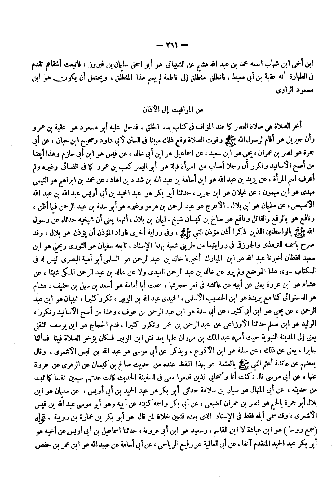 بن أخي بن شهَاب اسْمه مُحَمَّد بن عبد الله هشيم عَن الشَّيْبَانِيّ هُوَ أَبُو إِسْحَاق سُلَيْمَان بن فَيْرُوز فانبعث أشقاهم تقدم فِي الطَّهَارَة أَنه عقبَة بن أبي معيط فَانْطَلق منطلق إِلَى فَاطِمَة لم يسم هَذَا المنطلق وَيحْتَمل أَن يكون هُوَ بن مَسْعُود الرَّاوِي ... من الْمَوَاقِيت إِلَى الْأَذَان أخر الصَّلَاة هِيَ صَلَاة الْعَصْر كَمَا عِنْد الْمُؤلف فِي كتاب بَدْء الْخلق فَدخل عَلَيْهِ أَبُو مَسْعُود هُوَ عقبَة بن عَمْرو وَأَن جِبْرِيل هُوَ أَقَامَ لرَسُول الله صلى الله عَلَيْهِ وَسلم وقوت الصَّلَاة وَقع ذَلِك مُبينًا فِي السّنَن لأبي دَاوُد وصحيح بن حبَان عَن أبي جَمْرَة هُوَ نصر بن عمرَان يحيى هُوَ بن سعيد عَن إِسْمَاعِيل هُوَ بن أبي خَالِد عَن قيس هُوَ بن أبي حَازِم وَهَذَا أَيْضا من أصح الْأَسَانِيد وتكرر أَن رجلا أصَاب من امْرَأَة قبْلَة هُوَ أَبُو الْيُسْر كَعْب بن عَمْرو كَمَا فِي النَّسَائِيّ وَغَيره وَلم أعرف اسْم الْمَرْأَة عَن يزِيد بن عبد الله هُوَ بْنِ أُسَامَةَ بْنُ عَبْدِ اللَّهِ بْنِ شَدَّادِ بْنِ الْهَاد عَن مُحَمَّد بن إِبْرَاهِيم هُوَ التَّيْمِيّ مهْدي هُوَ بن مَيْمُون عَن غيلَان هُوَ بن جرير حَدثنَا أَبُو بَكْرٍ هُوَ عَبْدُ الْحَمِيدِ بْنُ أَبِي أُوَيْسٍ عَبْدِ اللَّهِ بْنِ عَبْدِ اللَّهِ الأصبحي عَن سُلَيْمَان هُوَ بن بِلَال الْأَعْرَج هُوَ عبد الرَّحْمَن بن هُرْمُز وَغَيْرُهُ هُوَ أَبُو سَلَمَةَ بْنُ عَبْدِ الرَّحْمَنِ فِيمَا أَظن وَنَافِع هُوَ بِالرَّفْع وَالْقَائِل وَنَافِع هُوَ صَالح بن كيسَان شيخ سُلَيْمَان بن بِلَال أَنَّهُمَا يَعْنِي أَن شيخيه حَدَّثَاهُ عَنْ رَسُولِ اللَّهِ صَلَّى اللَّهُ عَلَيْهِ وَسَلَّمَ بالواسطتين اللَّذين ذكرا أَذَّنَ مُؤَذِّنُ النَّبِيِّ صَلَّى اللَّهُ عَلَيْهِ وَسَلَّمَ وَفِي رِوَايَةِ أُخْرَى فَأَرَادَ الْمُؤَذّن أَن يُؤذن هُوَ بِلَال وَقد صرح باسمه التِّرْمِذِيّ والجوزقي فِي روايتهما من طَرِيق شُعْبَة بِهَذَا الْإِسْنَاد تَابعه سُفْيَان هُوَ الثَّوْريّ وَيحيى هُوَ بن سعيد الْقطَّان أخبرنَا عبد الله هُوَ بن الْمُبَارك أخبرنَا خَالِد بن عبد الرَّحْمَن هُوَ السّلمِيّ أَبُو أُميَّة الْبَصْرِيّ لَيْسَ لَهُ فِي الْكتاب سوى هَذَا الْموضع وَلم يرو عَن خَالِد بن عبد الرَّحْمَن الْعَبْدي وَلَا عَن خَالِد بن عبد الرَّحْمَن الْمَكِّيّ شَيْئا عَن هِشَام هُوَ بن عُرْوَة يَعْنِي عَن أَبِيه عَن عَائِشَة فِي قَعْر حُجْرَتهَا سَمِعْتُ أَبَا أُمَامَةَ هُوَ أَسْعَدُ بْنُ سَهْلِ بن حنيف هِشَام هُوَ الدستوَائي كُنَّا مَعَ بُرَيْدَة هُوَ بن الْحصيب الْأَسْلَمِيّ الْحميدِي عبد الله بن الزبير تكَرر كثيرا شَيبَان هُوَ بن عبد الرَّحْمَن عَن يحيى هُوَ بن أبي كثير عَن أبي سَلمَة هُوَ بن عبد الرَّحْمَن بن عَوْف وَهَذَا من أصح الْأَسَانِيد وتكرر الْوَلِيد هُوَ بن مُسلم حَدثنَا الْأَوْزَاعِيّ عَن عبد الرَّحْمَن بن عمر وتكرر كثيرا قدم الْحجَّاج هُوَ بن يُوسُف الثَّقَفِيّ يَعْنِي إِلَى الْمَدِينَة النَّبَوِيَّة حَيْثُ أمره عبد الْملك بن مَرْوَان عَلَيْهَا بعد قتل بن الزبير فَكَانَ يُؤَخر الصَّلَاة فِينَا فسألنا جَابِرا يَعْنِي عَن ذَلِك عَن سَلمَة هُوَ بن الْأَكْوَع وَيذكر عَن أبي مُوسَى هُوَ عبد الله بن قيس الْأَشْعَرِيّ وَقَالَ بَعضهم عَن عَائِشَة أعتم النَّبِي صلى الله عَلَيْهِ وَسلم بالعتمة هُوَ بِهَذَا اللَّفْظ عِنْده من حَدِيث صَالِحِ بْنِ كَيْسَانَ عَنِ الزُّهْرِيِّ عَنْ عُرْوَةَ عَنْهَا عَن أبي مُوسَى قَالَ كنت أَنا وأصحابي الَّذين قدمُوا معي فِي السَّفِينَة الحَدِيث كَانَت عدتهمْ سبعين نفسا كَمَا ثَبت من حَدِيثه عَن أبي الْمنْهَال هُوَ سيار بن سَلامَة حَدَّثَنِي أَبُو بَكْرٍ هُوَ عَبْدُ الْحَمِيدِ بْنُ أبي أويس عَن سُلَيْمَان هُوَ بن بِلَال أَبُو جَمْرَة بِ