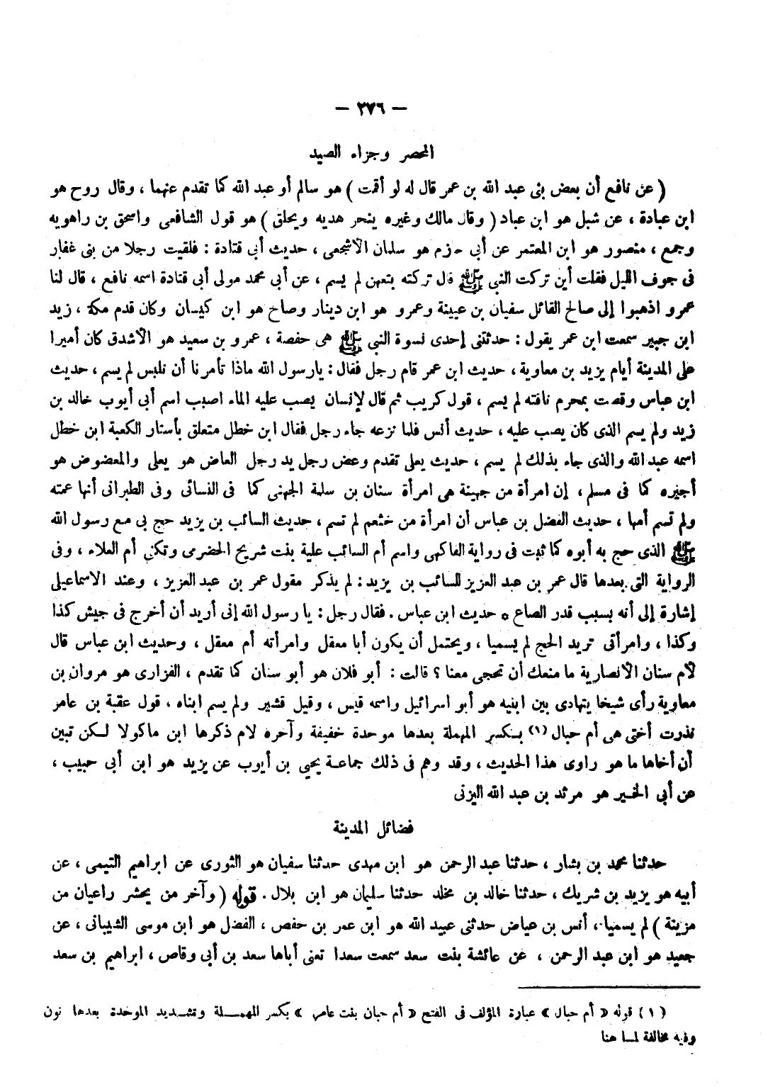 الْمحصر وَجَزَاء الصَّيْد عَنْ نَافِعٍ أَنَّ بَعْضَ بَنِي عَبْدِ اللَّهِ بن عمر قَالَ لَهُ لَو أَقمت هُوَ سَالم أَو عبد الله كَمَا تقدم عَنْهُمَا وَقَالَ روح هُوَ بن عبَادَة عَن شبْل هُوَ بن عباد وَقَالَ مَالك وَغَيره ينْحَر هَدْيه ويحلق هُوَ قَول الشَّافِعِي واسحق بن رَاهَوَيْه وَجمع مَنْصُور هُوَ بن الْمُعْتَمِر عَن أبي حَازِم هُوَ سلمَان الْأَشْجَعِيّ حَدِيث أبي قَتَادَة فَلَقِيت رجلا من بني غفار فِي جَوف اللَّيْل فَقلت أَيْن تركت النَّبِي صلى الله عَلَيْهِ وَسلم قَالَ تركته بتعهن لم يسم عَن أبي مُحَمَّد مولى أبي قَتَادَة اسْمه نَافِع قَالَ لنا عَمْرو اذْهَبُوا إِلَى صَالح الْقَائِل سُفْيَان بن عُيَيْنَة وَعَمْرو هُوَ بن دِينَار وَصَالح هُوَ بن كيسَان وَكَانَ قدم مَكَّة زيد بن جُبَير سَمِعت بن عمر يَقُول حَدَّثَتْنِي إِحْدَى نِسْوَةِ النَّبِيِّ صَلَّى اللَّهُ عَلَيْهِ وَسلم هِيَ حَفْصَة عَمْرو بن سعيد هُوَ الْأَشْدَق كَانَ أَمِيرا على الْمَدِينَة أَيَّام يزِيد بن مُعَاوِيَة حَدِيث بن عُمَرَ قَامَ رَجُلٌ فَقَالَ يَا رَسُولَ اللَّهِ مَاذَا تَأْمُرنَا أَن نلبس لم يسم حَدِيث بن عَبَّاس وقصت بِمحرم نَاقَته لم يسم قَول كريب ثمَّ قَالَ لإِنْسَان يصب عَلَيْهِ المَاء أصبب اسْم أبي أَيُّوب خَالِد بن زيد وَلم يسم الَّذِي كَانَ يصب عَلَيْهِ حَدِيث أنس فَلَمَّا نَزعه جَاءَ رجل فَقَالَ بن خطل مُتَعَلق بِأَسْتَارِ الْكَعْبَة بن خطل اسْمه عبد الله وَالَّذِي جَاءَ بذلك لم يسم حَدِيث يعلى تقدم وعض رجل يَد رجل العاض هُوَ يعلى والمعضوض هُوَ أجيره كَمَا فِي مُسلم إِن امْرَأَة من جُهَيْنَة هِيَ امْرَأَة سِنَان بن سَلمَة الْجُهَنِيّ كَمَا فِي النَّسَائِيّ وَفِي الطَّبَرَانِيّ أَنَّهَا عمته وَلم تسم أمهَا حَدِيث الْفضل بن عَبَّاس أَن امْرَأَة من خثعم لم تسم حَدِيث السَّائِب بن يزِيد حج بِي مَعَ رَسُولِ اللَّهِ صَلَّى اللَّهُ عَلَيْهِ وَسَلَّمَ الَّذِي حج بِهِ أَبوهُ كَمَا ثَبت فِي رِوَايَة الفاكهي وَاسم أم السَّائِب علية بنت شُرَيْح الْحَضْرَمِيّ وتكنى أم الْعَلَاء وَفِي الرِّوَايَة الَّتِي بعْدهَا قَالَ عمر بن عبد الْعَزِيز للسائب بن يزِيد لم يذكر مقول عمر بن عبد الْعَزِيز وَعند الْإِسْمَاعِيلِيّ إِشَارَة إِلَى أَنه بِسَبَب قدر الصَّاع حَدِيث بن عَبَّاس فَقَالَ رَجُلٌ يَا رَسُولَ اللَّهِ ... إِنِّي أُرِيدُ أَن أخرج فِي جَيش كَذَا وَكَذَا وامرأتي تُرِيدُ الْحَج لم يسميا وَيحْتَمل أَن يكون أَبَا معقل وَامْرَأَته أم معقل وَحَدِيث بن عَبَّاس قَالَ لأم سِنَان الْأَنْصَارِيَّة مَا مَنعك أَن تحجي مَعنا قَالَت أَبُو فلَان هُوَ أَبُو سِنَان كَمَا تقدم الْفَزارِيّ هُوَ مَرْوَان بن مُعَاوِيَة رأى شَيخا يتهادى بَين ابنيه هُوَ أَبُو إِسْرَائِيل واسْمه قيس وَقيل قُشَيْر وَلم يسم ابناه قَول عقبَة بن عَامر نذرت أُخْتِي هِيَ أم حبال بِكَسْر الْمُهْملَة بعْدهَا مُوَحدَة خَفِيفَة وَآخره لَام ذكرهَا بن مَاكُولَا لَكِن تبين أَن أخاها مَا هُوَ رَاوِي هَذَا الحَدِيث وَقد وهم فِي ذَلِك جمَاعَة يحيى بن أَيُّوب عَن يزِيد هُوَ بن أبي حبيب عَنْ أَبِي الْخَيْرِ هُوَ مَرْثَدُ بْنُ عَبْدِ اللَّهِ الْيَزَنِيُّ ... فَضَائِل الْمَدِينَة حَدَّثَنَا مُحَمَّدُ بْنُ بَشَّارٍ حَدَّثَنَا عَبْدُ الرَّحْمَنِ هُوَ بن مهْدي حَدثنَا سُفْيَان هُوَ الثَّوْريّ عَن إِبْرَاهِيمُ التَّيْمِيُّ عَنْ أَبِيهِ هُوَ يَزِيدُ بْنُ شريك حَدثنَا خَالِد بن مخلد حَدثنَا سُلَيْمَان هُوَ بن بِلَال قَوْلُهُ وَآخِرُ مَنْ يُحْشَرُ رَاعِيَانِ مِنْ مُزَيْنَةَ لم يسميا أنس بن عِيَاض حَدثنِي عبيد الله هُوَ بن عمر بن حَفْص الْفضل هُوَ بن مُوسَى الشَّيْبَانِيّ عَن جعيد هُوَ بن عبد الرَّحْمَن عَن عَائِشَة بنت سعد سَمِعت سَعْدا تَعْنِي أَبَاهَا سعد بن أبي وَقاص إِبْرَاهِيم بن سعد