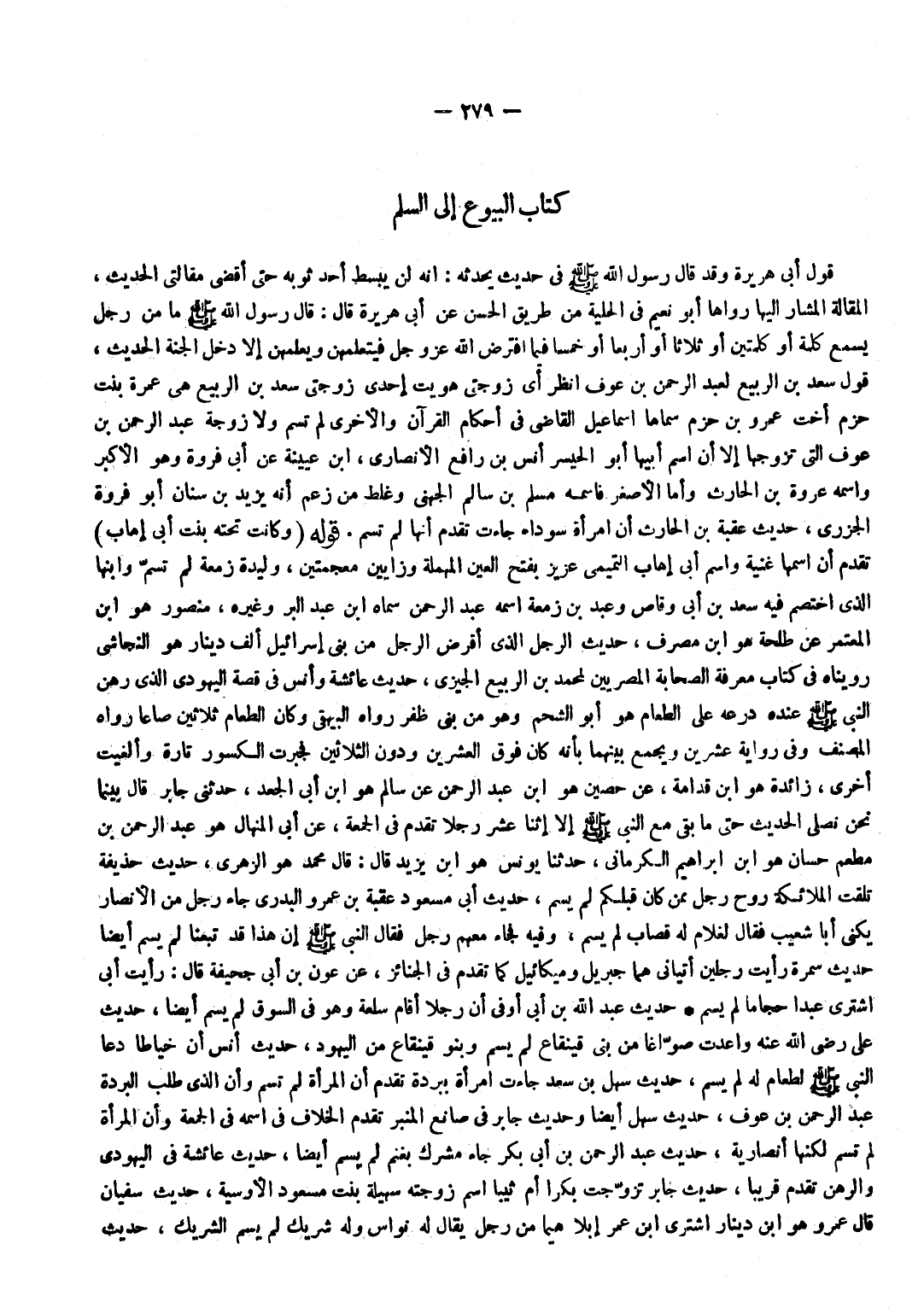 قَول أبي هُرَيْرَة وَقَدْ قَالَ رَسُولُ اللَّهِ صَلَّى اللَّهُ عَلَيْهِ وَسَلَّمَ فِي حَدِيث يحدثه أَنه لن يبسط أحد ثَوْبه حَتَّى أَقْْضِي مَقَالَتي الحَدِيث الْمقَالة الْمشَار إِلَيْهَا رَوَاهَا أَبُو نعيم فِي الْحِلْية من طَرِيق الْحسن عَنْ أَبِي هُرَيْرَةَ قَالَ قَالَ رَسُولُ اللَّهِ صَلَّى اللَّهُ عَلَيْهِ وَسَلَّمَ مَا مِنْ رَجُلٍ يَسْمَعُ كَلِمَةً أَوْ كَلِمَتَيْنِ أَوْ ثَلَاثًا أَوْ أَرْبعا أَو خمْسا فِيمَا افْترض الله عز وَجل فيتعلمهن ويعلمهن إِلَّا دخل الْجنَّة الحَدِيث قَول سعد بن الرّبيع لعبد الرَّحْمَن بن عَوْف انْظُر أَي زَوْجَتي هويت إِحْدَى زَوْجَتي سعد بن الرّبيع هِيَ عمْرَة بنت حزم أُخْت عَمْرو بن حزم سَمَّاهَا إِسْمَاعِيل القَاضِي فِي أَحْكَام الْقُرْآن وَالْأُخْرَى لم تسم وَلَا زَوْجَة عبد الرَّحْمَن بن عَوْف الَّتِي تزَوجهَا إِلَّا أَن اسْم أَبِيهَا أَبُو الحيسر أنس بن رَافع الْأنْصَارِيّ بن عُيَيْنَة عَن أبي فَرْوَة وَهُوَ الْأَكْبَر واسْمه عُرْوَة بن الْحَارِث وَأما الْأَصْغَر فاسمه مُسلم بن سَالم الْجُهَنِيّ وَغلط من زعم أَنه يزِيد بن سِنَان أَبُو فَرْوَة الْجَزرِي حَدِيث عقبَة بن الْحَارِث أَن امْرَأَة سَوْدَاء جَاءَت تقدم أَنَّهَا لم تسم قَوْله وَكَانَت تَحْتَهُ بنت أبي إهَاب تقدم أَن اسْمهَا غنية وَاسم أبي إهَاب التَّمِيمِي عَزِيز بِفَتْح الْعين الْمُهْملَة وزايين معجمتين وليدة زَمعَة لم تسم وَابْنهَا الَّذِي اخْتصم فِيهِ سَعْدِ بْنِ أَبِي وَقَّاصٍ وَعَبْدِ بْنِ زَمْعَةَ اسْمه عبد الرَّحْمَن سَمَّاهُ بن عبد الْبر وَغَيره مَنْصُور هُوَ بن الْمُعْتَمِر عَن طَلْحَة هُوَ بن مصرف حَدِيث الرجل الَّذِي أقْرض الرجل من بني إِسْرَائِيل ألف دِينَار هُوَ النَّجَاشِيّ روينَاهُ فِي كتاب معرفَة الصَّحَابَة المصريين لمُحَمد بن الرّبيع الجيزي حَدِيث عَائِشَة وَأنس فِي قصَّة الْيَهُودِيّ الَّذِي رهن النَّبِي صلى الله عَلَيْهِ وَسلم عِنْده درعه على الطَّعَام هُوَ أَبُو الشَّحْم وَهُوَ من بني ظفر رَوَاهُ الْبَيْهَقِيّ وَكَانَ الطَّعَام ثَلَاثِينَ صَاعا رَوَاهُ المُصَنّف وَفِي رِوَايَة عشْرين وَيجمع بَينهمَا بِأَنَّهُ كَانَ فَوق الْعشْرين وَدون الثَّلَاثِينَ فجبرت الكسور تَارَة وألغيت أُخْرَى زَائِدَة هُوَ بن قدامَة عَن حُصَيْن هُوَ بن عبد الرَّحْمَن عَن سَالم هُوَ بن أبي الْجَعْد حَدثنِي جَابر قَالَ بَيْنَمَا نَحن نصلي الحَدِيث حَتَّى مَا بَقِيَ مَعَ النَّبِيِّ صَلَّى اللَّهُ عَلَيْهِ وَسَلَّمَ إِلَّا اثْنَا عشر رجلا تقدم فِي الْجُمُعَة عَن أبي الْمنْهَال هُوَ عبد الرَّحْمَن بن مطعم حسان هُوَ بن إِبْرَاهِيم الْكرْمَانِي حَدثنَا يُونُس هُوَ بن يزِيد قَالَ قَالَ مُحَمَّد هُوَ الزُّهْرِيّ حَدِيث حُذَيْفَة تلقت الْمَلَائِكَة روح رجل مِمَّن كَانَ قبلكُمْ لم يسم حَدِيث أبي مَسْعُود عقبَة بن عَمْرو البدري جَاءَ رجل من الْأَنْصَار يكنى أَبَا شُعَيْب فَقَالَ لغلام لَهُ قصاب لم يسم وَفِيه فجَاء مَعَهم رجل فَقَالَ النَّبِيُّ صَلَّى اللَّهُ عَلَيْهِ وَسَلَّمَ إِنَّ هَذَا قد تبعنا لم يسم أَيْضا حَدِيث سَمُرَة رَأَيْت رجلَيْنِ أتياني هما جِبْرِيل وَمِيكَائِيل كَمَا تقدم فِي الْجَنَائِز عَن عَوْنُ بْنُ أَبِي جُحَيْفَةَ قَالَ رَأَيْتُ أَبِي اشْترى عبدا حجاما لم يسم حَدِيث عبد الله بن أبي أوفى أَن رجلا أَقَامَ سلْعَة وَهُوَ فِي السُّوق لم يسم أَيْضا حَدِيث عَليّ رَضِي الله عَنهُ وَاعَدت صواغا من بني قينقاع لم يسم وَبَنُو قينقاع من الْيَهُود حَدِيث أنس أَن خياطا دَعَا النَّبِي صلى الله عَلَيْهِ وَسلم لطعام لَهُ لم يسم حَدِيثُ سَهْلِ بْنِ سَعْدٍ جَاءَتِ امْرَأَةٌ بِبُرْدَةٍ تقدم أَن الْمَرْأَة لم تسم وَأَن الَّذِي طلب الْبردَة عبد الرَّحْمَن بن عَوْف حَدِيث سهل أَيْضا وَحَدِيث جَابر فِي صانع الْمِنْ