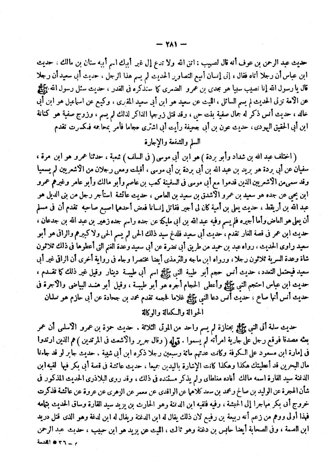 حَدِيث عبد الرَّحْمَن بن عَوْف أَنه قَالَ لِصُهَيْبٍ اتَّقِ اللَّهَ وَلَا تُدْعَ إِلَى غَيْرِ أَبِيك اسْم أَبِيه سِنَان بن مَالك حَدِيث بن عَبَّاس أَن رجلا أَتَاهُ فَقَالَ ... أَنِّي إِنْسَان أبيع التصاوير الحَدِيث لم يسم هَذَا الرجل حَدِيث أبي سعيد أَن رجلا قَالَ يَا رَسُول الله إِنَّا نصيب سبيا هُوَ مجدي بن عَمْرو الضمرِي كَمَا سَنذكرُهُ فِي الْقدر حَدِيث سُئِلَ رَسُولُ اللَّهِ صَلَّى اللَّهُ عَلَيْهِ وَسَلَّمَ عَنْ الْأمة تَزني الحَدِيث لم يسم السَّائِل اللَّيْث عَن سعيد هُوَ بن أبي سعيد المَقْبُري وَكِيع عَن إِسْمَاعِيل هُوَ بن أبي خَالِد حَدِيث أنس ذُكِرَ لَهُ جَمَالُ صَفِيَّةَ بِنْتِ حُيَيٍّ وَقَدْ قتل زَوجهَا الذاكر لذَلِك لم يسم وَزوج صَفِيَّة هُوَ كنَانَة بن أبي الْحقيق الْيَهُودِيّ حَدِيث عون بن أبي جُحَيْفَة رَأَيْتُ أَبِي اشْتَرَى حَجَّامًا فَأَمَرَ بِمَحَاجِمِهِ فَكُسِرَتْ تقدم ... السّلم وَالشُّفْعَة وَالْإِجَارَة اخْتلف عبد الله بن شَدَّاد وَأَبُو بردة هُوَ بن أبي مُوسَى فِي السّلف شُعْبَة حَدثنَا عَمْرو هُوَ بن مرّة سُفْيَان عَن أبي بردة هُوَ بُرَيْدُ بْنُ عَبْدِ اللَّهِ بْنِ أَبِي بُرْدَةَ بْنِ أَبِي مُوسَى أَقبلت وَمَعِي رجلَانِ من الْأَشْعَرِيين لم يسميا وَقد سمي من الْأَشْعَرِيين الَّذين قدمُوا مَعَ أبي مُوسَى فِي السَّفِينَة كَعْب بن عَاصِم وَأَبُو مَالك وَأَبُو عَامر وَغَيرهم عَمْرو بن يحيى عَن جده هُوَ سعيد بن عَمْرو الْأَشْدَق بن سعيد بن الْعَاصِ حَدِيث عَائِشَة اسْتَأْجر رجل من بني الديل هُوَ عبد الله بن أريقط حَدِيث يعلى بن أُميَّة كَانَ لِي أَجِيرٌ فَقَاتَلَ إِنْسَانًا فَعَضَّ أَحَدهُمَا أصْبع صَاحبه تقدم أَن فِي مُسلم أَن يعلى هُوَ العاض وَأما أجيره فَلم يسم وَفِيه عبد الله بن أبي مليكَة عَن جده وَاسم جده زُهَيْر بن عبد الله بن جدعَان حَدِيث بن عمر فِي قصَّة الْغَار تقدم حَدِيث أبي سعيد فلدغ سيد ذَلِك الْحَيّ لم يسم الْحَيّ وَلَا كَبِيرهمْ والراقي هُوَ أَبُو سعيد رَاوِي الحَدِيث رَوَاهُ عبد بن حميد مِنْ طَرِيقِ أَبِي نَضْرَةَ عَنْ أَبِي سَعِيدٍ وعدة الْغنم الَّتِي أعطوها فِي ذَلِك ثَلَاثُونَ شَاة وعدة السّريَّة ثَلَاثُونَ رجلا وَرَوَاهُ بن ماجة وَالتِّرْمِذِيّ أَيْضا مُخْتَصرا وَجَاء فِي رِوَايَة أُخْرَى أَن الراقي غير أبي سعيد فَيحْتَمل التَّعَدُّد حَدِيث أنس حجم أَبُو طيبَة النَّبِي صلى الله عَلَيْهِ وَسلم اسْم أبي طيبَة دِينَار وَقيل غير ذَلِك كَمَا تقدم حَدِيث بن عَبَّاسٍ احْتَجَمَ النَّبِيُّ صَلَّى اللَّهُ عَلَيْهِ وَسَلَّمَ وَأعْطى الْحجام أجره هُوَ أَبُو طيبَة وَقيل أَبُو هِنْد البياضي وَالْأُجْرَة فِي حَدِيث أنس أَنَّهَا صَاع حَدِيث أنس دَعَا النَّبِيُّ صَلَّى اللَّهُ عَلَيْهِ وَسَلَّمَ غُلَامًا فحجمه تقدم مُحَمَّد بن جحادة عَن أبي حَازِم هُوَ سلمَان ... الْحِوَالَة وَالْكَفَالَة وَالْوكَالَة حَدِيث سَلمَة أَتَى النَّبِي صلى الله عَلَيْهِ وَسلم بِجنَازَة لم يسم وَاحِد من الْمَوْتَى الثَّلَاثَة حَدِيث حَمْزَة بن عَمْرو الْأَسْلَمِيّ أَن عمر بَعَثَهُ مُصَدِّقًا فَوَقَعَ رَجُلٌ عَلَى جَارِيَةِ امْرَأَتِهِ لم يسموا قَوْله وَقَالَ جرير والأشعث فِي الْمُرْتَدين هم الَّذين ارْتَدُّوا فِي إِمَارَة بن مَسْعُود على الْكُوفَة وَكَانَت عدتهمْ مائَة وَسبعين رجلا ذكره بن أبي شيبَة حَدِيث جَابر لَوْ قَدْ جَاءَنَا مَالُ الْبَحْرَيْنِ قَدْ أَعْطَيْتُكَ هَكَذَا وَهَكَذَا كَانَت الْإِشَارَة باليدين جَمِيعًا حَدِيث عَائِشَة فِي قصَّة أبي بكر فِيهَا لقِيه بن الذغنة سيد القارة اسْمه مَالك أَفَادَهُ مغلطاي وَلم يذكر مُسْتَنده فِي ذَلِك وَقد روى البلاذري الحَدِيث الْمَذْكُور فِي شَأْن الْهِجْرَة عَن الْوَلِيد بن صَالح وَمُحَمّد بن سعد كِلَاهُمَا عَن الْوَاقِدِيّ عَنْ مَعْمَرٍ عَنِ ال