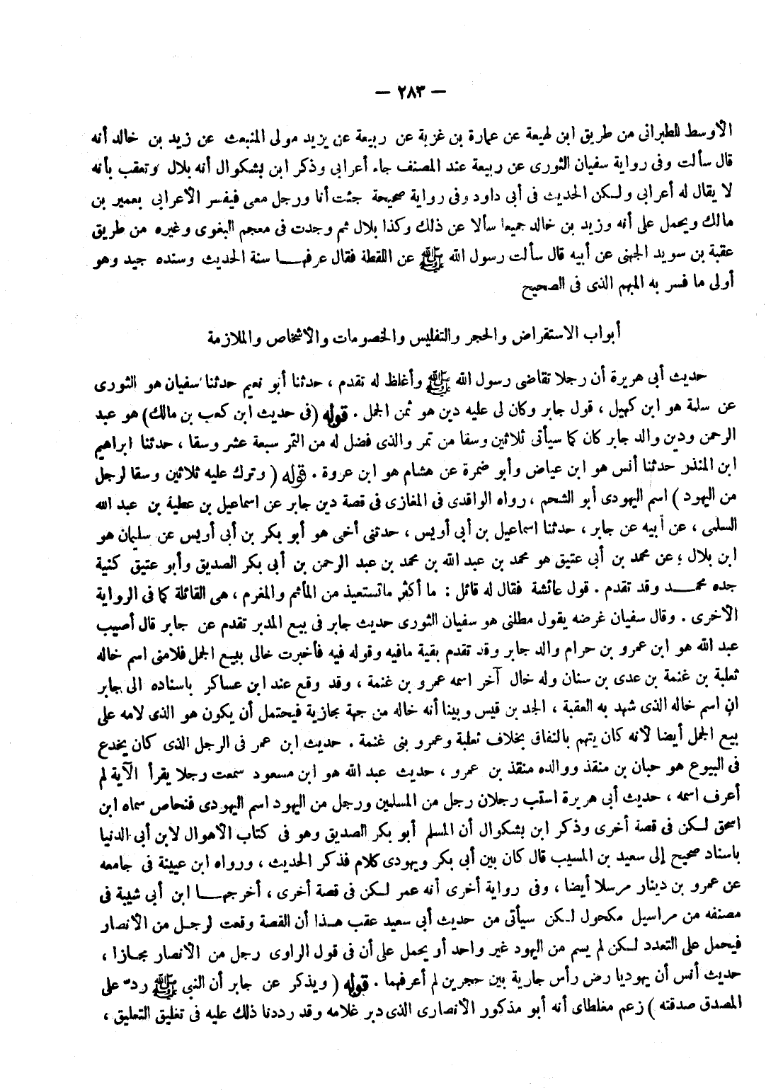 الْأَوْسَط للطبراني من طَرِيق بن لَهِيعَة عَن عمَارَة بن غزبة عَن ربيعَة عَنْ يَزِيدَ مَوْلَى الْمُنْبَعِثِ عَنْ زَيْدِ بْنِ خَالِد أَنه قَالَ سَأَلت وَفِي رِوَايَة سُفْيَان الثَّوْريّ عَن ربيعَة عِنْد المُصَنّف جَاءَ أَعْرَابِي وَذكر بن بشكوال أَنه بِلَال وَتعقب بِأَنَّهُ لَا يُقَال لَهُ أَعْرَابِي وَلَكِن الحَدِيث فِي أبي دَاوُد وَفِي رِوَايَة صَحِيحَة جِئْت أَنا وَرجل معي فيفسر الْأَعرَابِي بعمير بن مَالك وَيحمل على أَنه وَزيد بن خَالِد جَمِيعًا سَأَلَا عَن ذَلِك وَكَذَا بِلَال ثمَّ وجدت فِي مُعْجم الْبَغَوِيّ وَغَيره من طَرِيق عُقْبَةَ بْنِ سُوَيْدٍ الْجُهَنِيِّ عَنْ أَبِيهِ قَالَ سَأَلْتُ رَسُولَ اللَّهِ صَلَّى اللَّهُ عَلَيْهِ وَسَلَّمَ عَنْ اللّقطَة فَقَالَ عرفهَا سنة الحَدِيث وَسَنَده جيد وَهُوَ أولى مَا فسر بِهِ الْمُبْهم الَّذِي فِي الصَّحِيح ... أَبْوَاب الاستقراض وَالْحجر والتفليس والخصومات والأشخاص والملازمة حَدِيث أبي هُرَيْرَة أَنَّ رَجُلًا تَقَاضَى رَسُولَ اللَّهِ صَلَّى اللَّهُ عَلَيْهِ وَسلم وَأَغْلظ لَهُ تقدم حَدَّثَنَا أَبُو نُعَيْمٍ حَدَّثَنَا سُفْيَانُ هُوَ الثَّوْرِيُّ عَن سَلمَة هُوَ بن كهيل قَول جَابر وَكَانَ لي عَلَيْهِ دين هُوَ ثمن الْجمل قَوْله فِي حَدِيث بن كَعْب بن مَالك هُوَ عبد الرَّحْمَن وَدين وَالِد جَابر كَانَ كَمَا سَيَأْتِي ثَلَاثِينَ وسْقا من تمر وَالَّذِي فضل لَهُ من التَّمْر سَبْعَة عشر وسْقا حَدثنَا إِبْرَاهِيم بن الْمُنْذر حَدثنَا أنس هُوَ بن عِيَاض وَأَبُو ضَمرَة عَن هِشَام هُوَ بن عُرْوَة قَوْله وَتَرَكَ عَلَيْهِ ثَلَاثِينَ وَسْقًا لِرَجُلٍ مِنَ الْيَهُودِ اسْم الْيَهُودِيّ أَبُو الشَّحْم رَوَاهُ الْوَاقِدِيّ فِي الْمَغَازِي فِي قصَّة دين جَابر عَن إِسْمَاعِيل بن عَطِيَّة بن عبد الله السّلمِيّ عَن أَبِيه عَن جَابر حَدَّثَنَا إِسْمَاعِيلُ بْنُ أَبِي أُوَيْسٍ حَدَّثَنِي أَخِي هُوَ أَبُو بَكْرٍ بْنُ أَبِي أُوَيْسٍ عَنْ سُلَيْمَانَ هُوَ بْنِ بِلَالٍ عَنْ مُحَمَّدِ بْنُ أَبِي عَتِيقٍ هُوَ مُحَمَّدُ بْنُ عَبْدِ اللَّهِ بْنِ مُحَمَّدِ بْنِ عَبْدِ الرَّحْمَنِ بْنِ أَبِي بَكْرٍ الصِّدِّيقِ وَأَبُو عَتِيقٍ كُنْيَةُ جَدِّهِ مُحَمَّد وَقد تقدم قَول عَائِشَة فَقَالَ لَهُ قَائِلٌ مَا أَكْثَرَ مَا تَسْتَعِيذُ من المأثم والمغرم هِيَ القائلة كَمَا فِي الرِّوَايَة الْأُخْرَى وَقَالَ سُفْيَان غَرَضه يَقُول مطلني هُوَ سُفْيَان الثَّوْريّ حَدِيث جَابر فِي بيع الْمُدبر تقدم عَن جَابر قَالَ أُصِيب عبد الله هُوَ بن عَمْرو بن حرَام وَالِد جَابر وَقد تقدم بَقِيَّة مَا فِيهِ وَقَوله فِيهِ فَأخْبرت خَالِي بِبيع الْجمل فلامني اسْم خَاله ثَعْلَبَة بن غنمة بن عدي بن سِنَان وَله خَال آخر اسْمه عَمْرو بن غنمة وَقد وَقع عِنْد بن عَسَاكِر بِإِسْنَادِهِ إِلَى جَابر أَن اسْم خَاله الَّذِي شهد بِهِ الْعقبَة الْجد بن قيس وَبينا أَنه خَاله من جِهَة مجازية فَيحْتَمل أَن يكون هُوَ الَّذِي لأمه على بيع الْجمل أَيْضا لِأَنَّهُ كَانَ يتهم بالنفاق بِخِلَاف ثَعْلَبَة وَعَمْرو ابْني غنمة حَدِيث بن عمر فِي الرجل الَّذِي كَانَ يخدع فِي الْبيُوع هُوَ حبَان بن منقذ ووالده منقذ بن عَمْرو حَدِيث عبد الله هُوَ بن مَسْعُود سَمِعت رجلا يقْرَأ الْآيَة لم أعرف اسْمه حَدِيث أبي هُرَيْرَة استب رجلَانِ رجل من الْمُسلمين وَرجل من الْيَهُود اسْم الْيَهُودِيّ فنحَاص سَمَّاهُ بن إِسْحَاق لَكِن فِي قصَّة أُخْرَى وَذكر بن بشكوال أَن الْمُسلم أَبُو بكر الصّديق وَهُوَ فِي كتاب الْأَهْوَال لِابْنِ أبي الدُّنْيَا بِإِسْنَادٍ صَحِيحٍ إِلَى سَعِيدِ بْنِ الْمُسَيَّبِ قَالَ كَانَ بَين أبي بكر ويهودي كَلَام فَذكر الحَدِيث وَرَوَاهُ بْنُ عُيَيْنَةَ فِي جَامِعِهِ عَنْ عَمْرِو بْنِ دِينَار مُرْسلا أَيْضا وَفِي رِوَايَة أُ