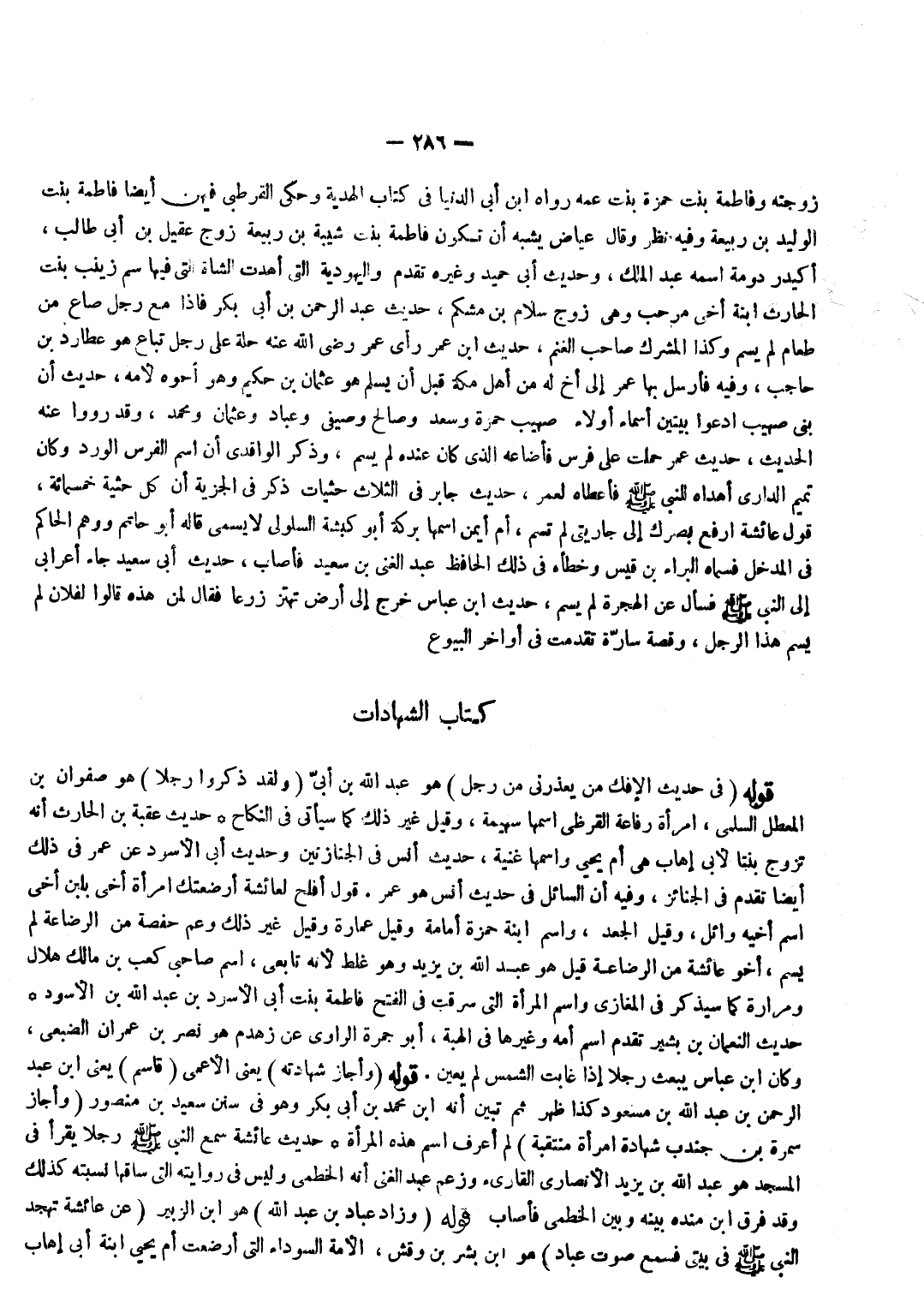زَوجته وَفَاطِمَة بنت حَمْزَة بنت عَمه رَوَاهُ بن أبي الدُّنْيَا فِي كتاب الْهَدِيَّة وَحكى الْقُرْطُبِيّ فِيهِنَّ أَيْضا فَاطِمَة بنت الْوَلِيد بن ربيعَة وَفِيه نظر وَقَالَ عِيَاض يشبه أَن تكون فَاطِمَة بنت شيبَة بن ربيعَة زوج عقيل بن أبي طَالب أكيدر دومة اسْمه عبد الْملك وَحَدِيث أبي حميد وَغَيره تقدم واليهودية الَّتِي أَهْدَت الشَّاة الَّتِي فِيهَا سم زَيْنَب بنت الْحَارِث ابْنة أخي مرحب وَهِي زوج سَلام بن مشْكم حَدِيث عبد الرَّحْمَن بن أبي بكر فَإِذا مَعَ رجل صَاع من طَعَام لم يسم وَكَذَا الْمُشرك صَاحب الْغنم حَدِيث بن عمر رأى عمر رَضِي الله عَنهُ حلَّة على رجل تبَاع هُوَ عُطَارِد بن حَاجِب وَفِيه فَأَرْسَلَ بِهَا عُمَرُ إِلَى أَخٍ لَهُ مِنْ أهل مَكَّة قبل أَن يسلم هُوَ عُثْمَان بن حَكِيم وَهُوَ أَخُوهُ لأمه حَدِيث أَن بني صُهَيْب ادعوا بَيْتَيْنِ أَسمَاء أولاء صُهَيْب حَمْزَةُ وَسَعْدٌ وَصَالِحٌ وَصَيْفِيٌّ وَعَبَّادٌ وَعُثْمَانُ وَمُحَمَّدٌ وَقد رووا عَنهُ الحَدِيث حَدِيث عمر حملت على فرس فأضاعه الَّذِي كَانَ عِنْده لم يسم وَذكر الْوَاقِدِيّ أَن اسْم الْفرس الْورْد وَكَانَ تَمِيم الدَّارِيّ أهداه لِلنَّبِيِّ صَلَّى اللَّهُ عَلَيْهِ وَسَلَّمَ فَأَعْطَاهُ لِعُمَرَ حَدِيث جَابر فِي الثَّلَاث حثيات ذكر فِي الْجِزْيَة أَن كل حثية خَمْسمِائَة قَول عَائِشَة أرفع بَصرك إِلَى جاريتي لم تسم أم أَيمن اسْمهَا بركَة أَبُو كَبْشَة السَّلُولي لَا يُسمى قَالَه أَبُو حَاتِم وَوهم الْحَاكِم فِي الْمدْخل فَسَماهُ الْبَراء بن قيس وَخَطأَهُ فِي ذَلِك الْحَافِظ عبد الْغَنِيّ بن سعيد فَأصَاب حَدِيثُ أَبِي سَعِيدٍ جَاءَ أَعْرَابِيٌّ إِلَى النَّبِيِّ صَلَّى اللَّهُ عَلَيْهِ وَسَلَّمَ فَسَأَلَ عَن الْهِجْرَة لم يسم حَدِيث بن عَبَّاس خرج إِلَى أَرض تهتز زرعا فَقَالَ لمن هَذِه قَالُوا لفُلَان لم يسم هَذَا الرجل وقصة سارة تقدّمت فِي أَوَاخِر الْبيُوع كتاب الشَّهَادَات قَوْله فِي حَدِيث الْإِفْك من يعذرني من رجل هُوَ عبد الله بن أبي وَلَقَد ذكرُوا رجلا هُوَ صَفْوَان بن الْمُعَطل السّلمِيّ امْرَأَة رِفَاعَة الْقرظِيّ اسْمهَا سهيمة وَقيل غير ذَلِك كَمَا سَيَأْتِي فِي النِّكَاح حَدِيث عقبَة بن الْحَارِث أَنه تزوج بِنْتا لأبي إهَاب هِيَ أم يحيى وَاسْمهَا غنية حَدِيث أنس فِي الجنازتين وَحَدِيث أبي الْأسود عَن عمر فِي ذَلِك أَيْضا تقدم فِي الْجَنَائِز وَفِيه أَن السَّائِل فِي حَدِيث أنس هُوَ عمر قَول أَفْلح لعَائِشَة أَرْضَعتك امْرَأَة أخي بِلَبن أخي اسْم أَخِيه وَائِل وَقيل الْجَعْد وَاسم ابْنة حَمْزَة أُمَامَة وَقيل عمَارَة وَقيل غير ذَلِك وَعم حَفْصَة من الرضَاعَة لم يسم أَخُو عَائِشَة من الرضَاعَة قيل هُوَ عبد الله بن يزِيد وَهُوَ غلط لِأَنَّهُ تَابِعِيّ اسْم صَاحِبي كَعْب بن مَالك هِلَال ومرارة كَمَا سَيذكرُ فِي الْمَغَازِي وَاسم الْمَرْأَة الَّتِي سرقت فِي الْفَتْح فَاطِمَة بنت أبي الْأسود بن عبد الله بن الْأسود حَدِيث النُّعْمَان بن بشير تقدم اسْم أمه وَغَيرهَا فِي الْهِبَة أَبُو جَمْرَة الرَّاوِي عَن زَهْدَم هُوَ نصر بن عمرَان الضبعِي وَكَانَ بن عَبَّاس يبْعَث رجلا إِذا غَابَتْ الشَّمْس لم يعين قَوْله وَأَجَازَ شَهَادَته يَعْنِي الْأَعْمَى قَاسم يَعْنِي بْنِ عَبْدُ الرَّحْمَنَ بْنُ عَبْدِ اللَّهِ بْنِ مَسْعُودٍ كَذَا ظهر ثمَّ تبين أَنه بن مُحَمَّد بن أبي بكر وَهُوَ فِي سنَن سعيد بن مَنْصُور وَأَجَازَ سَمُرَةُ بْنُ جُنْدَبٍ شَهَادَةَ امْرَأَةٍ مُنْتَقِبَةٍ لم أعرف اسْم هَذِه الْمَرْأَة حَدِيثُ عَائِشَةَ سَمِعَ النَّبِيُّ صَلَّى اللَّهُ عَلَيْهِ وَسَلَّمَ رَجُلًا يقْرَأ فِي الْمَسْجِد هُوَ عبد الله بن يزِيد الْأنْصَارِيّ الْقَارئ وَزعم عبد الْغَنِيّ أَنه الخطمي وَلَيْسَ فِي رِوَايَته الَّتِي سَاقهَا نسبته كَذَلِك 