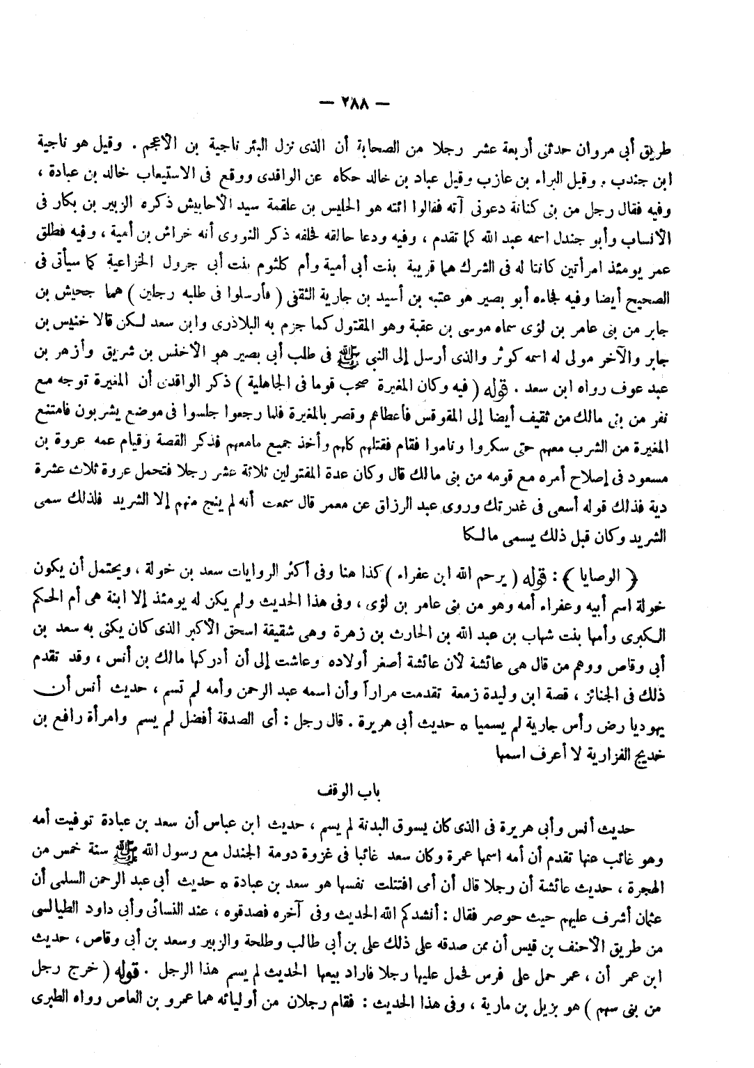 طَرِيق أبي مَرْوَان حَدثنِي أَرْبَعَة عشر رجلا من الصَّحَابَة أَن الَّذِي نزل الْبِئْر نَاجِية بن الْأَعْجَم وَقيل هُوَ نَاجِية بن جُنْدُب وَقيل الْبَراء بن عَازِب وَقيل عباد بن خَالِد حَكَاهُ عَن الْوَاقِدِيّ وَوَقع فِي الِاسْتِيعَاب خَالِد بن عبَادَة وَفِيه فَقَالَ رجل من بني كنَانَة دَعونِي آته فَقَالُوا ائته هُوَ الْحُلَيْس بن عَلْقَمَة سيد الْأَحَابِيش ذكره الزبير بن بكار فِي الْأَنْسَاب وَأَبُو جندل اسْمه عبد الله كَمَا تقدم وَفِيه ودعا حالقه فحلفه ذكر النَّوَوِيّ أَنه خرَاش بن أُميَّة وَفِيه فَطلق عمر يَوْمئِذٍ امْرَأتَيْنِ كَانَتَا لَهُ فِي الشّرك هما قريبَة بنت أبي أُميَّة وَأم كُلْثُوم بنت أبي جَرْوَل الْخُزَاعِيَّة كَمَا سَيَأْتِي فِي الصَّحِيح أَيْضا وَفِيه فَجَاءَهُ أَبُو بَصِير هُوَ عتبَة بن أسيد بن جَارِيَة الثَّقَفِيّ فأرسلوا فِي طلبه رجلَيْنِ هما جحيش بن جَابر من بني عَامر بن لؤَي سَمَّاهُ مُوسَى بن عقبَة وَهُوَ الْمَقْتُول كَمَا جزم بِهِ البلاذري وبن سعد لَكِن قَالَا خُنَيْس بن جَابر وَالْآخر مولى لَهُ اسْمه كوثر وَالَّذِي أرسل إِلَى النَّبِيِّ صَلَّى اللَّهُ عَلَيْهِ وَسَلَّمَ فِي طَلَبِ أبي بَصِير هُوَ الْأَخْنَس بن شريق وأزهر بن عبد عَوْف رَوَاهُ بن سعد قَوْله فِيهِ وَكَانَ الْمُغيرَة صحب قوما فِي الْجَاهِلِيَّة ذكر الْوَاقِدِيّ أَن الْمُغيرَة توجه مَعَ نفر من بني مَالك من ثَقِيف أَيْضا إِلَى الْمُقَوْقس فَأَعْطَاهُمْ وَقصر بالمغيرة فَلَمَّا رجعُوا جَلَسُوا فِي مَوضِع يشربون فَامْتنعَ الْمُغيرَة من الشّرْب مَعَهم حَتَّى سَكِرُوا وناموا فَقَامَ فَقَتلهُمْ كلهم وَأخذ جَمِيع مَا مَعَهم فَذكر الْقِصَّة وَقيام عَمه عُرْوَة بن مَسْعُود فِي إصْلَاح أمره مَعَ قومه من بني مَالك قَالَ وَكَانَ عدَّة المقتولين ثَلَاثَة عشر رجلا فَتحمل عُرْوَة ثَلَاث عشرَة دِيَة فَذَلِك قَوْله أسعى فِي غدرتك وروى عبد الرَّزَّاق عَن معمر قَالَ سَمِعت أَنه لم ينج مِنْهُم إِلَّا الشريد فَلذَلِك سمي الشريد وَكَانَ قبل ذَلِك يُسمى مَالِكًا الْوَصَايَا قَوْله يرحم الله بن عفراء كَذَا هُنَا وَفِي أَكثر الرِّوَايَات سعد بن خَوْلَة وَيحْتَمل أَن يكون خَوْلَة اسْم أَبِيه وعفراء أمه وَهُوَ من بني عَامر بن لؤَي وَفِي هَذَا الحَدِيث وَلم يكن لَهُ يَوْمئِذٍ إِلَّا ابْنة هِيَ أُمُّ الْحَكَمِ الْكُبْرَى وَأُمُّهَا بِنْتُ شِهَابِ بْنِ عَبْدِ اللَّهِ بْنِ الْحَارِثِ بْنِ زهرَة وَهِي شَقِيقَة إِسْحَاق الْأَكْبَر الَّذِي كَانَ يكنى بِهِ سعد بن أبي وَقاص وَوهم من قَالَ هِيَ عَائِشَة لِأَن عَائِشَة أَصْغَر أَوْلَاده وَعَاشَتْ إِلَى أَن أدْركهَا مَالك بن أنس وَقد تقدم ذَلِك فِي الْجَنَائِز قصَّة بن وليدة زَمعَة تقدّمت مرَارًا وَأَن اسْمه عبد الرَّحْمَن وَأمه لم تسم حَدِيث أنس أَن يَهُودِيّا رض رَأس جَارِيَة لم يسميا حَدِيث أبي هُرَيْرَة قَالَ رجل أَي الصَّدَقَة أفضل لم يسم وَامْرَأَة رَافع بن خديج الفزارية لَا أعرف اسْمهَا ... بَاب الْوَقْف حَدِيث أنس وَأبي هُرَيْرَة فِي الَّذِي كَانَ يَسُوق الْبَدنَة لم يسم حَدِيث بن عَبَّاس أَن سعد بن عبَادَة توفيت أمه وَهُوَ غَائِب عَنْهَا تقدم أَن أمه اسْمهَا عمْرَة وَكَانَ سعد غَائِبا فِي غَزْوَة دومة الجندل مَعَ رَسُولِ اللَّهِ صَلَّى اللَّهُ عَلَيْهِ وَسَلَّمَ سنة خمس من الْهِجْرَة حَدِيثَ عَائِشَةَ أَنَّ رَجُلًا قَالَ إِنَّ أُمِّي افتتلت نَفسهَا هُوَ سعد بن عبَادَة حَدِيث أبي عبد الرَّحْمَن السّلمِيّ أَن عُثْمَان أشرف عَلَيْهِم حَيْثُ حوصر فَقَالَ أنْشدكُمْ الله الحَدِيث وَفِي آخِره فصدقوه عِنْد النَّسَائِيّ وَأبي دَاوُد الطَّيَالِسِيّ من طَرِيق الْأَحْنَف بن قيس أَن مِمَّن صدقه على ذَلِك عَلِيُّ بْنُ أَبِي طَالِبٍ وَطَلْحَةُ وَالزُّبَيْرُ وَسَعْدُ بن أبي وَقاص حَدِيث بن عمر أَن عمر حم