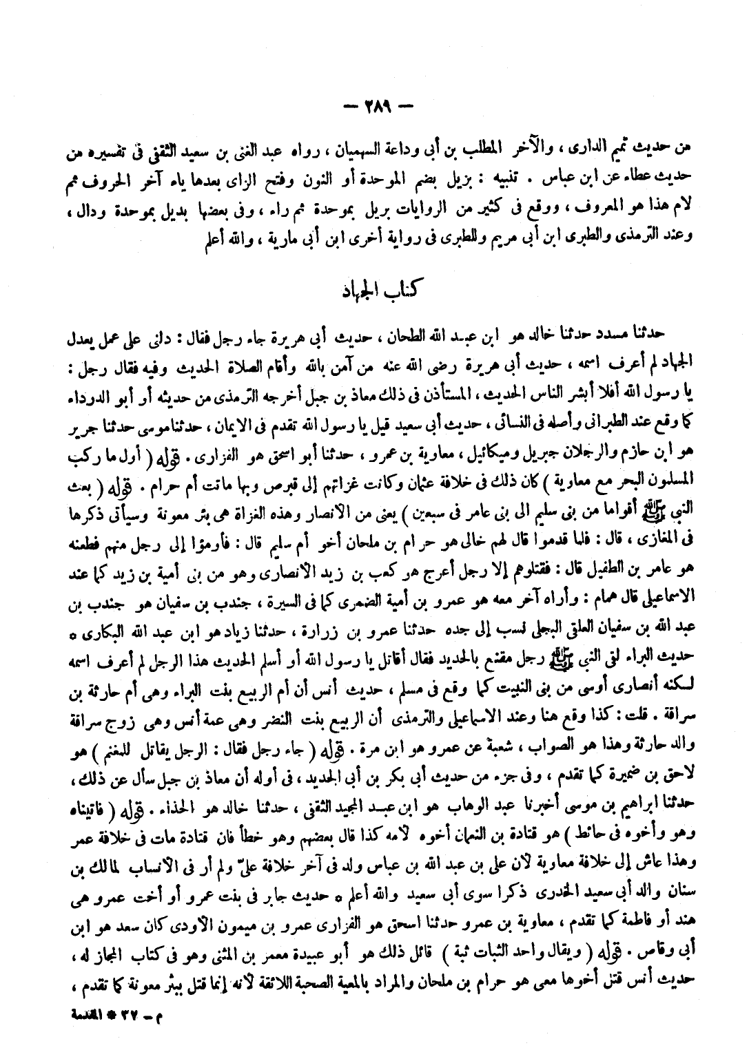 من حَدِيث تَمِيم الدَّارِيّ وَالْآخر الْمطلب بن أبي ودَاعَة السهميان رَوَاهُ عبد الْغَنِيّ بن سعيد الثَّقَفِيّ فِي تَفْسِيره من حَدِيث عَطاء عَن بن عَبَّاس تَنْبِيه بزيل بِضَم الْمُوَحدَة أَو النُّون وَفتح الزَّاي بعْدهَا يَاء آخر الْحُرُوف ثمَّ لَام هَذَا هُوَ الْمَعْرُوف وَوَقع فِي كثير من الرِّوَايَات بريل بموحدة ثمَّ رَاء وَفِي بَعْضهَا بديل بموحدة ودال وَعند التِّرْمِذِيّ والطبري بن أبي مَرْيَم وللطبري فِي رِوَايَة أُخْرَى بن أبي مَارِيَة وَالله أعلم كتاب الْجِهَاد حَدثنَا مُسَدّد حَدثنَا خَالِد هُوَ بن عبد الله الطَّحَّان حَدِيث أبي هُرَيْرَة جَاءَ رجل فَقَالَ دلَّنِي على عمل يعدل الْجِهَاد لم أعرف اسْمه حَدِيث أبي هُرَيْرَة رَضِي الله عَنهُ من آمن بِاللَّه وَأقَام الصَّلَاة الحَدِيث وَفِيه فَقَالَ رجل يَا رَسُول الله أَفلا أبشر النَّاس الحَدِيث المستأذن فِي ذَلِك معَاذ بن جبل أخرجه التِّرْمِذِيّ من حَدِيثه أَوْ أَبُو الدَّرْدَاءِ كَمَا وَقَعَ عِنْدَ الطَّبَرَانِيِّ وَأَصله فِي النَّسَائِيّ حَدِيث أبي سعيد قيل يَا رَسُول الله تقدم فِي الْأَيْمَان حَدثنَا مُوسَى حَدثنَا جرير هُوَ بن حَازِم وَالرجلَانِ جِبْرِيل وَمِيكَائِيل مُعَاوِيَة بن عَمْرو حَدثنَا أَبُو إِسْحَاق هُوَ الْفَزارِيّ قَوْله أَوَّلُ مَا رَكِبَ الْمُسْلِمُونَ الْبَحْرَ مَعَ مُعَاوِيَةَ كَانَ ذَلِك فِي خلَافَة عُثْمَان وَكَانَت غزاتهم إِلَى قبرص وَبهَا مَاتَت أم حرَام قَوْلُهُ بَعَثَ النَّبِيُّ صَلَّى اللَّهُ عَلَيْهِ وَسَلَّمَ أَقْوَامًا مِنْ بَنِي سُلَيْمٍ إِلَى بَنِي عَامِرٍ فِي سبعين يَعْنِي من الْأَنْصَار وَهَذِه الْغُزَاة هِيَ بِئْر مَعُونَة وَسَيَأْتِي ذكرهَا فِي الْمَغَازِي قَالَ فَلَمَّا قدمُوا قَالَ لَهُم خَالِي هُوَ حرَام بن ملْحَان أَخُو أم سليم قَالَ فأرموا إِلَى رجل مِنْهُم فطعنه هُوَ عَامر بن الطُّفَيْل قَالَ فَقَتَلُوهُمْ إِلَّا رجل أعرج هُوَ كَعْب بن زيد الْأنْصَارِيّ وَهُوَ من بني أُميَّة بن زيد كَمَا عِنْد الْإِسْمَاعِيلِيّ قَالَ همام وَأرَاهُ آخر مَعَه هُوَ عَمْرو بن أُميَّة الضمرِي كَمَا فِي السِّيرَة جُنْدُب بن سُفْيَان هُوَ جُنْدُب بن عبد الله بن سُفْيَان العلقي البَجلِيّ نسب إِلَى جده حَدثنَا عَمْرو بن زُرَارَة حَدثنَا زِيَاد هُوَ بن عبد الله البكاري حَدِيث الْبَراء لَقِي النَّبِي صلى الله عَلَيْهِ وَسلم رجل مقنع بالحديد فَقَالَ أقَاتل يَا رَسُول الله أَو أسلم الحَدِيث هَذَا الرجل لم أعرف اسْمه لكنه أَنْصَارِي أوسي من بني النبيت كَمَا وَقع فِي مُسلم حَدِيث أنس أَن أم الرّبيع بنت الْبَراء وَهِي أم حَارِثَة بن سراقَة قلت كَذَا وَقع هُنَا وَعند الْإِسْمَاعِيلِيّ وَالتِّرْمِذِيّ أَن الرّبيع بنت النَّضر وَهِي عمَّة أنس وَهِي زوج سراقَة وَالِد حَارِثَة وَهَذَا هُوَ الصَّوَاب شُعْبَة عَن عَمْرو هُوَ بن مرّة قَوْله جَاءَ رجل فَقَالَ الرجل يُقَاتل للمغنم هُوَ لَاحق بن ضميرَة كَمَا تقدم وَفِي جُزْء من حَدِيث أبي بكر بن أبي الْحَدِيد فِي أَوله أَن معَاذ بن جبل سَأَلَ عَن ذَلِك حَدثنَا إِبْرَاهِيم بن مُوسَى أخبرنَا عبد الْوَهَّاب هُوَ بن عبد الْمجِيد الثَّقَفِيّ حَدثنَا خَالِد هُوَ الْحذاء قَوْله فأتيناه وَهُوَ وَأَخُوهُ فِي حَائِط هُوَ قَتَادَة بن النُّعْمَان أَخُوهُ لأمه كَذَا قَالَ بَعضهم وَهُوَ خطأ فَإِن قَتَادَة مَاتَ فِي خلَافَة عمر وَهَذَا عَاشَ إِلَى خلَافَة مُعَاوِيَة لِأَن عَلِيَّ بْنَ عَبْدِ اللَّهِ بْنِ عَبَّاسٍ وُلِدَ فِي آخر خلَافَة عَليّ وَلم أر فِي الْأَنْسَاب لمَالِك بن سِنَان وَالِد أبي سعيد الْخُدْرِيّ ذكرا سوى أبي سعيد وَالله أعلم حَدِيث جَابر فِي بنت عَمْرو أَو أُخْت عَمْرو هِيَ هِنْد أَو فَاطِمَة كَمَا تقدم مُعَاوِيَة بن عَمْرو حَدثنَا إِسْحَاق هُوَ الْفَزارِيّ عَمْرو بن مَيْمُون الأودي كَ