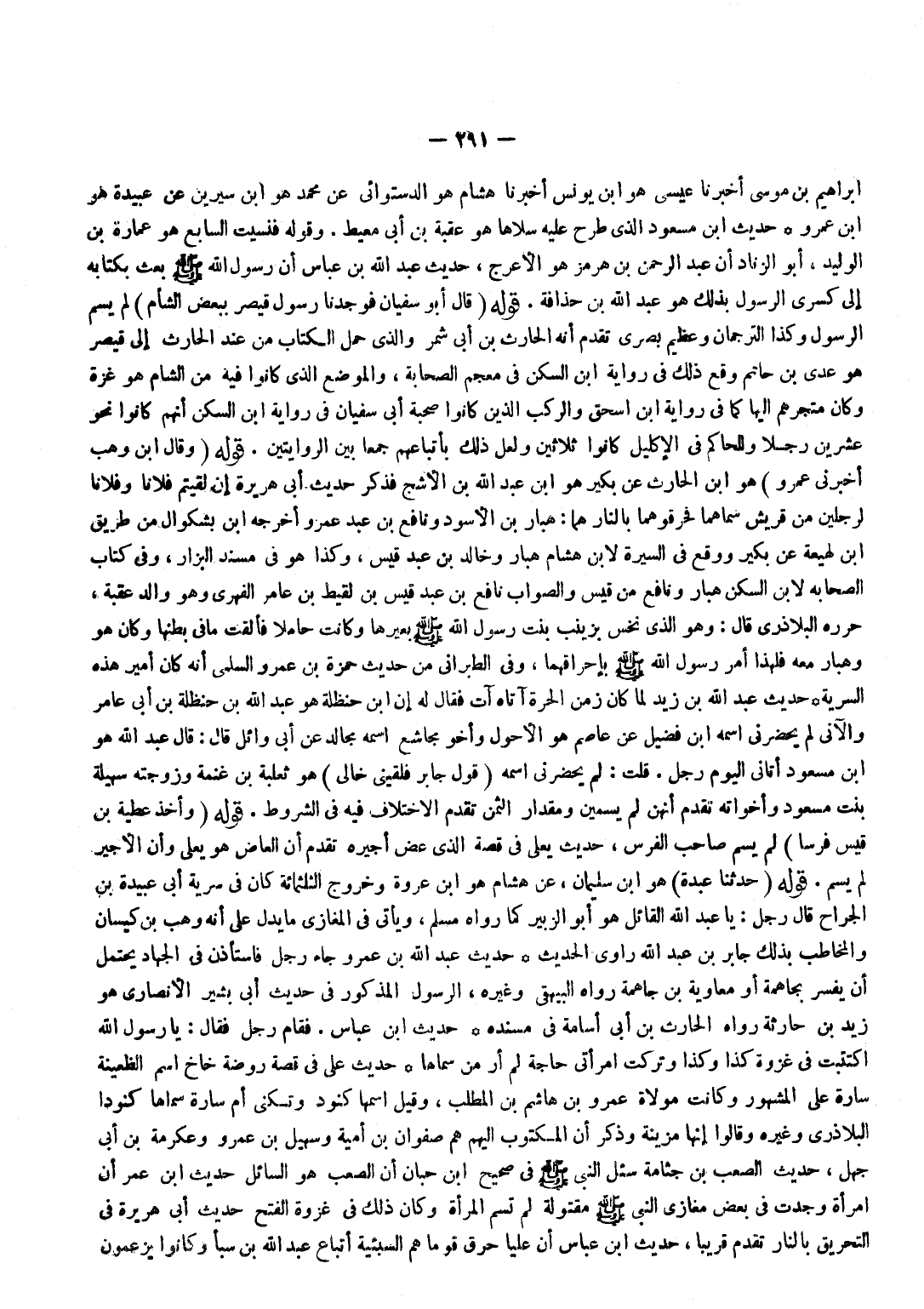 إِبْرَاهِيم بن مُوسَى أخبرنَا عِيسَى هُوَ بن يُونُس أخبرنَا هِشَام هُوَ الدستوَائي عَن مُحَمَّد هُوَ بن سِيرِين عَن عُبَيْدَة هُوَ بن عَمْرو حَدِيث بن مَسْعُود الَّذِي طرح عَلَيْهِ سلاها هُوَ عقبَة بن أبي معيط وَقَوله فنسيت السَّابِع هُوَ عمَارَة بن الْوَلِيد أَبُو الزِّنَادِ أَنَّ عَبْدَ الرَّحْمَنِ بْنُ هُرْمُزَ هُوَ الْأَعْرَج حَدِيث عبد الله بن عَبَّاسٍ أَنَّ رَسُولَ اللَّهِ صَلَّى اللَّهُ عَلَيْهِ وَسَلَّمَ بعث بكتابه إِلَى كسْرَى الرَّسُول بذلك هُوَ عبد الله بن حذافة قَوْله قَالَ أَبُو سُفْيَانَ فَوَجَدْنَا رَسُولَ قَيْصَرَ بِبَعْضِ الشَّام لم يسم الرَّسُول وَكَذَا الترجمان وعظيم بَصرِي تقدم أَنه الْحَارِث بن أبي شمر وَالَّذِي حمل الْكتاب من عِنْد الْحَارِث إِلَى قَيْصر هُوَ عدي بن حَاتِم وَقع ذَلِك فِي رِوَايَة بن السكن فِي مُعْجم الصَّحَابَة والموضع الَّذِي كَانُوا فِيهِ من الشَّام هُوَ غَزَّة وَكَانَ متجرهم إِلَيْهَا كَمَا فِي رِوَايَة بن إِسْحَاق والركب الَّذين كَانُوا صُحْبَة أبي سُفْيَان فِي رِوَايَة بن السكن أَنهم كَانُوا نَحْو عشْرين رجلا وللحاكم فِي الإكليل كَانُوا ثَلَاثِينَ وَلَعَلَّ ذَلِك بأتباعهم جمعا بَين الرِّوَايَتَيْنِ قَوْله وَقَالَ بن وهب أَخْبرنِي عَمْرو هُوَ بن الْحَارِث عَن بكير هُوَ بن عبد الله بن الْأَشَج فَذكر حَدِيث أبي هُرَيْرَة إِنْ لَقِيتُمْ فُلَانًا وَفُلَانًا لِرَجُلَيْنِ مِنْ قُرَيْشٍ سماهما فحرقوهما بالنَّار هما هَبَّار بن الْأسود وَنَافِع بن عبد عَمْرو أخرجه بن بشكوال من طَرِيق بن لَهِيعَة عَن بكير وَوَقع فِي السِّيرَة لِابْنِ هِشَام هَبَّار وخَالِد بن عبد قيس وَكَذَا هُوَ فِي مُسْند الْبَزَّار وَفِي كتاب الصَّحَابَة لِابْنِ السكن هَبَّار وَنَافِع من قيس وَالصَّوَاب نَافِع بن عبد قيس بن لَقِيط بن عَامر الفِهري وَهُوَ وَالِد عقبَة حَرَّره البلاذري قَالَ وَهُوَ الَّذِي نخس بِزَيْنَبَ بِنْتُ رَسُولِ اللَّهِ صَلَّى اللَّهُ عَلَيْهِ وَسَلَّمَ بَعِيرهَا وَكَانَت حَامِلا فَأَلْقَت مَا فِي بَطنهَا وَكَانَ هُوَ وَهَبَّار مَعَه فَلهَذَا أَمْرِ رَسُولِ اللَّهِ صَلَّى اللَّهُ عَلَيْهِ وَسَلَّمَ بإحراقهما وَفِي الطَّبَرَانِيّ من حَدِيث حَمْزَة بن عَمْرو السّلمِيّ أَنه كَانَ أَمِير هَذِه السّريَّة حَدِيث عبد الله بن زيد لما كَانَ زمن الْحرَّة آتَاهُ آتٍ فَقَالَ لَهُ إِن بن حَنْظَلَة هُوَ عَبْدَ اللَّهِ بْنَ حَنْظَلَةَ بْنِ أَبِي عَامِرٍ والآتي لم يحضرني اسْمه بن فُضَيْل عَن عَاصِم هُوَ الْأَحول وأخو مجاشع اسْمه مجَالد عَنْ أَبِي وَائِلٍ قَالَ قَالَ عَبْدُ اللَّهِ هُوَ بن مَسْعُود أَتَانِي الْيَوْم رجل قلت لم يحضرني اسْمه قَول جَابر فلقيني خَالِي هُوَ ثَعْلَبَة بن غنمة وَزَوجته سهيلة بنت مَسْعُود وأخواته تقدم أَنَّهُنَّ لم يسمين وَمِقْدَار الثّمن تقدم الِاخْتِلَاف فِيهِ فِي الشُّرُوط قَوْله وَأخذ عَطِيَّة بن قيس فرسا لم يسم صَاحب الْفرس حَدِيث يعلى فِي قصَّة الَّذِي عض أجيره تقدم أَن العاض هُوَ يعلى وَأَن الْأَجِير لم يسم قَوْله حَدثنَا عَبدة هُوَ بن سُلَيْمَان عَن هِشَام هُوَ بن عُرْوَة وَخُرُوج الثلثمائة كَانَ فِي سَرِيَّة أبي عُبَيْدَة بن الْجراح قَالَ رجل يَا عبد الله الْقَائِل هُوَ أَبُو الزبير كَمَا رَوَاهُ مُسلم وَيَأْتِي فِي الْمَغَازِي مَا يدل على أَنه وهب بن كيسَان والمخاطب بذلك جَابر بن عبد الله رَاوِي الحَدِيث حَدِيث عبد الله بن عَمْرو جَاءَ رجل فَاسْتَأْذن فِي الْجِهَاد يحْتَمل أَن يُفَسر بجاهمة أَو مُعَاوِيَة بن جاهمة رَوَاهُ الْبَيْهَقِيّ وَغَيره الرَّسُول الْمَذْكُور فِي حَدِيث أبي بشير الْأنْصَارِيّ هُوَ زيد بن حَارِثَة رَوَاهُ الْحَارِثُ بْنُ أَبِي أُسَامَةَ فِي مُسْنَدِهِ حَدِيث بن عَبَّاس فَقَامَ رجل فَقَالَ يَا رَسُول الله اكتتبت فِي غَزْوَة كَ