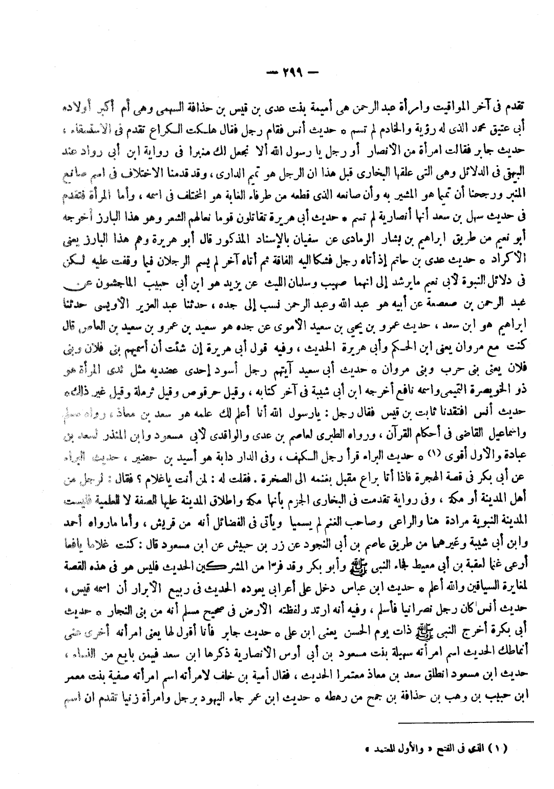 تقدم فِي آخر الْمَوَاقِيت وَامْرَأَة عبد الرَّحْمَن هِيَ أُمَيْمَة بنت عدي بن قيس بن حذافة السَّهْمِي وَهِي أم أكبر أَوْلَاده أبي عَتيق مُحَمَّد الَّذِي لَهُ رُؤْيَة وَالْخَادِم لم تسم حَدِيث أنس فَقَامَ رجل فَقَالَ هَلَكت الكراع تقدم فِي الاسْتِسْقَاء حَدِيث جَابر فَقَالَت امْرَأَة من الْأَنْصَار أَو رجل يَا رَسُول الله أَلا نجْعَل لَك منبرا فِي رِوَايَة بن أبي رواد عِنْد الْبَيْهَقِيّ فِي الدَّلَائِل وَهِي الَّتِي علقها البُخَارِيّ قبل هَذَا أَن الرجل هُوَ تَمِيم الدَّارِيّ وَقد قدمنَا الِاخْتِلَاف فِي اسْم صانع الْمِنْبَر ورجحنا أَن تميما هُوَ المشير بِهِ وَأَن صانعه الَّذِي قطعه من طرفاء الغابة هُوَ الْمُخْتَلف فِي اسْمه وَأما الْمَرْأَة فَتقدم فِي حَدِيث سهل بن سعد أَنَّهَا أنصارية لم تسم حَدِيث أبي هُرَيْرَة تقاتلون قوما نعَالهمْ الشّعْر وَهُوَ هَذَا البارز أخرجه أَبُو نُعَيْمٍ مِنْ طَرِيقِ إِبْرَاهِيمَ بْنِ بَشَّارٍ الرَّمَادِي عَن سُفْيَان بِالْإِسْنَادِ الْمَذْكُور قَالَ أَبُو هُرَيْرَةَ وَهُمْ هَذَا الْبَارِزُ يَعْنِي الأكراد حَدِيث عدي بن حَاتِم إِذْ أَتَاهُ رَجُلٌ فَشَكَا إِلَيْهِ الْفَاقَةَ ثُمَّ أَتَاهُ آخر لم يسم الرّجلَانِ فِيمَا وقفت عَلَيْهِ لَكِن فِي دَلَائِل النُّبُوَّة لأبي نعيم مَا يرشد إِلَى أَنَّهُمَا صُهَيْب وسلمان اللَّيْث عَن يزِيد هُوَ بن أبي حبيب الْمَاجشون عَن عبد الرَّحْمَن بن صعصعة عَن أَبِيه هُوَ عبد الله وَعبد الرَّحْمَن نسب إِلَى جده حَدثنَا عبد الْعَزِيز الأويسي حَدثنَا إِبْرَاهِيم هُوَ بن سعد حَدِيث عَمْرو بن يحيى بن سعيد الْأمَوِي عَن جده هُوَ سَعِيدُ بْنُ عَمْرِو بْنِ سَعِيدِ بْنِ الْعَاصِ قَالَ كنت مَعَ مَرْوَان يَعْنِي بن الحكم وَأبي هُرَيْرَة الحَدِيث وَفِيه قَول أبي هُرَيْرَة إِن شِئْت أَن أسميهم بني فلَان وَبني فلَان يَعْنِي بني حَرْب وَبني مَرْوَان حَدِيث أبي سعيد آيَتهم رجل أسود إِحْدَى عضديه مثل ثدي الْمَرْأَة هُوَ ذُو الْخوَيْصِرَة التَّمِيمِي واسْمه نَافِع أخرجه بن أبي شيبَة فِي آخر كِتَابه وَقيل حرقوص وَقيل ثرملة وَقيل غير ذَلِك حَدِيث أنس افتقدنا ثَابت بن قيس فَقَالَ رجل يَا رَسُول الله أَنا أعلم لَك علمه هُوَ سعد بن معَاذ رَوَاهُ مُسلم وَإِسْمَاعِيل القَاضِي فِي أَحْكَام الْقُرْآن وَرَوَاهُ الطَّبَرِيّ لعاصم بن عدي والواقدي لأبي مَسْعُود وبن الْمُنْذر لسعد بن عبَادَة وَالْأول أقوى حَدِيث الْبَراء قَرَأَ رجل الْكَهْف وَفِي الدَّار دَابَّة هُوَ أسيد بن حضير حَدِيث الْبَراء عَن أبي بكر فِي قصَّة الْهِجْرَة فَإِذا أَتَا براع مقبل بغنمه إِلَى الصَّخْرَة فَقلت لَهُ لمن أَنْت يَا غُلَام فَقَالَ لرجل من أهل الْمَدِينَة أَو مَكَّة وَفِي رِوَايَة تقدّمت فِي البُخَارِيّ الْجَزْم بِأَنَّهَا مَكَّة وَإِطْلَاق الْمَدِينَة عَلَيْهَا للصفة لَا للعلمية فَلَيْسَتْ الْمَدِينَة النَّبَوِيَّة مُرَادة هُنَا والراعي وَصَاحب الْغنم لم يسميا وَيَأْتِي فِي الْفَضَائِل أَنه من قُرَيْش وَأما مَا رَوَاهُ أَحْمد وبن أبي شيبَة وَغَيرهمَا مِنْ طَرِيقِ عَاصِمِ بْنِ أَبِي النَّجُودِ عَنْ زر بن حُبَيْش عَن بن مَسْعُود قَالَ كنت غُلَاما يافعا أرعى غنما لعقبة بن أبي معيط فجَاء النَّبِيِّ صَلَّى اللَّهُ عَلَيْهِ وَسَلَّمَ وَأَبُو بَكْرٍ وَقد فرا من الْمُشْركين الحَدِيث فَلَيْسَ هُوَ فِي هَذِه الْقِصَّة لمغايرة السياقين وَالله أعلم حَدِيث بن عَبَّاس دخل على أَعْرَابِي يعودهُ الحَدِيث فِي ربيع الْأَبْرَار أَن اسْمه قيس حَدِيث أنس كَانَ رجل نَصْرَانِيّا فَأسلم وَفِيه أَنه ارْتَدَّ ولفظته الأَرْض فِي صَحِيح مُسلم أَنه من بني النجار حَدِيث أبي بكرَة أخرج النَّبِيُّ صَلَّى اللَّهُ عَلَيْهِ وَسَلَّمَ ذَاتَ يَوْمٍ الْحسن يَعْنِي بن عَليّ حَدِيث جَابر فَأَنا أَقُول لَهَا يَعْنِي امْرَ