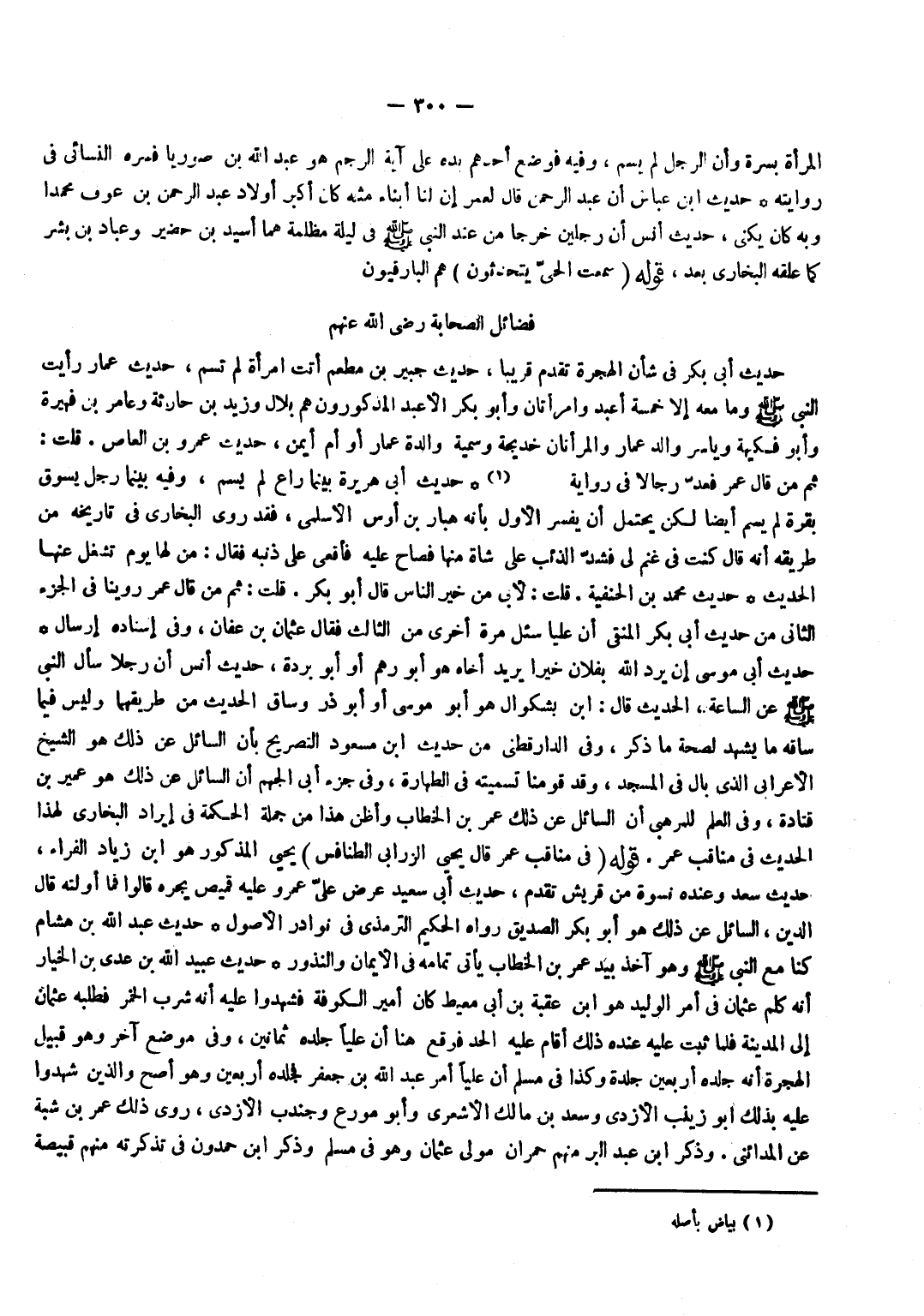 الْمَرْأَة بسرة وَأَن الرجل لم يسم وَفِيه فَوضع أحدهم يَده على آيَة الرَّجْم هُوَ عبد الله بن صوريا فسره النَّسَائِيّ فِي رِوَايَته حَدِيث بن عَبَّاس أَن عبد الرَّحْمَن قَالَ لعمر إِن لنا أَبنَاء مثله كَانَ أكبر أَوْلَاد عبد الرَّحْمَن بن عَوْف مُحَمَّدًا وَبِه كَانَ يكنى حَدِيث أنس أَن رجلَيْنِ خَرَجَا مِنْ عِنْدِ النَّبِيِّ صَلَّى اللَّهُ عَلَيْهِ وَسَلَّمَ فِي لَيْلَةِ مظْلمَة هَمَّا أَسُيْدُ بْنُ حَضِيرٍ وَعَبَّادُ بْنُ بِشْرٍ كَمَا علقه البُخَارِيّ بعد قَوْله سَمِعت الْحَيّ يتحدثون هم البارقيون ... فَضَائِل الصَّحَابَة رَضِي الله عَنْهُم حَدِيث أبي بكر فِي شَأْن الْهِجْرَة تقدم قَرِيبا حَدِيث جُبَير بن مطعم أَتَت امْرَأَة لم تسم حَدِيثُ عَمَّارٍ رَأَيْتُ النَّبِيَّ صَلَّى اللَّهُ عَلَيْهِ وَسلم وَمَا مَعَه إِلَّا خَمْسَة أعبد وَامْرَأَتَانِ وَأَبُو بكر الْأَعْبد المذكورون هم بِلَالٌ وَزَيْدُ بْنُ حَارِثَةَ وَعَامِرُ بْنُ فُهَيْرَةَ وَأَبُو فكيهة وياسر وَالِد عمار والمرأتان خَدِيجَة وَسُميَّة وَالِدَة عمار أَو أم أَيمن حَدِيث عَمْرو بن الْعَاصِ قلت ثمَّ من قَالَ عمر فعد رجَالًا فِي رِوَايَة بَيَاض حَدِيث أبي هُرَيْرَة بَيْنَمَا رَاع لم يسم وَفِيه بَيْنَمَا رجل يَسُوق بقرة لم يسم أَيْضا لَكِن يحْتَمل أَن يُفَسر الأول بِأَنَّهُ هَبَّار بن أَوْس الْأَسْلَمِيّ فقد روى البُخَارِيّ فِي تَارِيخه من طَرِيقه أَنه قَالَ كُنْتُ فِي غَنَمٍ لِي فَشَدَّ الذِّئْبُ على شَاة مِنْهَا فصاح عَلَيْهِ فأقعى على ذَنبه فَقَالَ من لَهَا يَوْم تشغل عَنْهَا الحَدِيث حَدِيث مُحَمَّد بن الْحَنَفِيَّة قلت لأبي من خير النَّاس قَالَ أَبُو بكر قلت ثمَّ من قَالَ عمر روينَا فِي الْجُزْء الثَّانِي من حَدِيث أبي بكر الْمُنْتَقى أَن عليا سُئِلَ مرّة أُخْرَى من الثَّالِث فَقَالَ عُثْمَان بن عَفَّان وَفِي إِسْنَاده إرْسَال حَدِيث أبي مُوسَى إِن يرد الله بفلان خيرا يُرِيد أَخَاهُ هُوَ أَبُو رهم أَو أَبُو بردة حَدِيثُ أَنَسٍ أَنَّ رَجُلًا سَأَلَ النَّبِيَّ صَلَّى اللَّهُ عَلَيْهِ وَسَلَّمَ عَنِ السَّاعَة الحَدِيث قَالَ بن بشكوال هُوَ أَبُو مُوسَى أَو أَبُو ذَر وسَاق الحَدِيث من طريقهما وَلَيْسَ فِيمَا سَاقه مَا يشْهد لصِحَّة مَا ذكر وَفِي الدَّارَقُطْنِيّ من حَدِيث بن مَسْعُود التَّصْرِيح بِأَن السَّائِل عَن ذَلِك هُوَ الشَّيْخ الْأَعرَابِي الَّذِي بَال فِي الْمَسْجِد وَقد قَومنَا تَسْمِيَته فِي الطَّهَارَة وَفِي جُزْء أبي الجهم أَن السَّائِل عَن ذَلِك هُوَ عُمَيْر بن قَتَادَة وَفِي الْعلم للمرهبي أَن السَّائِل عَن ذَلِك عمر بن الْخطاب وأظن هَذَا من جملَة الْحِكْمَة فِي إِيرَاد البُخَارِيّ لهَذَا الحَدِيث فِي مَنَاقِب عمر قَوْله فِي مَنَاقِب عمر قَالَ يحيى الزرابي الطنافس يحيى الْمَذْكُور هُوَ بن زِيَاد الْفراء حَدِيث سعد وَعِنْده نسْوَة من قُرَيْش تقدم حَدِيث أبي سعيد عرض عَليّ عَمْرو عَلَيْهِ قَمِيص يجره قَالُوا فَمَا أولته قَالَ الدّين السَّائِل عَن ذَلِك هُوَ أَبُو بكر الصّديق رَوَاهُ الْحَكِيم التِّرْمِذِيّ فِي نَوَادِر الْأُصُول حَدِيث عبد الله بن هِشَام كُنَّا مَعَ النَّبِيِّ صَلَّى اللَّهُ عَلَيْهِ وَسَلَّمَ وَهُوَ آخذ بيد عمر بن الْخطاب يَأْتِي تَمَامه فِي الْأَيْمَان وَالنُّذُور حَدِيث عبيد الله بن عدي بن الْخِيَار أَنه كلم عُثْمَان فِي أَمر الْوَلِيد هُوَ بن عقبَة بن أبي معيط كَانَ أَمِير الْكُوفَة فَشَهِدُوا عَلَيْهِ أَنه شرب الْخمر فَطَلَبه عُثْمَان إِلَى الْمَدِينَة فَلَمَّا ثَبت عَلَيْهِ عِنْده ذَلِك أَقَامَ عَلَيْهِ الْحَد فَوَقع هُنَا أَن عليا جلده ثَمَانِينَ وَفِي مَوضِع آخر وَهُوَ قبيل الْهِجْرَة أَنه جلده أَرْبَعِينَ جلدَة وَكَذَا فِي مُسلم أَن عليا أَمر عبد الله بن جَعْفَر فجلده أَرْبَعِينَ وَهُوَ أصح وَالَ