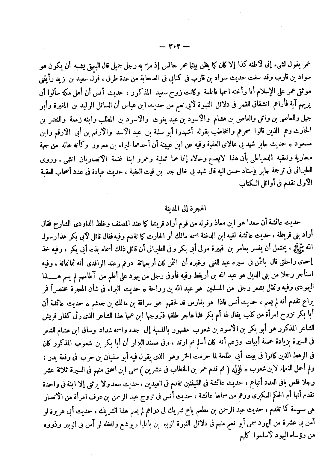 عُمَرَ يَقُولُ لِشَيْءٍ إِنِّي لَأَظُنُّهُ كَذَا إِلَّا كَانَ كَمَا يظنّ بَيْنَمَا عمر جَالس إِذْ مر بِهِ رجل جميل قَالَ الْبَيْهَقِيّ يشبه أَن يكون هُوَ سَواد بن قَارب وَقد سقت حَدِيث سَواد بن قَارب فِي كتابي فِي الصَّحَابَة من عدَّة طرق قَول سعيد بن زيد رَأَيْتُنِي مُوثِقِي عُمَرُ عَلَى الْإِسْلَامِ أَنَا وَأُخْتُهُ اسْمهَا فَاطِمَة وَكَانَت زوج سعيد الْمَذْكُور حَدِيث أنس أَن أهل مَكَّة سَأَلُوا أَن يُرِيهم آيَة فَأَرَاهُم انْشِقَاق الْقَمَر فِي دَلَائِل النُّبُوَّة لأبي نعيم من حَدِيث بن عَبَّاس أَن السَّائِل الْوَلِيد بن الْمُغيرَة وَأَبُو جهل والعاصي بن وَائِل والعاصي بن هِشَام وَالْأسود بن عبد يَغُوث وَالْأسود بن الْمطلب وَابْنه زَمعَة وَالنضْر بن الْحَارِث وهم الَّذين قَالُوا سحرهم والمخاطب بقوله أشهدوا أَبُو سَلمَة بن عبد الْأسد والأرقم بن أبي الأرقم وبن مَسْعُود حَدِيث جَابر شهد بِي خالاي الْعقبَة وَفِيه عَن بن عُيَيْنَة أَن أَحدهمَا الْبَراء بن معْرور وَكَأَنَّهُ خَاله من جِهَة مجارية وَتعقبه الدمياطي بِأَن هَذَا لَا يَصح وخالاه إِنَّمَا هما ثَعْلَبَة وَعَمْرو ابْنا غنمه الأنصاريان انْتهى وروى الطَّبَرَانِيّ فِي تَرْجَمَة جَابر بِإِسْنَاد حسن إِلَيْهِ قَالَ شهد بِي خَالِي جد بن قيث الْعقبَة حَدِيث عباده فِي عدد أَصْحَاب الْعقبَة الأولى تقدم فِي أَوَائِل الْكتاب ... الْهِجْرَة إِلَى الْمَدِينَة حَدِيث عَائِشَة أَن سَعْدا هُوَ بن معَاذ وَقَوله من قوم أَرَادَ قُريْشًا كَمَا عِنْد المُصَنّف وَغلط الدَّاودِيّ الشَّارِح فَقَالَ أَرَادَ بني قُرَيْظَة حَدِيث عَائِشَة لقِيه بن الدغنة اسْمه مَالك أَو الْحَارِث كَمَا تقدم وَفِيه فَقَالَ قَائِلٌ لِأَبِي بَكْرٍ هَذَا رَسُولُ اللَّهِ صَلَّى اللَّهُ عَلَيْهِ وَسَلَّمَ يحْتَمل أَن يُفَسر بعامر بن فهيره مولى أبي بكر وَفِي الطَّبَرَانِيّ أَن قَائِل ذَلِك أَسمَاء بنت أبي بكر وَفِيه خُذ إِحْدَى رَاحِلَتي قَالَ بِالثّمن فِي سيرة عبد الْغَنِيّ وَغَيره أَن الثّمن كَانَ أَرْبَعمِائَة دِرْهَم وَعند الْوَاقِدِيّ أَنه ثَمَانمِائَة وَفِيه اسْتَأْجر رجلا من بني الديل هُوَ عبد الله بن أريقط وَفِيه فأوفى رجل من يهود على أَطَم من آطامهم لم يسم هَذَا الْيَهُودِيّ وَفِيه وتمثل بِشعر رجل من الْمُسلمين هُوَ عبد الله بن رَوَاحه حَدِيث الْبَراء فِي شَأْن الْهِجْرَة مُخْتَصرا فَمر براع تقدم أَنه لم يسم حَدِيث أنس فَإِذا هُوَ بِفَارِس قد لحقهم هُوَ سراقَة بن مَالك بن جعْشم حَدِيث عَائِشَةَ أَنَّ أَبَا بَكْرٍ تَزَوَّجَ امْرَأَةً مِنْ كلب يُقَال لَهَا أم بكر فَلَمَّا هَاجر طَلقهَا فَتَزَوجهَا بن عَمها هَذَا الشَّاعِر الَّذِي رثى كفار قُرَيْش الشَّاعِر الْمَذْكُور هُوَ أَبُو بكر بن الْأسود بن شعوب مَشْهُور بِالنِّسْبَةِ إِلَى جده واسْمه شَدَّاد وسَاق بن هِشَام الشّعْر فِي السيره بِزِيَادَة خَمْسَة أَبْيَات وَزعم أَنه كَانَ أسلم ثمَّ ارْتَدَّ وَفِي مُسْند الْبَزَّار أَن أَبَا بكر بن شعوب الْمَذْكُور كَانَ فِي الرَّهْط الَّذين كَانُوا فِي بَيت أبي طَلْحَة لما حرمت الْخمر وَهُوَ الَّذِي يَقُول فِيهِ أَبُو سُفْيَان بن حَرْب فِي وقْعَة بدر وَلم أحمل النعماء لِابْنِ شعوب قَوْله ثُمَّ قَدِمَ عُمَرُ بْنُ الْخَطَّابِ فِي عِشْرِينَ سمي بن إِسْحَاق مِنْهُم فِي السيره ثَلَاثَة عشر رجلا فَلَعَلَّ بَاقِي الْعدَد أَتبَاع حَدِيث عَائِشَة فِي القينتين تقدم فِي الْعِيدَيْنِ حَدِيث سعد وَلَا يَرِثنِي الا ابْنة فِي وَاحِدَة تقدم أَنَّهَا أم الحكم الْكُبْرَى وَوهم من سَمَّاهَا عَائِشَة حَدِيث أنس فِي تزوج عبد الرَّحْمَن بن عَوْف امْرَأَة من الْأَنْصَار هِيَ سهيمه كَمَا تقدم حَدِيث عبد الرَّحْمَن بن مطعم بَاعَ شريك لي دَرَاهِم لم يسم هَذَا الشَّرِيك حَدِيث أبي هُرَيْرَة لَو آمن بِي عشرَة من الْيَه