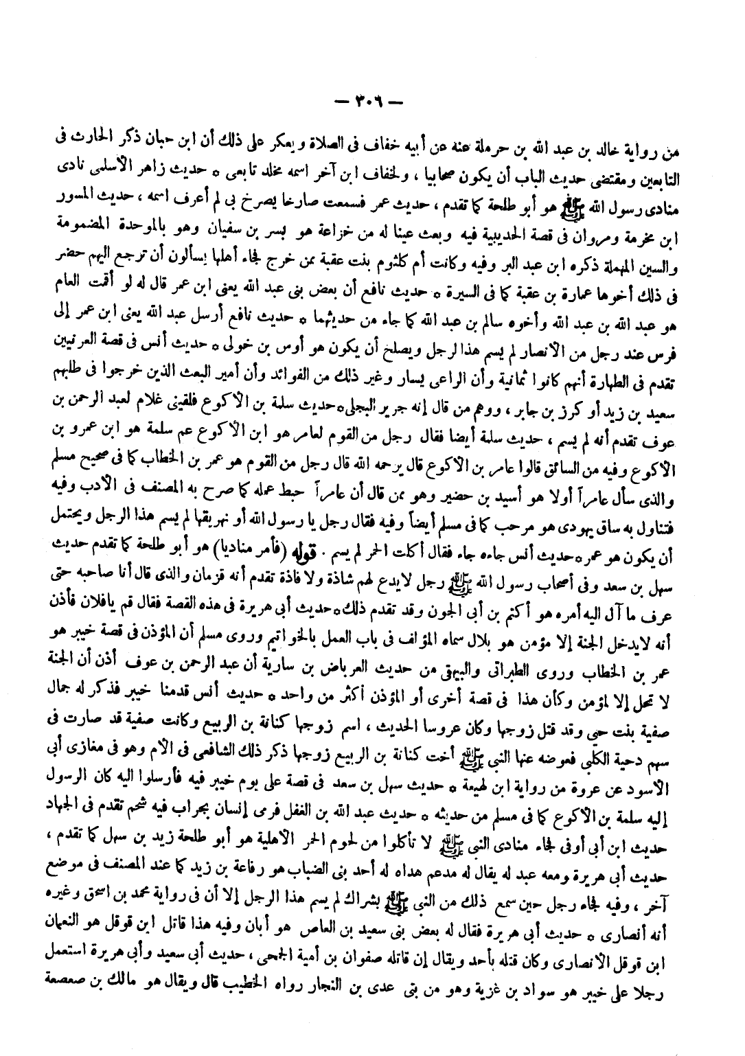 مِنْ رِوَايَةِ خَالِدِ بن عبد الله بن حَرْمَلَة عَنهُ عَن أَبِيه خفاف فِي الصَّلَاة وَيُعَكر على ذَلِك أَن بن حبَان ذكر الْحَارِث فِي التَّابِعين وَمُقْتَضى حَدِيث الْبَاب أَن يكون صحابيا ولخفاف بن آخر اسْمه مخلد تَابِعِيّ حَدِيث زَاهِر الْأَسْلَمِيّ نَادَى مُنَادِي رَسُولُ اللَّهِ صَلَّى اللَّهُ عَلَيْهِ وَسَلَّمَ هُوَ أَبُو طَلْحَةَ كَمَا تقدم حَدِيث عمر فَسمِعت صَارِخًا يصْرخ بِي لم أعرف اسْمه حَدِيث الْمسور بن مخرمَة ومروان فِي قصَّة الْحُدَيْبِيَة فِيهِ وَبعث عينا لَهُ من خُزَاعَة هُوَ بسر بن سُفْيَان وَهُوَ بِالْمُوَحَّدَةِ المضمومة وَالسِّين الْمُهْملَة ذكره بن عبد الْبر وَفِيه وَكَانَتْ أُمُّ كُلْثُومٍ بِنْتُ عُقْبَةَ مِمَّنْ خَرَجَ فجَاء أَهلهَا يسْأَلُون أَن ترجع إِلَيْهِم حضر فِي ذَلِك أَخُوهَا عمَارَة بن عقبَة كَمَا فِي السِّيرَة حَدِيث نَافِع أَن بعض بني عبد الله يَعْنِي بن عمر قَالَ لَهُ لَو أَقمت الْعَام هُوَ عبد الله بن عبد الله وَأَخُوهُ سَالم بن عبد الله كَمَا جَاءَ من حَدِيثهمَا حَدِيث نَافِع أرسل عبد الله يَعْنِي بن عمر إِلَى فرس عِنْد رجل من الْأَنْصَار لم يسم هَذَا الرجل وَيصْلح أَن يكون هُوَ أَوْس بن خولي حَدِيث أنس فِي قصَّة العرنيين تقدم فِي الطَّهَارَة أَنهم كَانُوا ثَمَانِيَة وَأَن الرَّاعِي يسَار وَغير ذَلِك من الْفَوَائِد وَأَن أَمِير الْبَعْث الَّذين خَرجُوا فِي طَلَبهمْ سعيد بن زيد أَو كرز بن جَابر وَوهم من قَالَ إِنَّه جرير البَجلِيّ حَدِيث سَلمَة بن الْأَكْوَع فلقيني غُلَام لعبد الرَّحْمَن بن عَوْف تقدم أَنه لم يسم حَدِيث سَلمَة أَيْضا فَقَالَ رجل من الْقَوْم لعامر هُوَ بن الْأَكْوَع عَم سَلمَة هُوَ بن عَمْرو بن الْأَكْوَع وَفِيه من السَّائِق قَالُوا عَامر بن الْأَكْوَع قَالَ يرحمه الله قَالَ رَجُلٌ مِنَ الْقَوْمِ هُوَ عُمَرُ بْنُ الْخَطَّابِ كَمَا فِي صَحِيح مُسلم وَالَّذِي سَأَلَ عَامِرًا أَولا هُوَ أسيد بن حضير وَهُوَ مِمَّن قَالَ أَن عَامِرًا حَبط عمله كَمَا صرح بِهِ المُصَنّف فِي الْأَدَب وَفِيه فَتَنَاول بِهِ سَاق يَهُودِيّ هُوَ مرحب كَمَا فِي مُسلم أَيْضا وَفِيه فَقَالَ رجل يَا رَسُول الله أَو نهريقها لم يسم هَذَا الرجل وَيحْتَمل أَن يكون هُوَ عمر حَدِيث أنس جَاءَهُ جَاءَ فَقَالَ أكلت الْحمر لم يسم قَوْله فَأمر مناديا هُوَ أَبُو طَلْحَة كَمَا تقدم حَدِيث سهل بن سعد وَفِي أَصْحَابِ رَسُولِ اللَّهِ صَلَّى اللَّهُ عَلَيْهِ وَسَلَّمَ رجل لَا يدع لَهُم شَاذَّة وَلَا فاذة تقدم أَنه قزمان وَالَّذِي قَالَ أَنا صَاحبه حَتَّى عرف مَا آل إِلَيْهِ أمره هُوَ أكتم بن أبي الجون وَقد تقدم ذَلِك حَدِيث أبي هُرَيْرَة فِي هَذِه الْقِصَّة فَقَالَ قُم يَا فلَان فَأذن أَنه لَا يدْخل الْجنَّة إِلَّا مُؤمن هُوَ بِلَال سَمَّاهُ الْمُؤلف فِي بَاب الْعَمَل بالخواتيم وروى مُسلم أَن الْمُؤَذّن فِي قصَّة خَيْبَر هُوَ عمر بن الْخطاب وروى الطَّبَرَانِيّ وَالْبَيْهَقِيّ من حَدِيث الْعِرْبَاض بن سَارِيَة أَن عبد الرَّحْمَن بن عَوْف أذن أَن الْجنَّة لَا تحل إِلَّا لمُؤْمِن وَكَأن هَذَا فِي قصَّة أُخْرَى أَو الْمُؤَذّن أَكثر من وَاحِد حَدِيث أنس قدمنَا خَيْبَر فَذكر لَهُ جَمَالُ صَفِيَّةَ بِنْتِ حُيَيٍّ وَقَدْ قُتِلَ زَوجهَا وَكَانَ عروسا الحَدِيث اسْم زَوجهَا كنَانَة بن الرّبيع وَكَانَت صَفِيَّة قد صَارَت فِي سهم دحْيَة الْكَلْبِيّ فَعوضهُ عَنْهَا النَّبِي صلى الله عَلَيْهِ وَسلم أُخْت كنَانَة بن الرّبيع زَوجهَا ذكر ذَلِك الشَّافِعِي فِي الْأُم وَهُوَ فِي مغازي أبي الْأسود عَن عُرْوَة من رِوَايَة بن لَهِيعَة حَدِيثَ سَهْلِ بْنِ سَعْدٍ فِي قِصَّةِ عَلِيٍّ يَوْم خَيْبَر فِيهِ فأرسلوا إِلَيْهِ كَانَ الرَّسُول إِلَيْهِ سَلمَة بن الْأَكْوَع كَمَا فِي مُسلم من حَدِيثه حَدِيث عبد الله بن الْمُغَفَّل ف