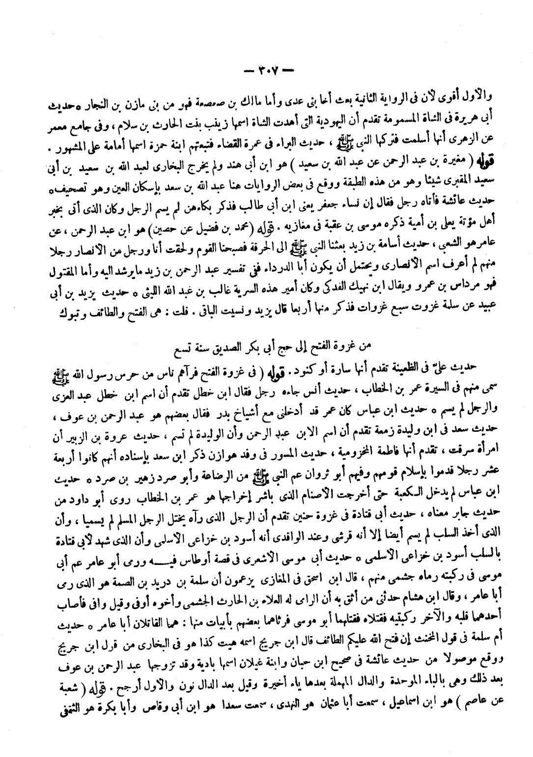 وَالْأول أقوى لِأَن فِي الرِّوَايَة الثَّانِيَة بعث أَخا بني عدي وَأما مَالك بن صعصعة فَهُوَ من بني مَازِن بن النجار حَدِيث أبي هُرَيْرَة فِي الشَّاة المسمومة تقدم أَن الْيَهُودِيَّة الَّتِي أَهْدَت الشَّاة اسْمهَا زَيْنَب بنت الْحَارِث بن سَلام وَفِي جَامع معمر عَن الزُّهْرِيّ أَنَّهَا أسلمت فَتَركهَا النَّبِي صلى الله عَلَيْهِ وَسلم حَدِيث الْبَراء فِي عمْرَة الْقَضَاء فتبعتهم ابْنة حَمْزَة اسْمهَا أُمَامَة على الْمَشْهُور قَوْله مُغيرَة بْنِ عَبْدِ الرَّحْمَنِ عَنْ عَبْدِ اللَّهِ بْنِ سعيد هُوَ بن أبي هِنْد وَلم يخرج البُخَارِيّ لعبد الله بن سعيد بن أبي سعيد المَقْبُري شَيْئا وَهُوَ من هَذِه الطَّبَقَة وَوَقع فِي بعض الرِّوَايَات هُنَا عبد الله بن سعد بِإِسْكَان الْعين وَهُوَ تَصْحِيف حَدِيث عَائِشَة فَأَتَاهُ رجل فَقَالَ إِن نسَاء جَعْفَر يَعْنِي بن أبي طَالب فَذكر بكاءهن لم يسم الرجل وَكَانَ الَّذِي أَتَى بِخَبَر أهل مُؤْتَة يعلى بن أُميَّة ذكره مُوسَى بن عقبَة فِي مغازيه قَوْله مُحَمَّد بن فُضَيْل عَن حُصَيْن هُوَ بن عبد الرَّحْمَن عَن عَامر هُوَ الشّعبِيّ حَدِيث أُسَامَة بن زيد بَعَثَنَا النَّبِيُّ صَلَّى اللَّهُ عَلَيْهِ وَسَلَّمَ إِلَى الحرقة فصبحنا الْقَوْم وَلَحِقت أَنا وَرجل من الْأَنْصَار رجلا مِنْهُم لم أعرف اسْم الْأنْصَارِيّ وَيحْتَمل أَن يكون أَبَا الدَّرْدَاء فَفِي تَفْسِير عبد الرَّحْمَن بن زيد مَا يرشد إِلَيْهِ وَأما الْمَقْتُول فَهُوَ مرداس بن عَمْرو وَيُقَال بن نهيك الفدكي وَكَانَ أَمِير هَذِه السّريَّة غَالب بن عبد الله اللَّيْثِيّ حَدِيث يزِيد بن أبي عبيد عَن سَلمَة غزوت سبع غزوات فَذكر مِنْهَا أَرْبعا قَالَ يزِيد ونسيت الْبَاقِي قلت هِيَ الْفَتْح والطائف وتبوك ... من غَزْوَة الْفَتْح إِلَى حج أبي بكر الصّديق سنة تسع حَدِيث عَليّ فِي الظعينة تقدم أَنَّهَا سارة أَو كنُود قَوْله فِي غَزْوَة الْفَتْح فَرَآهُمْ نَاسٌ مِنْ حَرَسِ رَسُولِ اللَّهِ صَلَّى الله عَلَيْهِ وَسلم سمي مِنْهُم فِي السِّيرَة عمر بن الْخطاب حَدِيث أنس جَاءَهُ رجل فَقَالَ بن خطل تقدم أَن اسْم بن خطل عبد الْعُزَّى وَالرجل لم يسم حَدِيث بن عَبَّاس كَانَ عمر قد أدخلني مَعَ أَشْيَاخ بدر فَقَالَ بَعضهم هُوَ عبد الرَّحْمَن بن عَوْف حَدِيث سعد فِي بن وليدة زَمعَة تقدم أَن اسْم الابْن عبد الرَّحْمَن وَأَن الوليدة لم تسم حَدِيث عُرْوَة بن الزبير أَن امْرَأَة سرقت تقدم أَنَّهَا فَاطِمَة المخزومية حَدِيث الْمسور فِي وَفد هوَازن ذكر بن سعد بِإِسْنَادِهِ أَنهم كَانُوا أَرْبَعَة عشر رجلا قدمُوا بِإِسْلَام قَومهمْ وَفِيهِمْ أَبُو ثروان عَمُّ النَّبِيُّ صَلَّى اللَّهُ عَلَيْهِ وَسَلَّمَ مِنَ الرَّضَاعَةِ وَأَبُو صرد زُهَيْر بن صرد حَدِيث بن عَبَّاس لم يدْخل الْكَعْبَة حَتَّى أخرجت الْأَصْنَام الَّذِي بَاشر إخْرَاجهَا هُوَ عمر بن الْخطاب روى أَبُو دَاوُد من حَدِيث جَابر مَعْنَاهُ حَدِيث أبي قَتَادَة فِي غَزْوَة حنين تقدم أَن الرجل الَّذِي رَآهُ يخْتل الرجل الْمُسلم لم يسميا وَأَن الَّذِي أَخذ السَّلب لم يسم أَيْضا إِلَّا أَنه قرشي وَعند الْوَاقِدِيّ أَنه أسود بن خزاعي الْأَسْلَمِيّ وَأَن الَّذِي شهد لأبي قَتَادَة بالسلب أسود بن خزاعي الْأَسْلَمِيّ حَدِيث أبي مُوسَى الْأَشْعَرِيّ فِي قصَّة أَوْطَاس فِيهِ وَرمى أَبُو عَامر عَم أبي مُوسَى فِي ركبته رَمَاه جشمي مِنْهُم قَالَ بن إِسْحَاق فِي الْمَغَازِي يَزْعمُونَ أَنَّ سَلَمَةَ بْنَ دُرَيْدِ بْنِ الصِّمَّةِ هُوَ الَّذِي رمى أَبَا عَامر وَقَالَ بن هِشَام حَدثنِي من أَثِق بِهِ أَن الرَّامِي لَهُ الْعَلَاء بن الْحَارِث الْجُشَمِي وَأَخُوهُ أوفى وَقيل وافي فَأصَاب أَحدهمَا قلبه وَالْآخر رُكْبَتَيْهِ فقتلاه فَقَتَلَهُمَا أَبُو مُوسَى فرثاهما بَعضهم بِأَبْيَات مِنْهَا هما القاتلان