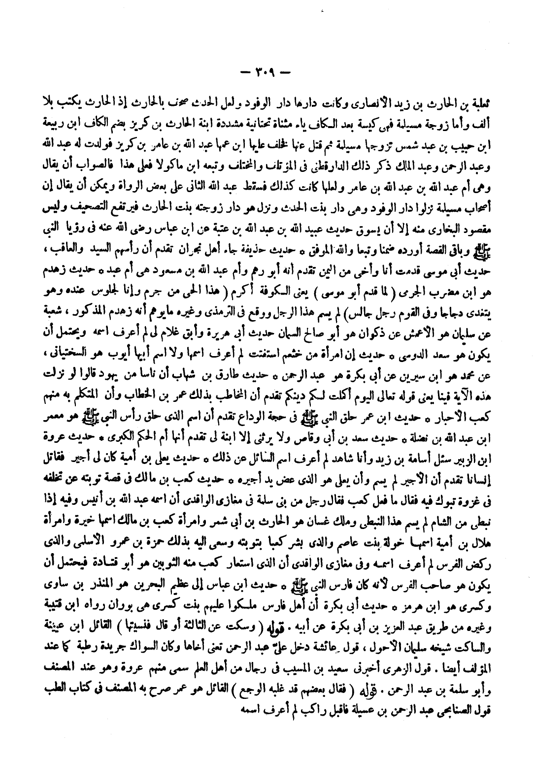 ثَعْلَبَة بن الْحَارِث بن زيد الْأنْصَارِيّ وَكَانَت دارها دَار الْوُفُود وَلَعَلَّ الْحَدث صحف بِالْحَارِثِ إِذْ الْحَارِث يكْتب بِلَا ألف وَأما زَوْجَة مُسَيْلمَة فَهِيَ كيسة بعد الْكَاف يَاء مثناة تَحْتَانِيَّة مُشَدّدَة ابْنة الْحَارِث بن كريز بِضَم الْكَاف بْنِ رَبِيعَةَ بْنِ حَبِيبِ بْنِ عَبْدِ شَمْسٍ تزَوجهَا مُسَيْلمَة ثمَّ قتل عَنْهَا فخلف عَلَيْهَا بن عَمها عبد الله بن عَامر بن كريز فَولدت لَهُ عبد الله وَعبد الرَّحْمَن وَعبد الْملك ذكر ذَلِك الدَّارَقُطْنِيّ فِي المؤتلف والمختلف وَتَبعهُ بن مَاكُولَا فعلى هَذَا فَالصَّوَاب أَن يُقَال وَهِي أُمُّ عَبْدِ اللَّهِ بْنِ عَبْدِ اللَّهِ بْنِ عَامر ولعلها كَانَت كَذَلِك فَسقط عبد الله الثَّانِي على بعض الروَاة وَيُمكن أَن يُقَال إِن أَصْحَاب مُسَيْلمَة نزلُوا دَار الْوُفُود وَهِي دَار بنت الْحَدث وَنزل هُوَ دَار زَوجته بنت الْحَارِث فيرتفع التَّصْحِيف وَلَيْسَ مَقْصُود البُخَارِيّ مِنْهُ إِلَّا أَن يَسُوق حَدِيث عُبَيْدِ اللَّهِ بْنِ عَبْدِ اللَّهِ بْنِ عُتْبَةَ عَن بن عَبَّاس رَضِي الله عَنهُ فِي رُؤْيَا النَّبِيِّ صَلَّى اللَّهُ عَلَيْهِ وَسَلَّمَ وَبَاقِي الْقِصَّة أوردهُ ضمنا وتبعا وَالله الْمُوفق حَدِيث حُذَيْفَة جَاءَ أهل نَجْرَان تقدم أَن رَأْسهمْ السَّيِّد وَالْعَاقِب حَدِيث أبي مُوسَى قدمت أَنا وَأخي من الْيمن تقدم أَنه أَبُو رهم وَأم عبد الله بن مَسْعُود هِيَ أم عبد حَدِيث زَهْدَم هُوَ بن مضرب الْجرْمِي لما قدم أَبُو مُوسَى يَعْنِي الْكُوفَة أكْرم هَذَا الْحَيّ من جرم وَإِنَّا لجُلُوس عِنْده وَهُوَ يتغدى دجاجا وَفِي الْقَوْم رجل جَالس لم يسم هَذَا الرجل وَوَقع فِي التِّرْمِذِيّ وَغَيره مَا يُوهم أَنه زَهْدَم الْمَذْكُور شُعْبَة عَن سُلَيْمَان هُوَ الْأَعْمَش عَن ذكْوَان هُوَ أَبُو صَالح السمان حَدِيث أبي هُرَيْرَة وأبق غُلَام لي لم أعرف اسْمه وَيحْتَمل أَن يكون هُوَ سعد الدوسي حَدِيث إِن امْرَأَة من خثعم استفتت لم أعرف اسْمهَا وَلَا اسْم أَبِيهَا أَيُّوب هُوَ السّخْتِيَانِيّ عَن مُحَمَّد هُوَ بن سِيرِين عَن أبي بكرَة هُوَ عبد الرَّحْمَن حَدِيث طَارق بن شهَاب أَن نَاسا من يهود قَالُوا لَو نزلت هَذِه الْآيَة فِينَا يَعْنِي قَوْله تَعَالَى الْيَوْم أكملت لكم دينكُمْ تقدم أَن الْمُخَاطب بذلك عمر بن الْخطاب وَأَن الْمُتَكَلّم بِهِ مِنْهُم كَعْب الْأَحْبَار حَدِيث بن عمر حلق النَّبِيُّ صَلَّى اللَّهُ عَلَيْهِ وَسَلَّمَ فِي حَجَّةِ الْوَدَاعِ تقدم أَن اسْم الَّذِي حلق رَأس النَّبِي صلى الله عَلَيْهِ وَسلم هُوَ مَعْمَرُ بْنُ عَبْدِ اللَّهِ بْنِ نَضْلَةَ حَدِيث سعد بن أبي وَقاص وَلَا يَرِثنِي إِلَّا ابْنة لي تقدم أَنَّهَا أم الحكم الْكُبْرَى حَدِيث عُرْوَة بن الزبير سُئِلَ أُسَامَة بن زيد وَأَنا شَاهد لم أعرف اسْم السَّائِل عَن ذَلِك حَدِيث يعلى بن أُميَّة كَانَ لي أجِير فقاتل إنْسَانا تقدم أَن الْأَجِير لم يسم وَأَن يعلى هُوَ الَّذِي عض يَد أجيره حَدِيثِ كَعْبِ بْنِ مَالِكٍ فِي قِصَّةِ تَوْبَتِهِ عَن تخلفه فِي غَزْوَة تَبُوك فِيهِ فَقَالَ مَا فعل كَعْب فَقَالَ رجل من بني سَلمَة فِي مغازي الْوَاقِدِيّ أَن اسْمه عبد الله بن أنيس وَفِيه إِذا نبطي من الشَّام لم يسم هَذَا النبطي وَملك غَسَّان هُوَ الْحَارِث بن أبي شمر وَامْرَأَة كَعْب بن مَالك اسْمهَا خيرة وَامْرَأَة هِلَال بن أُميَّة اسْمهَا خَوْلَة بنت عَاصِم وَالَّذِي بشر كَعْبًا بتوبته وسعى إِلَيْهِ بذلك حَمْزَة بن عَمْرو الْأَسْلَمِيّ وَالَّذِي ركض الْفرس لم أعرف اسْمه وَفِي مغازي الْوَاقِدِيّ أَن الَّذِي اسْتعَار كَعْب مِنْهُ الثَّوْبَيْنِ هُوَ أَبُو قَتَادَة فَيحْتَمل أَن يكون هُوَ صَاحب الْفرس لِأَنَّهُ كَانَ فَارس النَّبِي صلى الله عَلَيْهِ وَسلم حَدِيث بن عَبَّاس إِلَى عَظِيمِ الْبَ