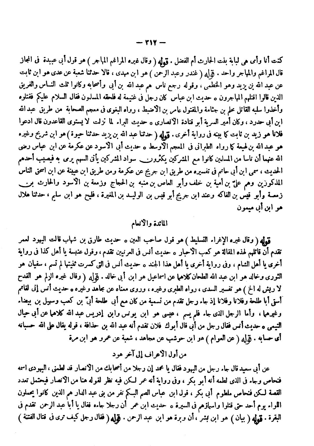 كنت أَنا وَأمي هِيَ لبَابَة بنت الْحَارِث أم الْفضل قَوْله وَقَالَ غَيره المراغم المُهَاجر هُوَ قَول أبي عُبَيْدَة فِي الْمجَاز قَالَ المراغم وَالْمُهَاجِر وَاحِد قَوْله غنْدر وَعبد الرَّحْمَن هُوَ بن مهْدي قَالَا حَدثنَا شُعْبَة عَن عدي هُوَ بْنِ ثَابِتٍ عَنْ عَبْدِ اللَّهِ بْنِ يَزِيدَ وَهُوَ الخطمي وَقَوله رَجَعَ نَاس هم عبد الله بن أبي وَأَصْحَابه وَكَانُوا ثلث النَّاس والفريق الَّذين قَالُوا اقتلهم الْمُهَاجِرُونَ حَدِيث بن عَبَّاس كَانَ رجل فِي غنيمَة لَهُ فَلحقه الْمُسلمُونَ فَقَالَ السَّلَام عَلَيْكُم فَقَتَلُوهُ وَأخذُوا سلبه الْقَاتِل محلم بن جثامة والمقتول عَامر بن الأضبط رَوَاهُ الْبَغَوِيّ فِي مُعْجم الصَّحَابَة من طَرِيق عبد الله بن أبي حَدْرَد وَكَانَ أَمِير السّريَّة أَبُو قَتَادَة الْأنْصَارِيّ حَدِيث الْبَراء لما نزلت لَا يَسْتَوِي الْقَاعِدُونَ قَالَ ادعوا فلَانا هُوَ زيد بن ثَابت كَمَا بَينه فِي رِوَايَة أُخْرَى قَوْله حَدثنَا عبد الله بن يزِيد حَدثنَا حَيْوَة هُوَ بن شُرَيْح وَغَيره هوعبد الله بن لَهِيعَة كَمَا رَوَاهُ الطَّبَرَانِيّ فِي المعجم الْأَوْسَط حَدِيث أبي الْأسود عَن عِكْرِمَة عَن بن عَبَّاس رَضِي الله عَنْهُمَا أَنَّ نَاسًا مِنَ الْمُسْلِمِينَ كَانُوا مَعَ الْمُشْرِكِينَ يكثرون سَواد الْمُشْركين يَأْتِي السهْم يَرْمِي بِهِ فَيُصِيب أحدهم الحَدِيث سمي بن أبي حَاتِم فِي تَفْسِيره من طَرِيق بن جريج عَن عِكْرِمَة وَمن طَرِيق بن عُيَيْنَة عَن بن إِسْحَاق النَّاس الْمَذْكُورين وهم عَليّ بن أُميَّة بن خلف وَأَبُو الْعَاصِ بن مُنَبّه بن الْحجَّاج وَزَمعَة بن الْأسود والْحَارث بن زَمعَة وَأَبُو قيس بن الْفَاكِه وَعند بن جريج أَبُو قيس بن الْوَلِيد بن الْمُغيرَة فليح هُوَ بن سليم حَدثنَا هِلَال هُوَ بن أبي مَيْمُون ... الْمَائِدَة والأنعام قَوْله وَقَالَ غَيره الإغراء التسليط هُوَ قَول صَاحب الْعين حَدِيث طَارق بن شهَاب قَالَت الْيَهُود لعمر تقدم أَن قَائِلهمْ لهَذِهِ الْمقَالة هُوَ كَعْب الْأَحْبَار حَدِيث أنس فِي العرنيين تقدم وَقَول عَنْبَسَة يَا أهل كَذَا فِي رِوَايَة أُخْرَى يَا أهل الشَّام وَفِي رِوَايَة أُخْرَى يَا أهل هَذَا الْجند حَدِيث أنس فِي الَّتِي كسرت ثنيتها لم تسم سُفْيَان هُوَ الثَّوْريّ وخَالِد هُوَ بن عبد الله الطَّحَّان كِلَاهُمَا عَن إِسْمَاعِيل هُوَ بن أبي خَالِد قَوْله وَقَالَ غَيره الزلم هُوَ الْقدح لَا ريش لَهُ الخ هُوَ تَفْسِير السّديّ رَوَاهُ الطَّبَرِيّ وَغَيره وروى مَعْنَاهُ عَن مُجَاهِد وَغَيره حَدِيث أنس إِنِّي لَقَائِمٌ أَسْقِي أَبَا طَلْحَةَ وَفُلَانًا وَفُلَانًا إِذْ جَاءَ رجل تقدم من تَسْمِيَة من كَانَ مَعَ أبي طَلْحَة أبي بن كَعْب وَسُهيْل بن بَيْضَاء وَغَيرهمَا وَأما الرجل الَّذِي جَاءَ فَلم يسم عِيسَى هُوَ بن يُونُس وبن إِدْرِيس عبد الله كِلَاهُمَا عَن أبي حِيَال التَّيْمِيّ حَدِيث أنس فَقَالَ رَجُلٌ مَنْ أَبِي قَالَ أَبُوكَ فُلَانٌ تقدم أَنه عبد الله بن حذافة قَوْلُهُ يُقَالُ عَلَى اللَّهِ حُسْبَانُهُ أَيْ حِسَابُهُ قَوْله عَن الْعَوام هُوَ بن حَوْشَب عَن مُجَاهِد شُعْبَة عَن عَمْرو هُوَ بن مرّة ... من أول الْأَعْرَاف إِلَى آخر هود عَن أبي سعيد قَالَ جَاءَ رجل من الْيَهُود فَقَالَ يَا مُحَمَّد إِن رجلا من أَصْحَابك من الْأَنْصَار قد لطمني الْيَهُودِيّ اسْمه فنحَاص وَجَاء فِي الَّذِي لطمه أَنه أَبُو بكر وَفِي رِوَايَة أَنه عمر لَكِن فِيهِ نظر لقَوْله هُنَا من الْأَنْصَار فَيحْتَمل تعدد الْقِصَّة لَكِن فنحَاص ملطوم أبي بكر قَول بن عَبَّاس الصم الْبكم نفر من بني عبد الدَّار هم الَّذين كَانُوا يحملون اللِّوَاء يَوْم أحد حَتَّى قتلوا واسماؤهم فِي السِّيرَة حَدِيث بن عمر أَن رجلا جَاءَهُ فَقَالَ يَا أَبَا عبد الرَّحْمَن تقدم فِي الْبَقَرَة ق