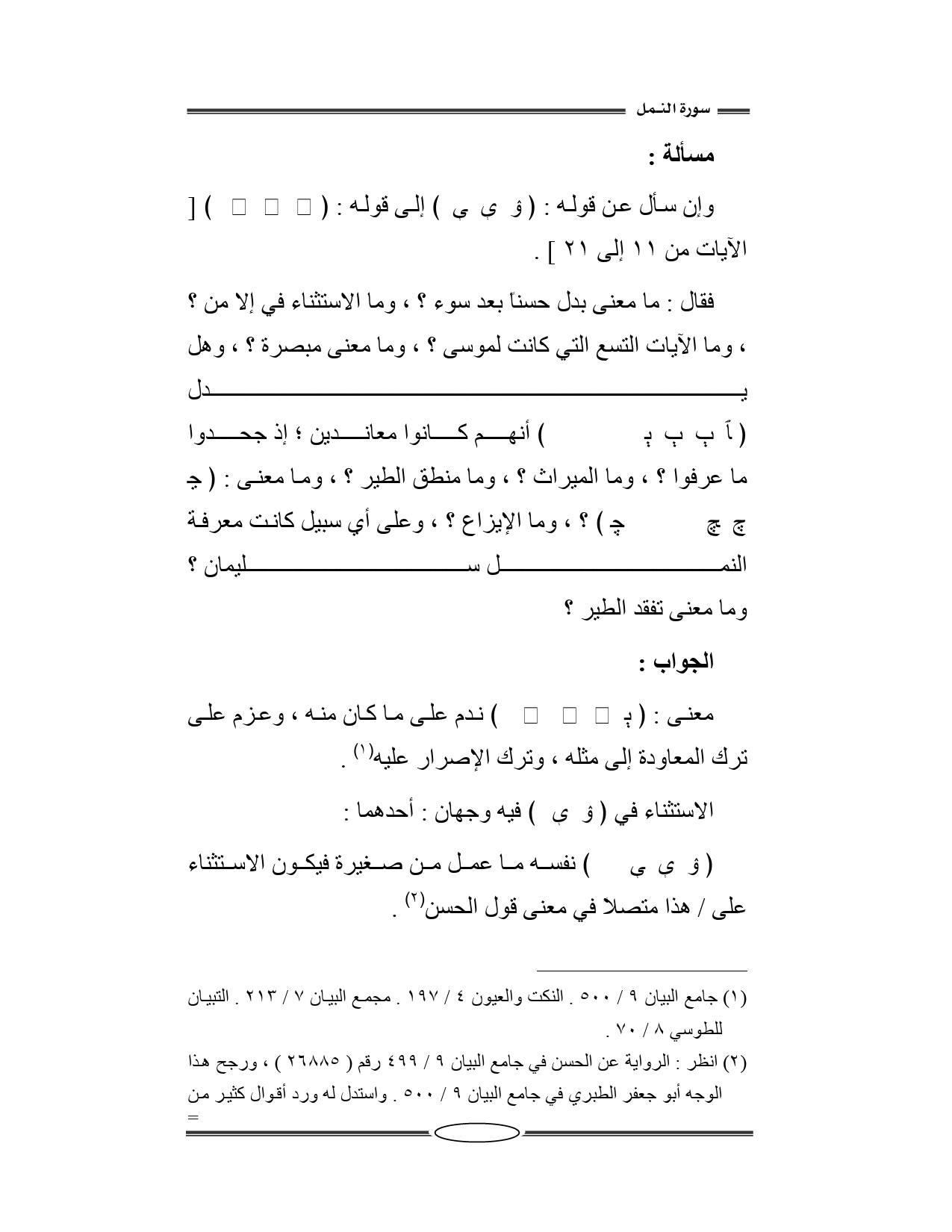 وإن سأل عن قوله: {إِلَّا مَنْ ظَلَمَ ثُمَّ بَدَّلَ حُسْنًا بَعْدَ سُوءٍ فَإِنِّي غَفُورٌ رَحِيمٌ (11) وَأَدْخِلْ يَدَكَ فِي جَيْبِكَ تَخْرُجْ بَيْضَاءَ مِنْ غَيْرِ سُوءٍ فِي تِسْعِ آيَاتٍ إِلَى فِرْعَوْنَ وَقَوْمِهِ إِنَّهُمْ كَانُوا قَوْمًا فَاسِقِينَ (12) فَلَمَّا جَاءَتْهُمْ آيَاتُنَا مُبْصِرَةً قَالُوا هَذَا سِحْرٌ مُبِينٌ (13) وَجَحَدُوا بِهَا وَاسْتَيْقَنَتْهَا أَنْفُسُهُمْ ظُلْمًا وَعُلُوًّا فَانْظُرْ كَيْفَ كَانَ عَاقِبَةُ الْمُفْسِدِينَ (14) وَلَقَدْ آتَيْنَا دَاوُودَ وَسُلَيْمَانَ عِلْمًا وَقَالَا الْحَمْدُ لِلَّهِ الَّذِي فَضَّلَنَا عَلَى كَثِيرٍ مِنْ عِبَادِهِ الْمُؤْمِنِينَ (15) وَوَرِثَ سُلَيْمَانُ دَاوُودَ وَقَالَ يَا أَيُّهَا النَّاسُ عُلِّمْنَا مَنْطِقَ الطَّيْرِ وَأُوتِينَا مِنْ كُلِّ شَيْءٍ إِنَّ هَذَا لَهُوَ الْفَضْلُ الْمُبِينُ (16) وَحُشِرَ لِسُلَيْمَانَ جُنُودُهُ مِنَ الْجِنِّ وَالْإِنْسِ وَالطَّيْرِ فَهُمْ يُوزَعُونَ (17) حَتَّى إِذَا أَتَوْا عَلَى وَادِ النَّمْلِ قَالَتْ نَمْلَةٌ يَا أَيُّهَا النَّمْلُ ادْخُلُوا مَسَاكِنَكُمْ لَا يَحْطِمَنَّكُمْ سُلَيْمَانُ وَجُنُودُهُ وَهُمْ لَا يَشْعُرُونَ (18) فَتَبَسَّمَ ضَاحِكًا مِنْ قَوْلِهَا وَقَالَ رَبِّ أَوْزِعْنِي أَنْ أَشْكُرَ نِعْمَتَكَ الَّتِي أَنْعَمْتَ عَلَيَّ وَعَلَى وَالِدَيَّ وَأَنْ أَعْمَلَ صَالِحًا تَرْضَاهُ وَأَدْخِلْنِي بِرَحْمَتِكَ فِي عِبَادِكَ الصَّالِحِينَ (19) وَتَفَقَّدَ الطَّيْرَ فَقَالَ مَا لِيَ لَا أَرَى الْهُدْهُدَ أَمْ كَانَ مِنَ الْغَائِبِينَ (20) لَأُعَذِّبَنَّهُ عَذَابًا شَدِيدًا أَوْ لَأَذْبَحَنَّهُ أَوْ لَيَأْتِيَنِّي بِسُلْطَانٍ مُبِينٍ (21) }