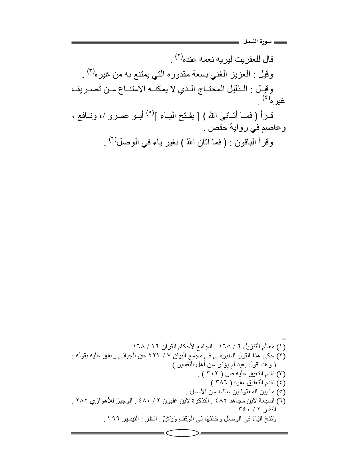 وقرأ الباقون (فَمَا آتَانِ اللَّهُ) بغير ياء في الوصل.