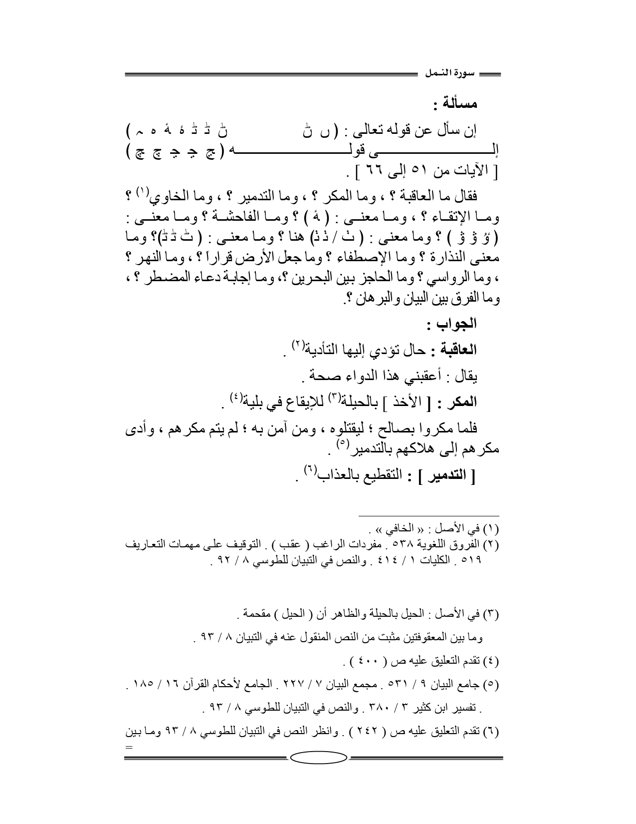 فقال ما العاقبة؟ ، وما المكر؟ ، وما التدمير؟ ، وما الخاوي