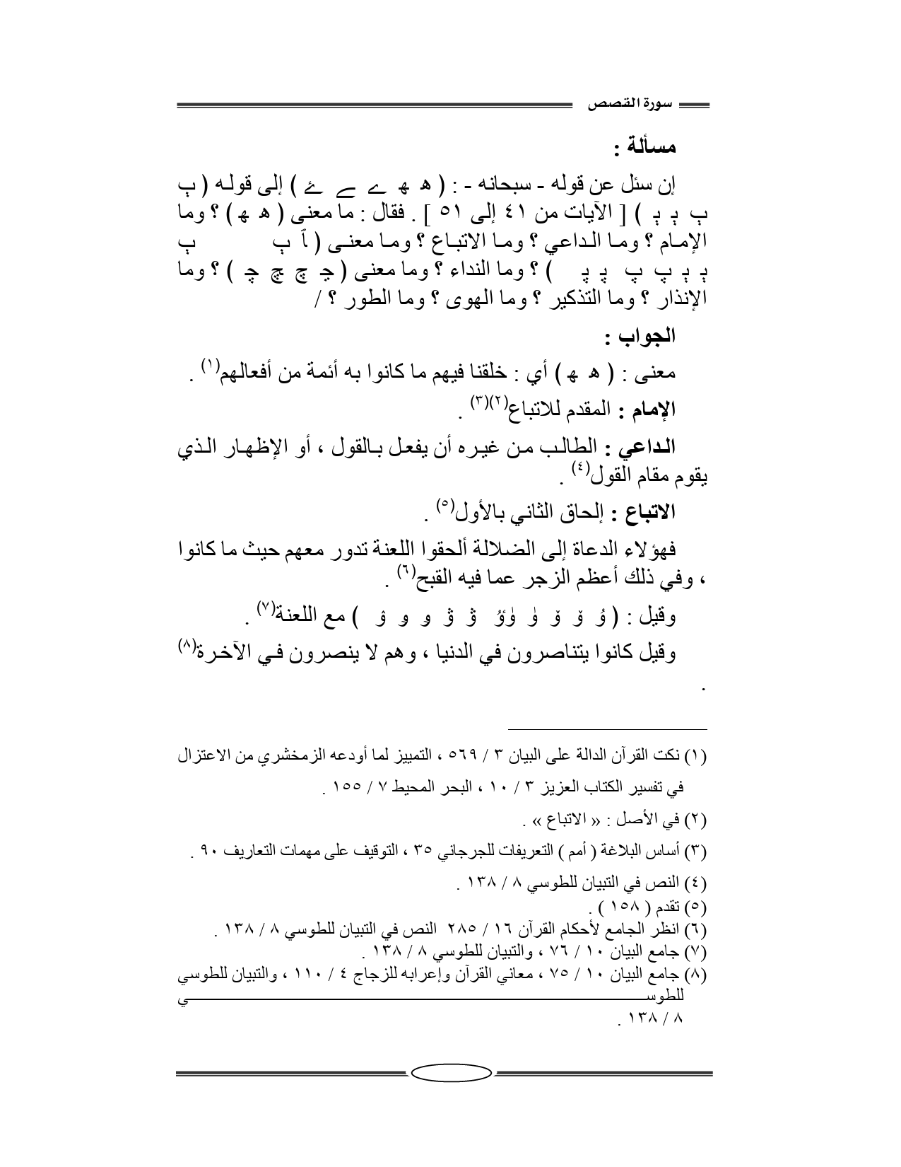 إن سئل عن قوله - سبحانه -: {وَجَعَلْنَاهُمْ أَئِمَّةً يَدْعُونَ إِلَى النَّارِ وَيَوْمَ الْقِيَامَةِ لَا يُنْصَرُونَ (41) وَأَتْبَعْنَاهُمْ فِي هَذِهِ الدُّنْيَا لَعْنَةً وَيَوْمَ الْقِيَامَةِ هُمْ مِنَ الْمَقْبُوحِينَ (42) وَلَقَدْ آتَيْنَا مُوسَى الْكِتَابَ مِنْ بَعْدِ مَا أَهْلَكْنَا الْقُرُونَ الْأُولَى بَصَائِرَ لِلنَّاسِ وَهُدًى وَرَحْمَةً لَعَلَّهُمْ يَتَذَكَّرُونَ (43) وَمَا كُنْتَ بِجَانِبِ الْغَرْبِيِّ إِذْ قَضَيْنَا إِلَى مُوسَى الْأَمْرَ وَمَا كُنْتَ مِنَ الشَّاهِدِينَ (44) وَلَكِنَّا أَنْشَأْنَا قُرُونًا فَتَطَاوَلَ عَلَيْهِمُ الْعُمُرُ وَمَا كُنْتَ ثَاوِيًا فِي أَهْلِ مَدْيَنَ تَتْلُو عَلَيْهِمْ آيَاتِنَا وَلَكِنَّا كُنَّا مُرْسِلِينَ (45) وَمَا كُنْتَ بِجَانِبِ الطُّورِ إِذْ نَادَيْنَا وَلَكِنْ رَحْمَةً مِنْ رَبِّكَ لِتُنْذِرَ قَوْمًا مَا أَتَاهُمْ مِنْ نَذِيرٍ مِنْ قَبْلِكَ لَعَلَّهُمْ يَتَذَكَّرُونَ (46) وَلَوْلَا أَنْ تُصِيبَهُمْ مُصِيبَةٌ بِمَا قَدَّمَتْ أَيْدِيهِمْ فَيَقُولُوا رَبَّنَا لَوْلَا أَرْسَلْتَ إِلَيْنَا رَسُولًا فَنَتَّبِعَ آيَاتِكَ وَنَكُونَ مِنَ الْمُؤْمِنِينَ (47) فَلَمَّا جَاءَهُمُ الْحَقُّ مِنْ عِنْدِنَا قَالُوا لَوْلَا أُوتِيَ مِثْلَ مَا أُوتِيَ مُوسَى أَوَلَمْ يَكْفُرُوا بِمَا أُوتِيَ مُوسَى مِنْ قَبْلُ قَالُوا سِحْرَانِ تَظَاهَرَا وَقَالُوا إِنَّا بِكُلٍّ كَافِرُونَ (48) قُلْ فَأْتُوا بِكِتَابٍ مِنْ عِنْدِ اللَّهِ هُوَ أَهْدَى مِنْهُمَا أَتَّبِعْهُ إِنْ كُنْتُمْ صَادِقِينَ (49) فَإِنْ لَمْ يَسْتَجِيبُوا لَكَ فَاعْلَمْ أَنَّمَا يَتَّبِعُونَ أَهْوَاءَهُمْ وَمَنْ أَضَلُّ مِمَّنِ اتَّبَعَ هَوَاهُ بِغَيْرِ هُدًى مِنَ اللَّهِ إِنَّ اللَّهَ لَا يَهْدِي الْقَوْمَ الظَّالِمِينَ (50) }