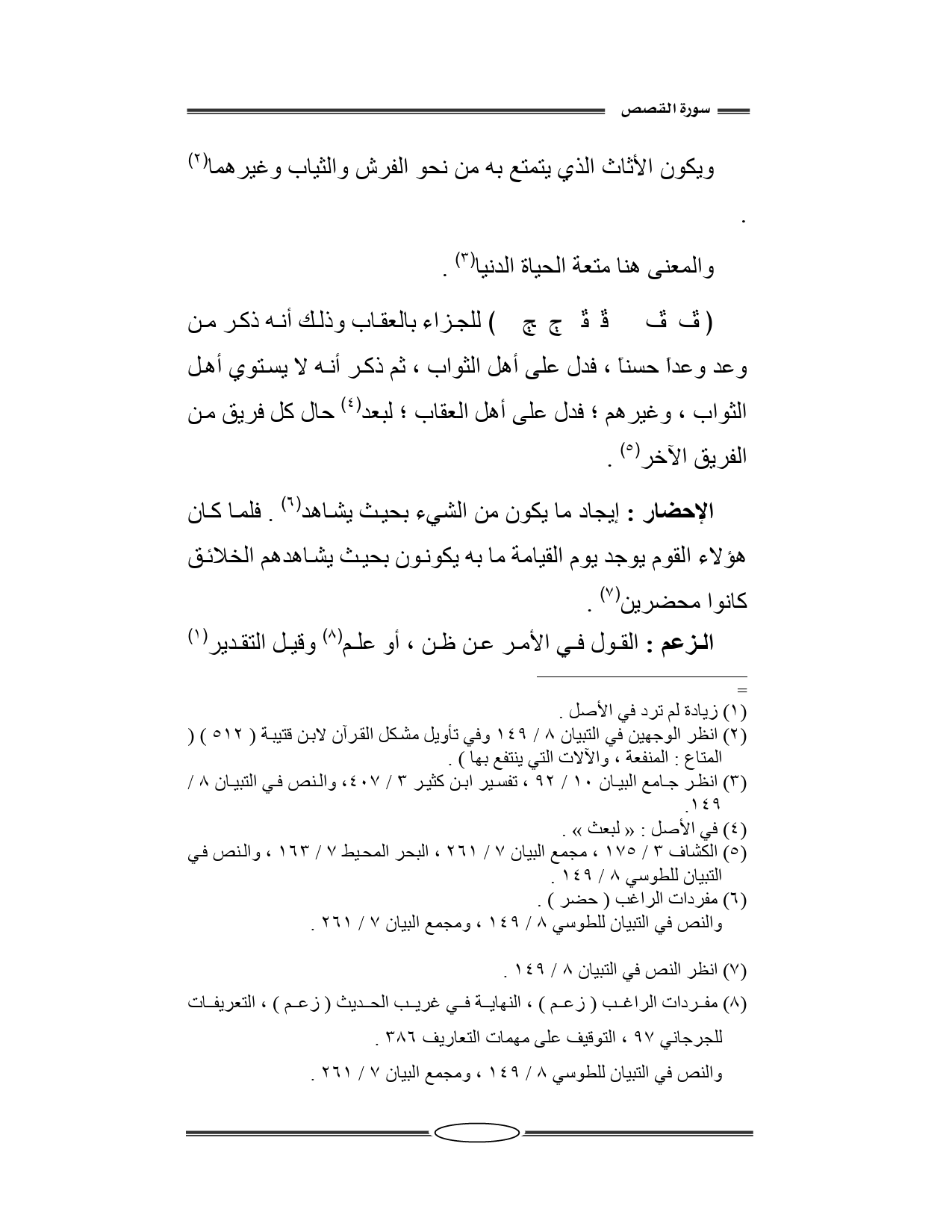 للجزاء بالعقاب وذلك أنه ذكر من وعد وعداً حسناً، فدل على أهل الثواب، ثم ذكر أنه لا يستوي أهل الثواب، وغيرهم؛ فدل على أهل العقاب؛ لبعد حال كل فريق من الفريق الآخر.