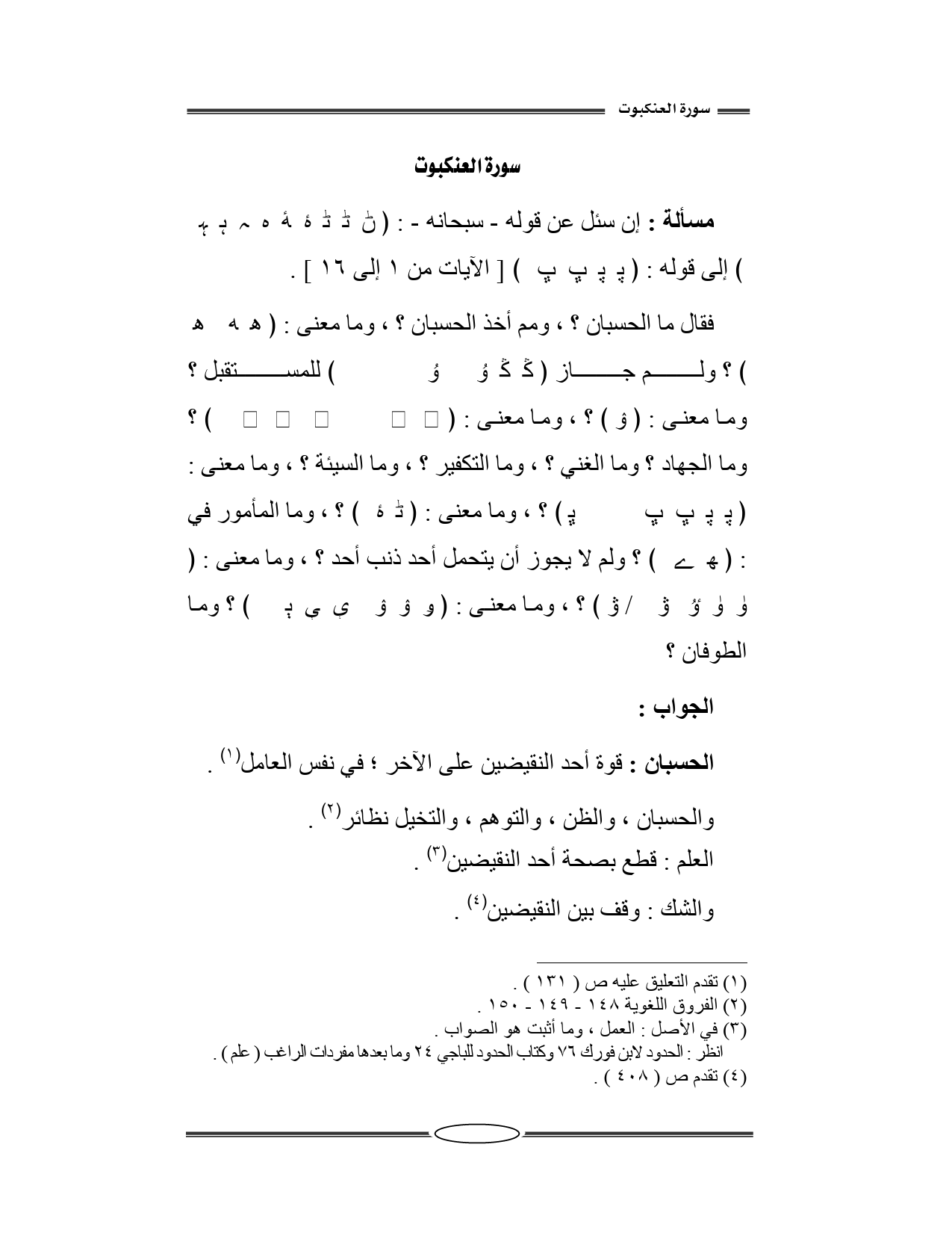 وما معنى: {أَمْ حَسِبَ الَّذِينَ يَعْمَلُونَ السَّيِّئَاتِ أَنْ يَسْبِقُونَا} ؟ ، وما معنى: {لِقَاءَ اللَّهِ} ؟ وما الجهاد؟ وما الغني؟ ، وما التكفير؟ ، وما السيئة؟ ، وما معنى {وَلَنَجْزِيَنَّهُمْ أَحْسَنَ الَّذِي كَانُوا يَعْمَلُونَ} ؟ ، وما معنى: {وَلَيَعْلَمَنَّ الْمُنَافِقِينَ} ؟ ، وما المأمور في {وَلْنَحْمِلْ} ؟ ولم لا يجوز أن يتحمل أحد ذنب أحد؟ ، وما معنى: {وَلَيَحْمِلُنَّ أَثْقَالَهُمْ وَأَثْقَالًا مَعَ أَثْقَالِهِمْ} ؟ ،