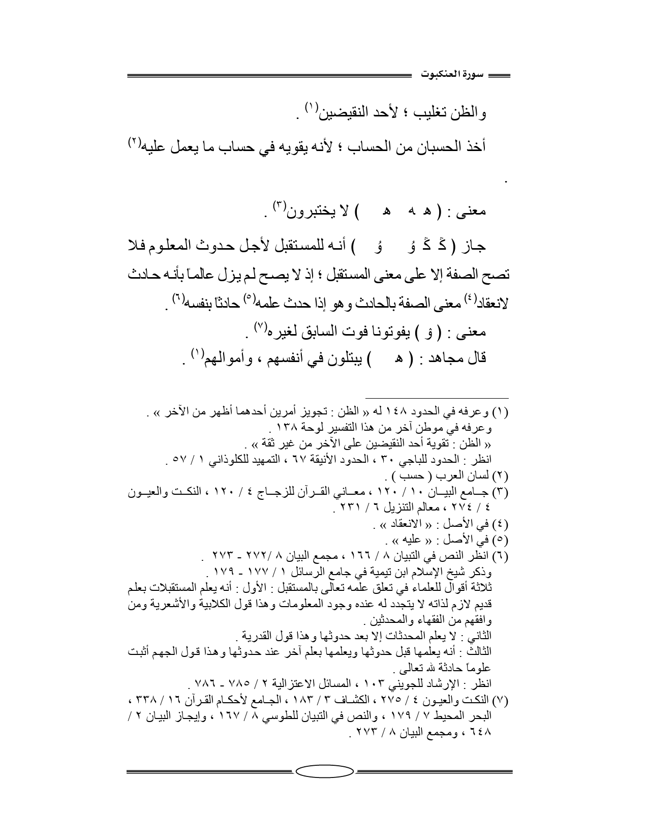 والظن تغليب؛ لأحد النقيضين أخذ الحسبان من الحساب؛ لأنه يقويه في حساب ما يعمل عليه.