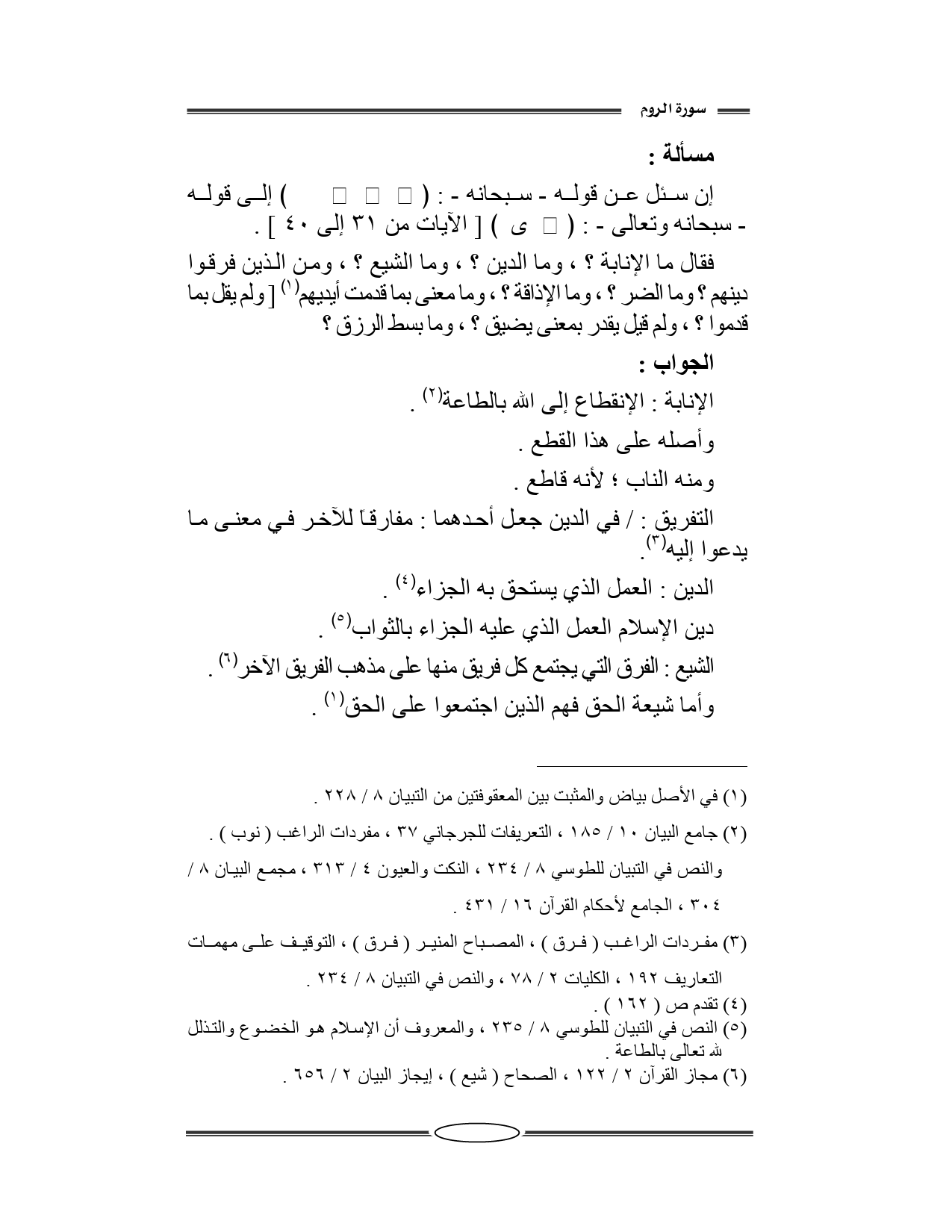 إن سئل عن قوله - سبحانه -: {مُنِيبِينَ إِلَيْهِ وَاتَّقُوهُ وَأَقِيمُوا الصَّلَاةَ وَلَا تَكُونُوا مِنَ الْمُشْرِكِينَ (31) مِنَ الَّذِينَ فَرَّقُوا دِينَهُمْ وَكَانُوا شِيَعًا كُلُّ حِزْبٍ بِمَا لَدَيْهِمْ فَرِحُونَ (32) وَإِذَا مَسَّ النَّاسَ ضُرٌّ دَعَوْا رَبَّهُمْ مُنِيبِينَ إِلَيْهِ ثُمَّ إِذَا أَذَاقَهُمْ مِنْهُ رَحْمَةً إِذَا فَرِيقٌ مِنْهُمْ بِرَبِّهِمْ يُشْرِكُونَ (33) لِيَكْفُرُوا بِمَا آتَيْنَاهُمْ فَتَمَتَّعُوا فَسَوْفَ تَعْلَمُونَ (34) أَمْ أَنْزَلْنَا عَلَيْهِمْ سُلْطَانًا فَهُوَ يَتَكَلَّمُ بِمَا كَانُوا بِهِ يُشْرِكُونَ (35) وَإِذَا أَذَقْنَا النَّاسَ رَحْمَةً فَرِحُوا بِهَا وَإِنْ تُصِبْهُمْ سَيِّئَةٌ بِمَا قَدَّمَتْ أَيْدِيهِمْ إِذَا هُمْ يَقْنَطُونَ (36) أَوَلَمْ يَرَوْا أَنَّ اللَّهَ يَبْسُطُ الرِّزْقَ لِمَنْ يَشَاءُ وَيَقْدِرُ إِنَّ فِي ذَلِكَ لَآيَاتٍ لِقَوْمٍ يُؤْمِنُونَ (37) فَآتِ ذَا الْقُرْبَى حَقَّهُ وَالْمِسْكِينَ وَابْنَ السَّبِيلِ ذَلِكَ خَيْرٌ لِلَّذِينَ يُرِيدُونَ وَجْهَ اللَّهِ وَأُولَئِكَ هُمُ الْمُفْلِحُونَ (38) وَمَا آتَيْتُمْ مِنْ رِبًا لِيَرْبُوَ فِي أَمْوَالِ النَّاسِ فَلَا يَرْبُو عِنْدَ اللَّهِ وَمَا آتَيْتُمْ مِنْ زَكَاةٍ تُرِيدُونَ وَجْهَ اللَّهِ فَأُولَئِكَ هُمُ الْمُضْعِفُونَ (39) اللَّهُ الَّذِي خَلَقَكُمْ ثُمَّ رَزَقَكُمْ ثُمَّ يُمِيتُكُمْ ثُمَّ يُحْيِيكُمْ هَلْ مِنْ شُرَكَائِكُمْ مَنْ يَفْعَلُ مِنْ ذَلِكُمْ مِنْ شَيْءٍ سُبْحَانَهُ وَتَعَالَى عَمَّا يُشْرِكُونَ (40) }