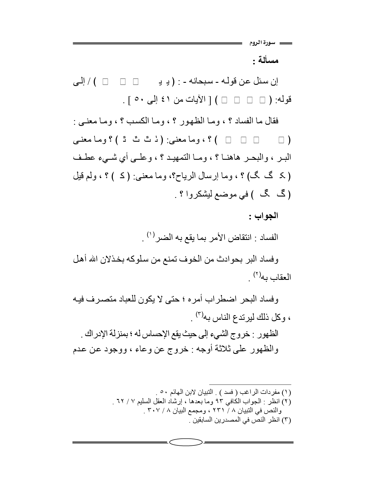 فقال ما الفساد؟ ، وما الظهور؟ ، وما الكسب؟ ، وما معنى: {لِيُذِيقَهُمْ بَعْضَ الَّذِي عَمِلُوا} ؟ ، وما معنى: {فَأَقِمْ وَجْهَكَ لِلدِّينِ الْقَيِّمِ} ؟ وما معنى: البر، والبحر هاهنا؟ ، وما التمهيد؟ ، وعلى أي شيء عطف {وَلِيُذِيقَكُمْ مِنْ رَحْمَتِهِ} ؟ ، وما إرسال الرياح؟ ، وما معنى: {يَوْمَئِذٍ يَصَّدَّعُونَ} ؟ ،