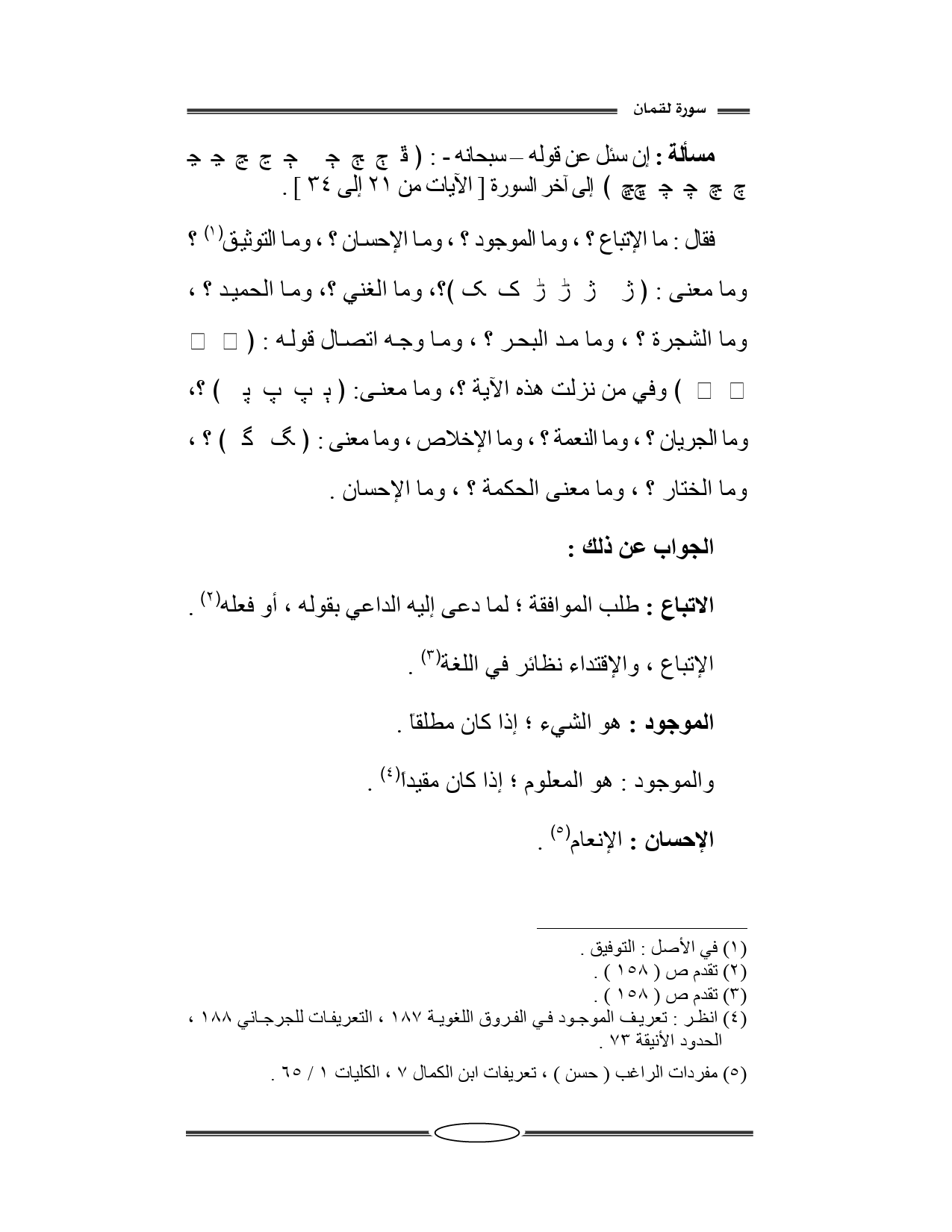 فقال: ما الإتباع؟ ، وما الموجود؟ ، وما الإحسان؟ ، وما التوثيق