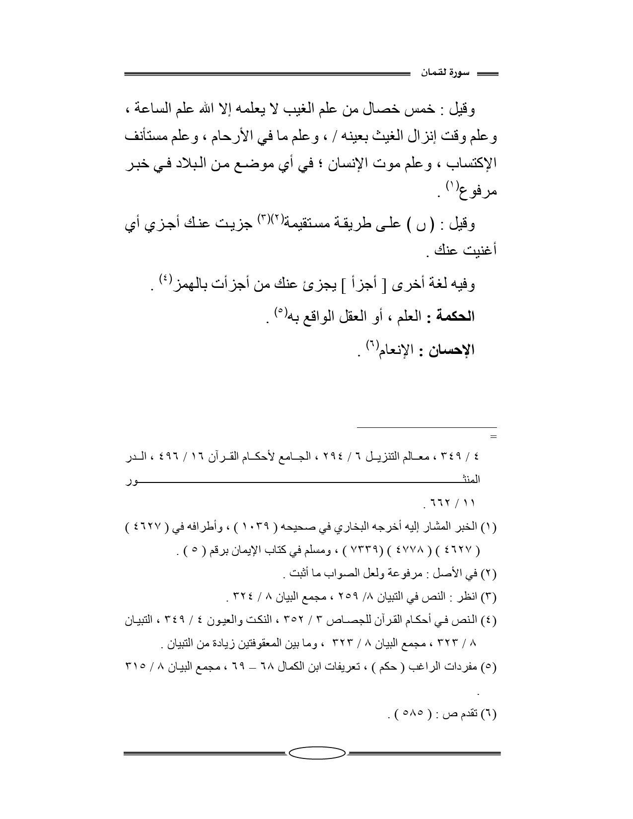 وقيل: خمس خصال من علم الغيب لا يعلمه إلا الله علم الساعة،