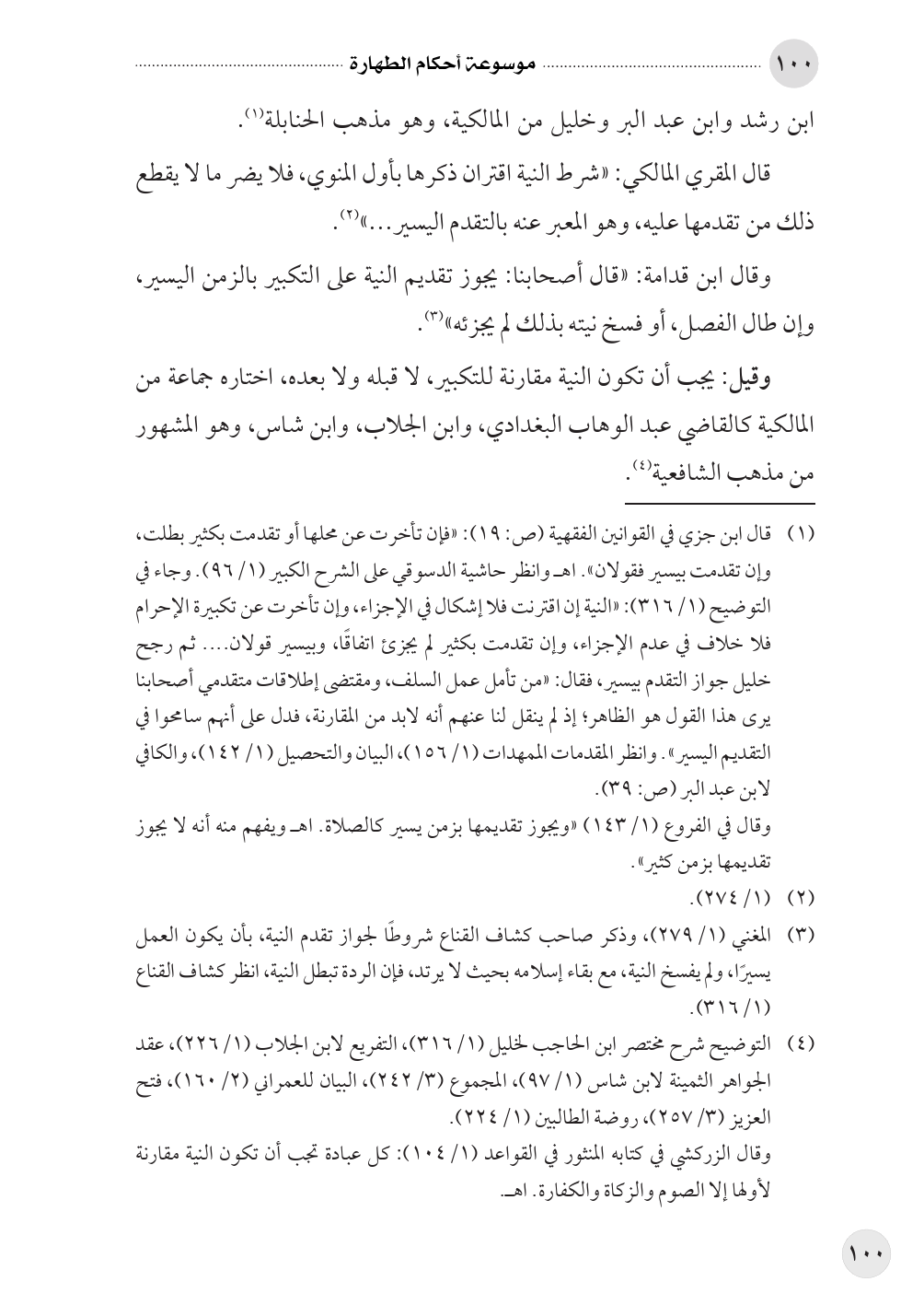 (¬١) قال ابن جزي في القوانين الفقهية (ص: ١٩): «فإن تأخرت عن محلها أو تقدمت بكثير بطلت، وإن تقدمت بيسير فقولان». اهـ وانظر حاشية الدسوقي على الشرح الكبير (١/ ٩٦). وجاء في التوضيح (١/ ٣١٦): «النية إن اقترنت فلا إشكال في الإجزاء، وإن تأخرت عن تكبيرة الإحرام فلا خلاف في عدم الإجزاء، وإن تقدمت بكثير لم يجزئ اتفاقًا، وبيسير قولان .... ثم رجح خليل جواز التقدم بيسير، فقال: «من تأمل عمل السلف، ومقتضى إطلاقات متقدمي أصحابنا يرى هذا القول هو الظاهر؛ إذ لم ينقل لنا عنهم أنه لابد من المقارنة، فدل على أنهم سامحوا في التقديم اليسير». وانظر المقدمات الممهدات (١/ ١٥٦)، البيان والتحصيل (١/ ١٤٢)، والكافي ... لابن عبد البر (ص: ٣٩).