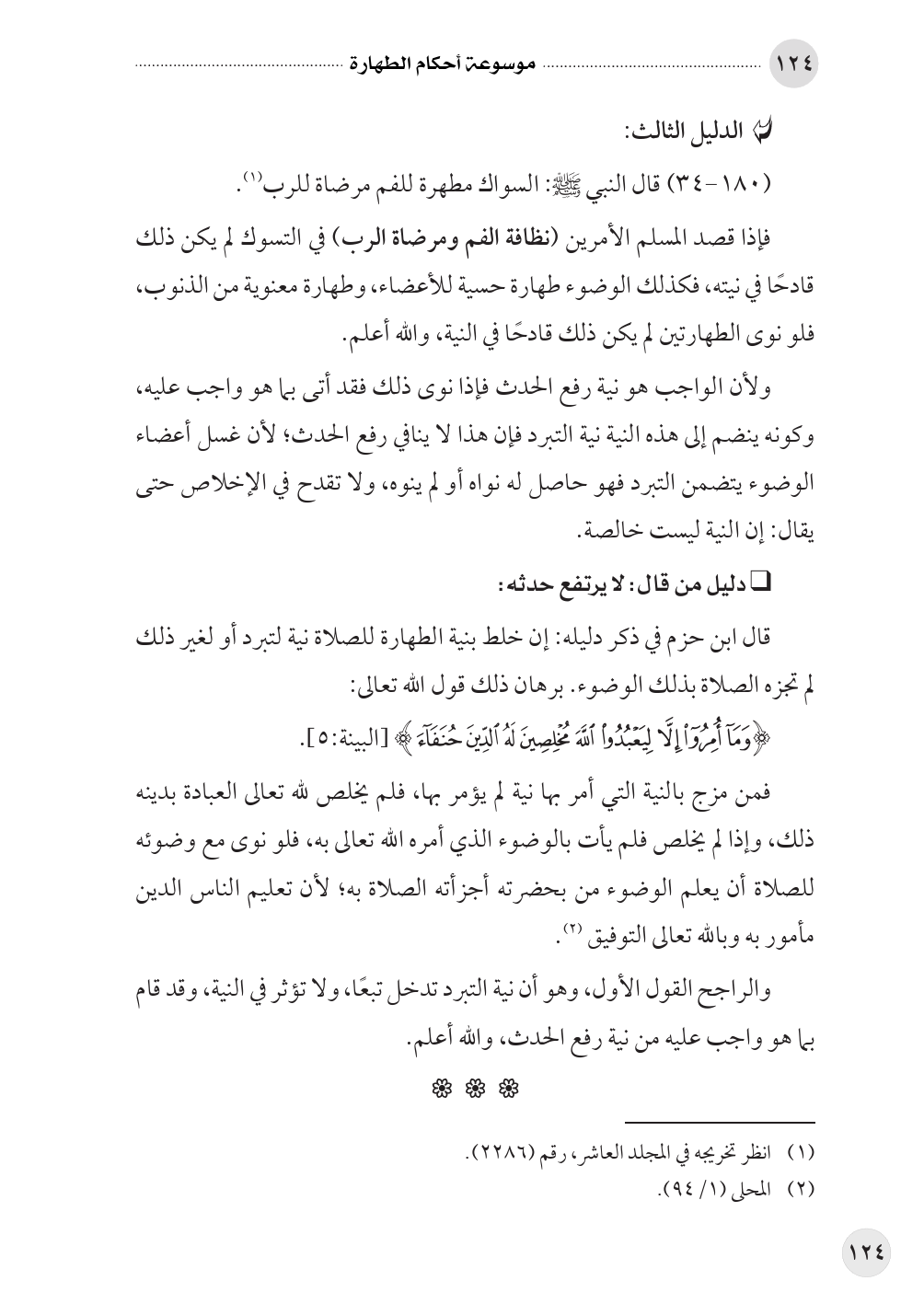 قال ابن حزم في ذكر دليله: إن خلط بنية الطهارة للصلاة نية لتبرد أو لغير ذلك لم تجزه الصلاة بذلك الوضوء. برهان ذلك قول الله تعالى: