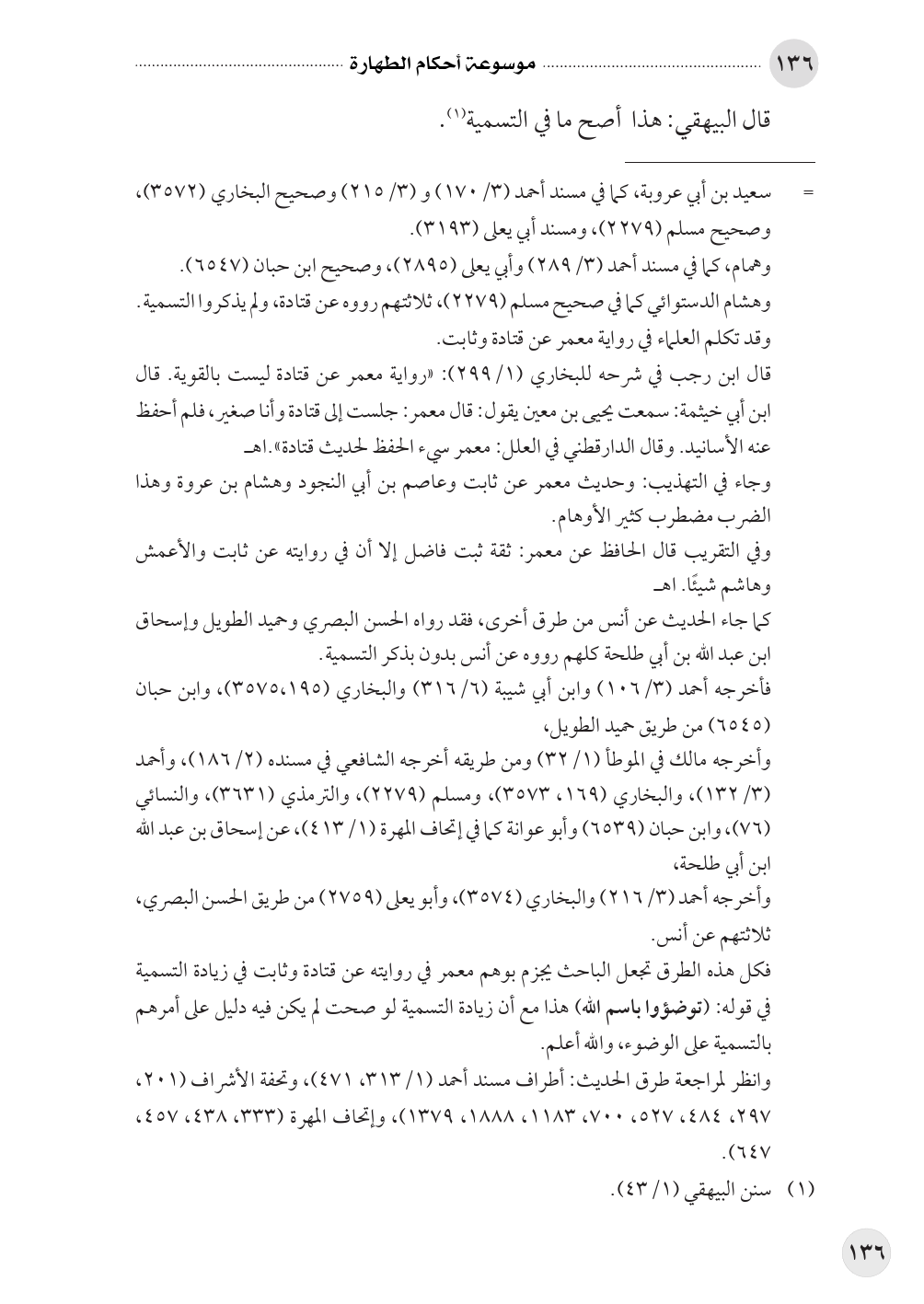 فكل هذه الطرق تجعل الباحث يجزم بوهم معمر في روايته عن قتادة وثابت في زيادة التسمية في قوله: (توضؤوا باسم الله) هذا مع أن زيادة التسمية لو صحت لم يكن فيه دليل على أمرهم بالتسمية على الوضوء، والله أعلم.
