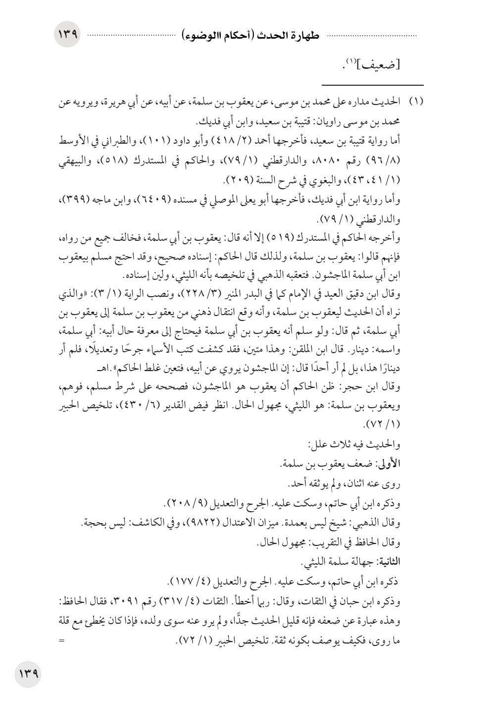 وأخرجه الحاكم في المستدرك (٥١٩) إلا أنه قال: يعقوب بن أبي سلمة، فخالف جميع من رواه، فإنهم قالوا: يعقوب بن سلمة، ولذلك قال الحاكم: إسناده صحيح، وقد احتج مسلم بيعقوب ابن أبي سلمة الماجشون. فتعقبه الذهبي في تلخيصه بأنه الليثي، ولين إسناده.