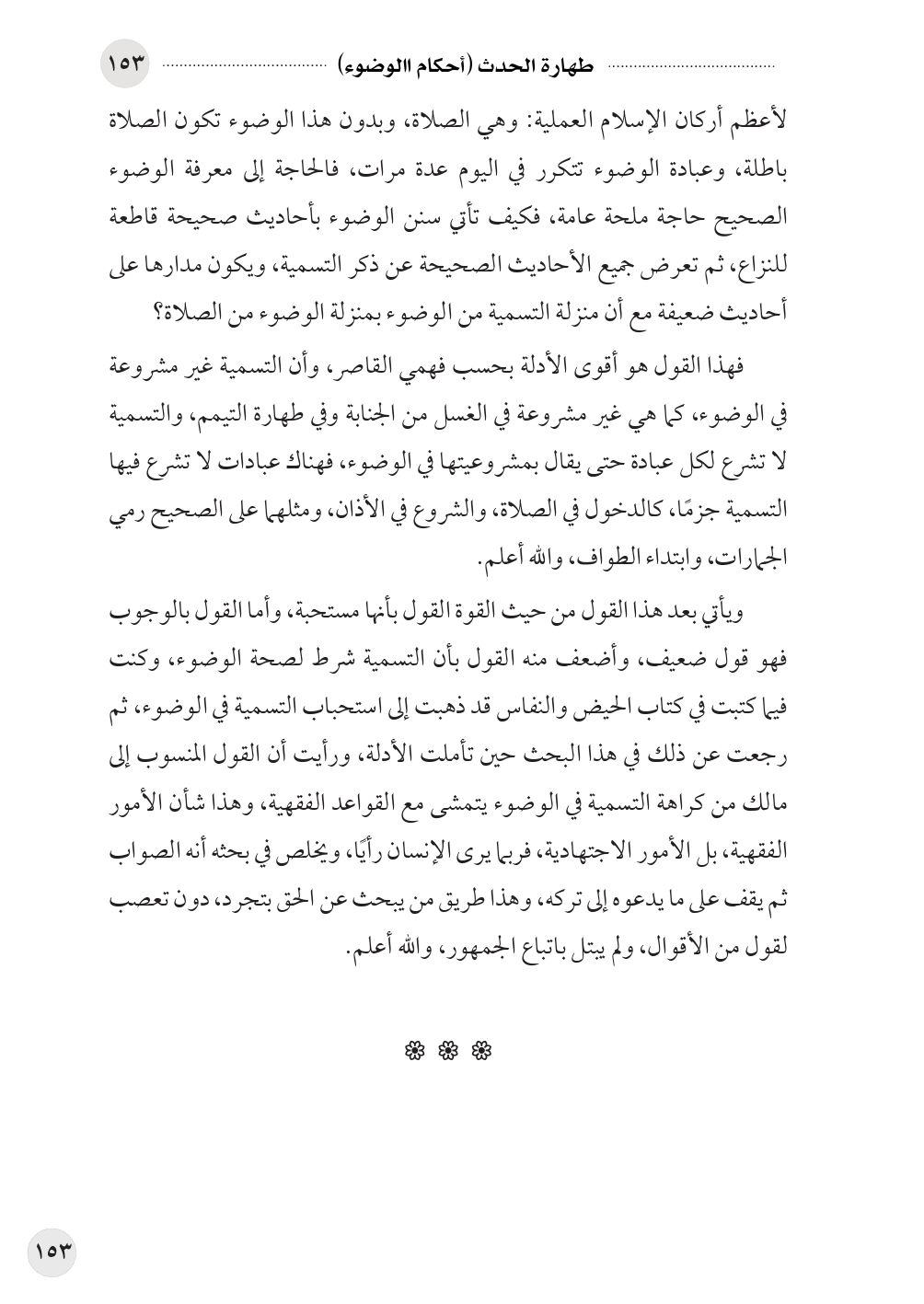 ويأتي بعد هذا القول من حيث القوة القول بأنها مستحبة، وأما القول بالوجوب فهو قول ضعيف، وأضعف منه القول بأن التسمية شرط لصحة الوضوء، وكنت فيما كتبت في كتاب الحيض والنفاس قد ذهبت إلى استحباب التسمية في الوضوء، ثم رجعت عن ذلك في هذا البحث حين تأملت الأدلة، ورأيت أن القول المنسوب إلى مالك من كراهة التسمية في الوضوء يتمشى مع القواعد الفقهية، وهذا شأن الأمور الفقهية، بل الأمور الاجتهادية، فربما يرى الإنسان رأيًا، ويخلص في بحثه أنه الصواب ثم يقف على ما يدعوه إلى تركه، وهذا طريق من يبحث عن الحق بتجرد، دون تعصب لقول من الأقوال، ولم يبتل باتباع الجمهور، والله أعلم.