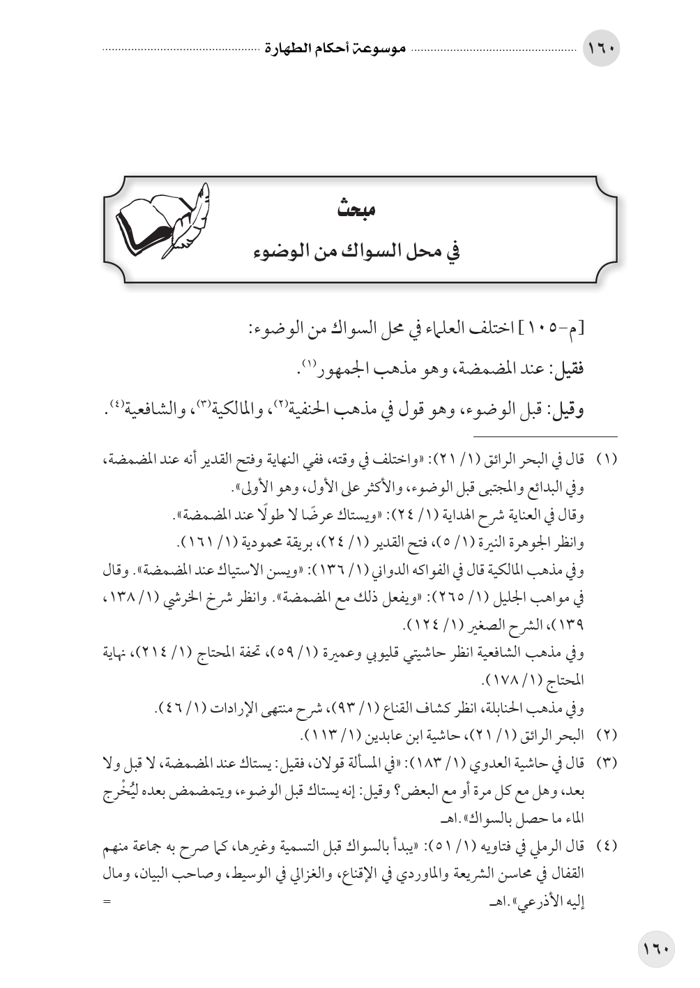 (¬٤) قال الرملي في فتاويه (١/ ٥١): «يبدأ بالسواك قبل التسمية وغيرها، كما صرح به جماعة منهم القفال في محاسن الشريعة والماوردي في الإقناع، والغزالي في الوسيط، وصاحب البيان، ومال إليه الأذرعي».اهـ ...