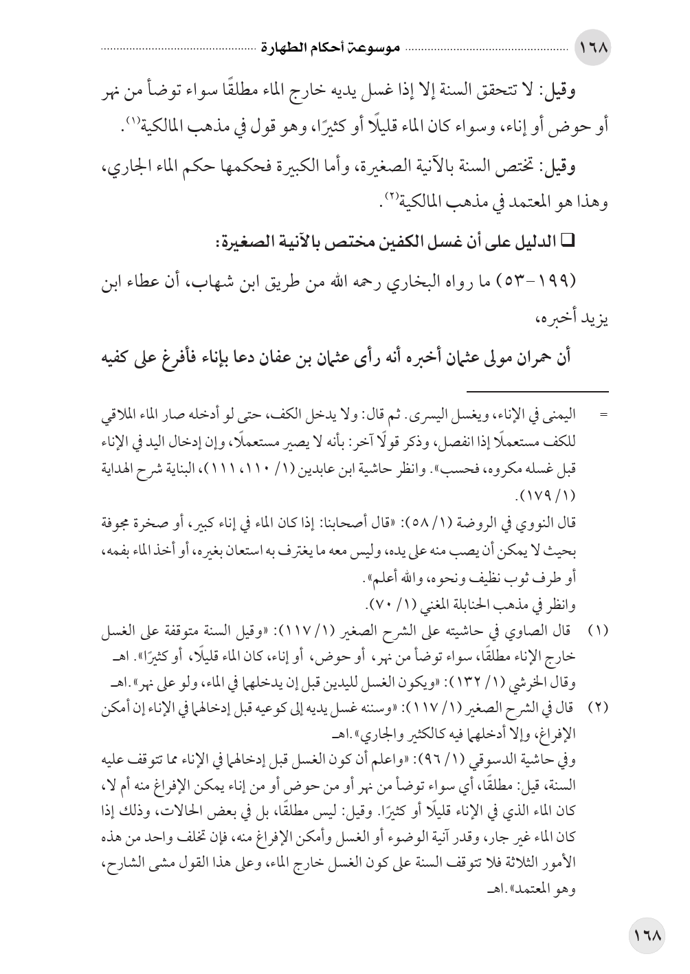 (¬٢) قال في الشرح الصغير (١/ ١١٧): «وسننه غسل يديه إلى كوعيه قبل إدخالهما في الإناء إن أمكن الإفراغ، وإلا أدخلهما فيه كالكثير والجاري».اهـ