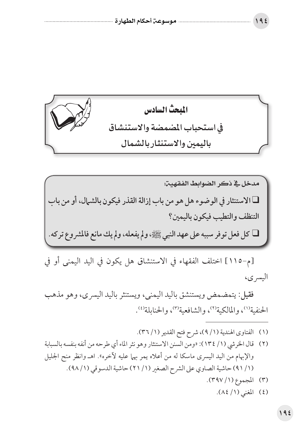 المبحث السادس في استحباب المضمضة والاستنشاق باليمين والاستنثار بالشمال
