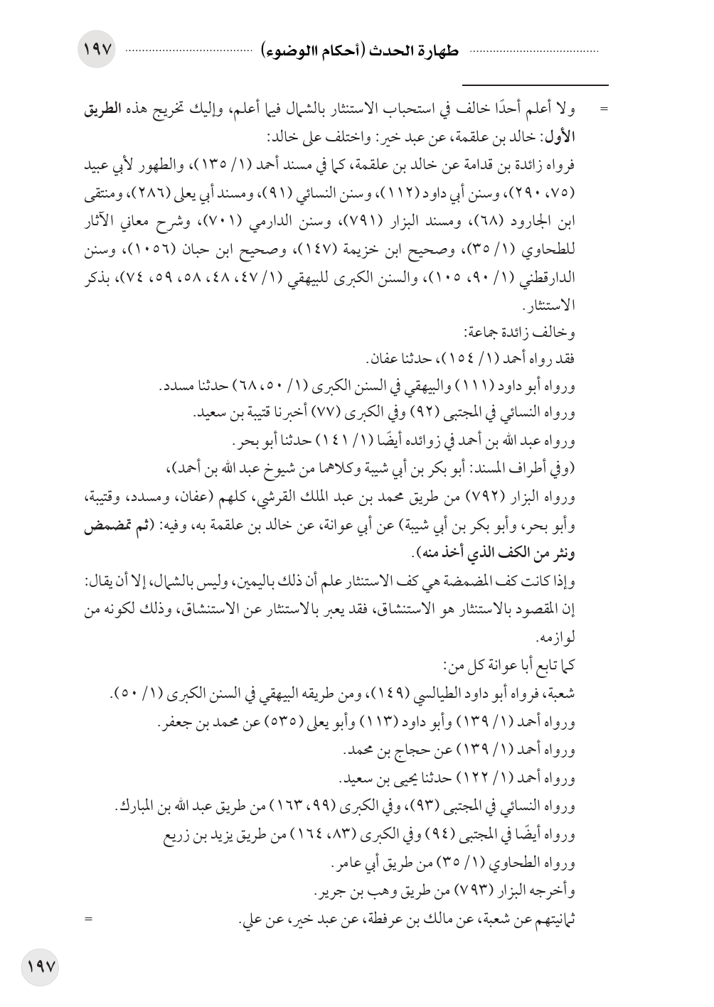 = ولا أعلم أحدًا خالف في استحباب الاستنثار بالشمال فيما أعلم، وإليك تخريج هذه الطريق الأول: خالد بن علقمة، عن عبد خير: واختلف على خالد: