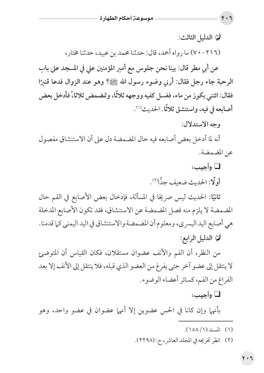 ثانيًا: الحديث ليس صريحًا في المسألة، فإدخال بعض الأصابع في الفم حال المضمضة لا يلزم منه فصل المضمضة عن الاستنشاق، فقد تكون الأصابع المدخلة هي أصابع اليد اليسرى، ومعلوم أن المضمضة والاستنشاق في اليد اليمنى كما قدمنا.