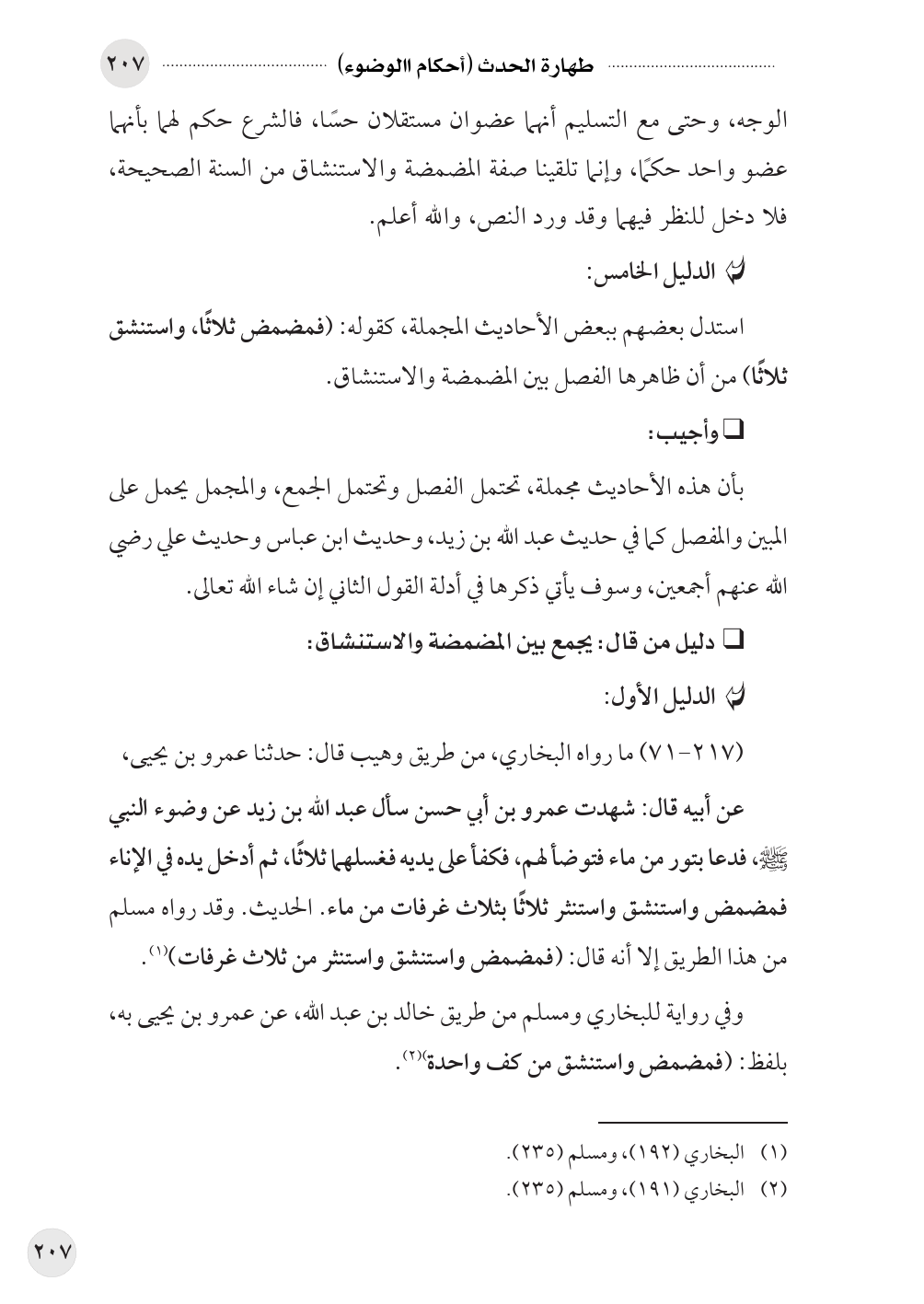 عن أبيه قال: شهدت عمرو بن أبي حسن سأل عبد الله بن زيد عن وضوء النبي صلى الله عليه وسلم، فدعا بتور من ماء فتوضأ لهم، فكفأ على يديه فغسلهما ثلاثًا، ثم أدخل يده في الإناء فمضمض واستنشق واستنثر ثلاثًا بثلاث غرفات من ماء. الحديث. وقد رواه مسلم من هذا الطريق إلا أنه قال: (فمضمض واستنشق واستنثر من ثلاث غرفات) (¬١).