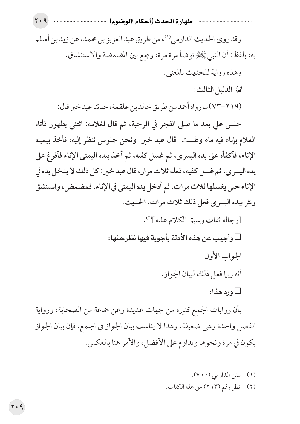 وقد روى الحديث الدارمي (¬١)، من طريق عبد العزيز بن محمد، عن زيد بن أسلم به، بلفظ: أن النبي صلى الله عليه وسلم توضأ مرة مرة، وجمع بين المضمضة والاستنشاق.