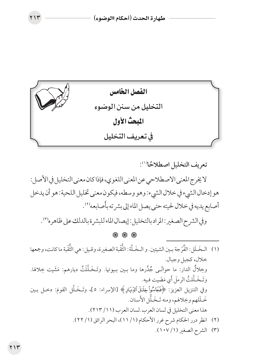 وفي الشرح الصغير: المراد بالتخليل: إيصال الماء للبشرة بالدلك على ظاهره (¬٣).